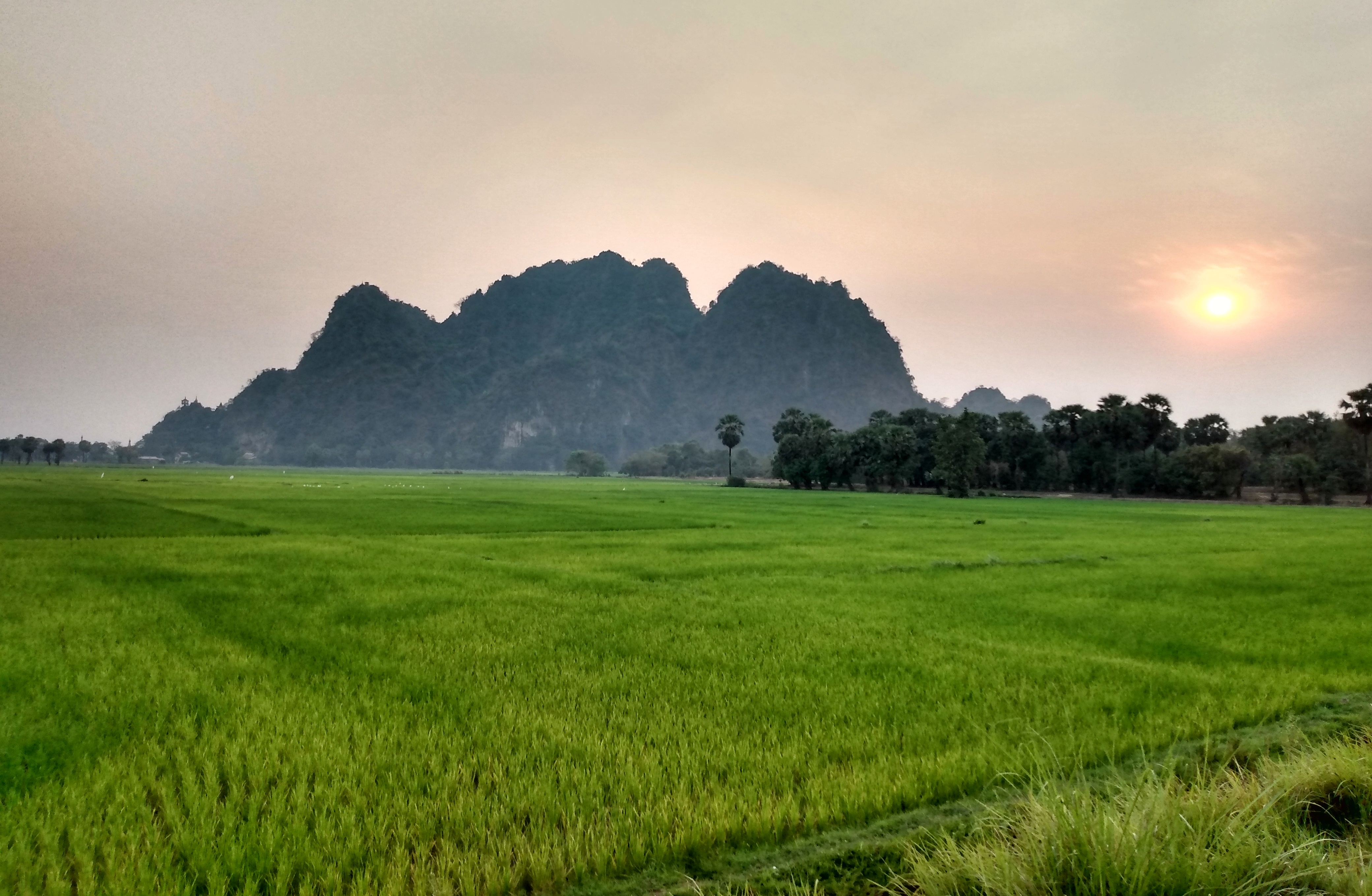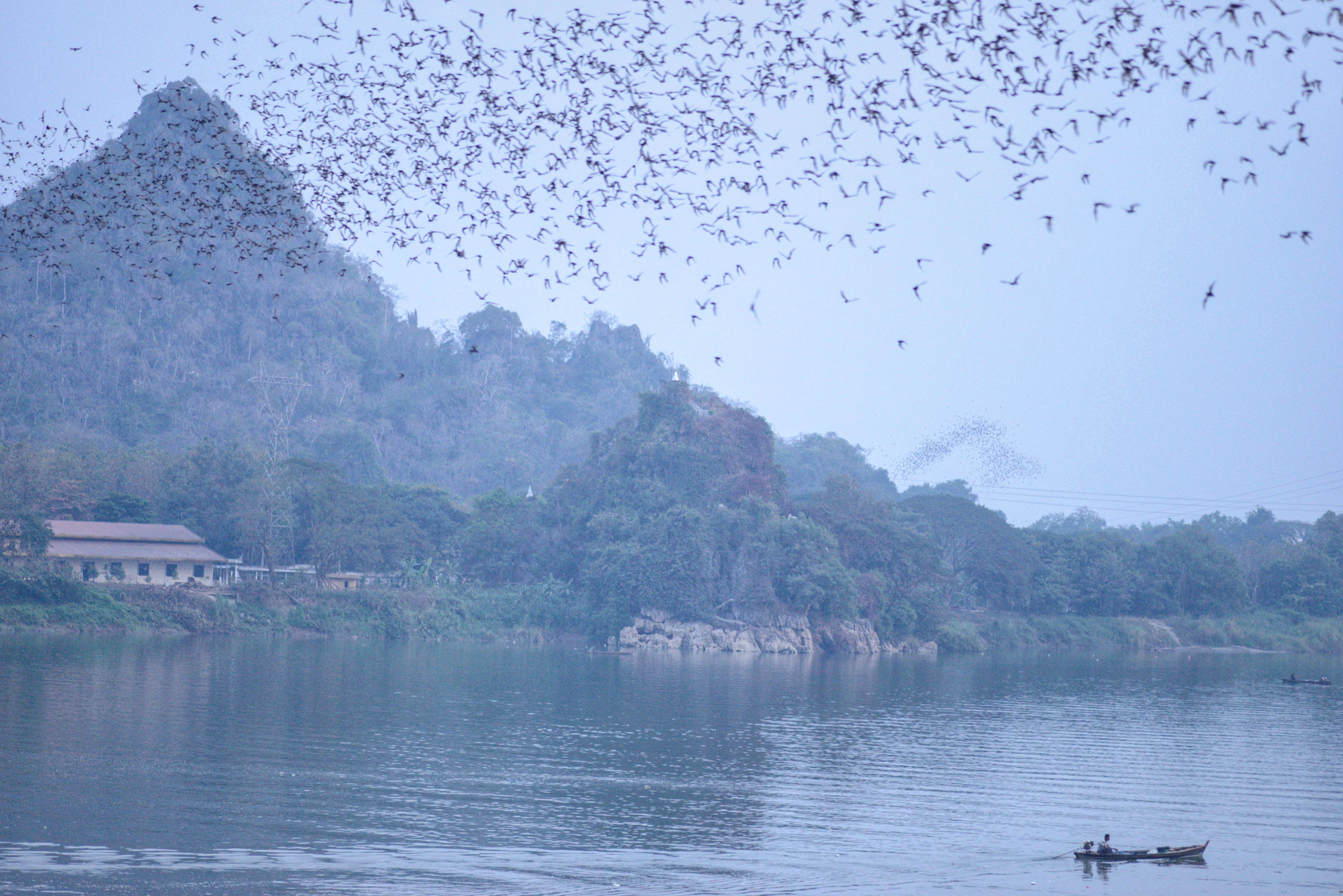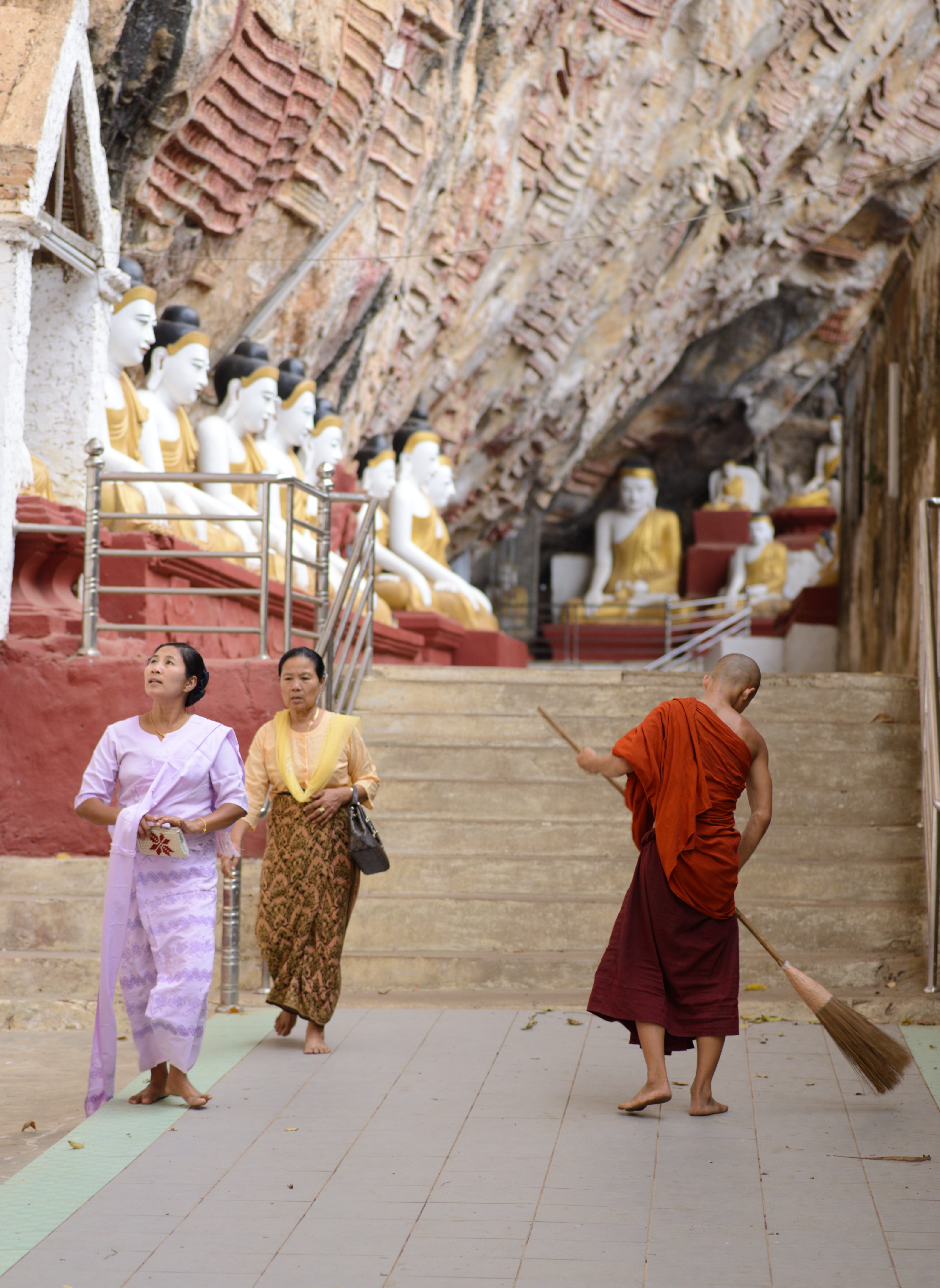 Nachdem wir uns ausgeschlafen hatten gingen wir zur Rezeption, wo uns die freundliche Mitarbeiterin uns einen Roller für die nächsten Tage organisierte. Zwanzig Minuten später war er da und wir fuhren los. Als erstes schauten wir uns die Kawgon-Höhle an. Bemerkenswert waren vor allem die vielen Ornamente am Eingang zur Höhle. Danach ging es weiter zur Yathay Pyan Höhle. Auch hier gab es schöne Ornamente und zahlreiche Buddha-Figuren. Die Höhle ging aber weiter nach hinten und wir konnten – natürlich barfuß – durchlaufen. Auf der anderen Seite gab es eine weitere Öffnung, wo wir einen schönen Ausblick über das Land bekamen. Zum Sonnenuntergang fuhren wir zur Bat Cave und beobachteten ein weiteres mal Millionen von Fledermäuse beim Ausflug aus ihrer Höhle. Diesmal standen wir unmittelbar unterhalb des Höhleneingangs und sahen die Tiere über unseren Köpfen ausfliegen. Allerdings bekamen wir auch den Gestank der Tiere zu spüren. Es war immer noch sehr warm, als wir im Dunklen wieder nach Hause fuhren. In einem kleinen Restaurant unterwegs aßen wir zu Abend. Zum Glück konnte einer der jungen Helfer ein wenig Englisch und so bekamen wir ein leckeres Abendessen.
