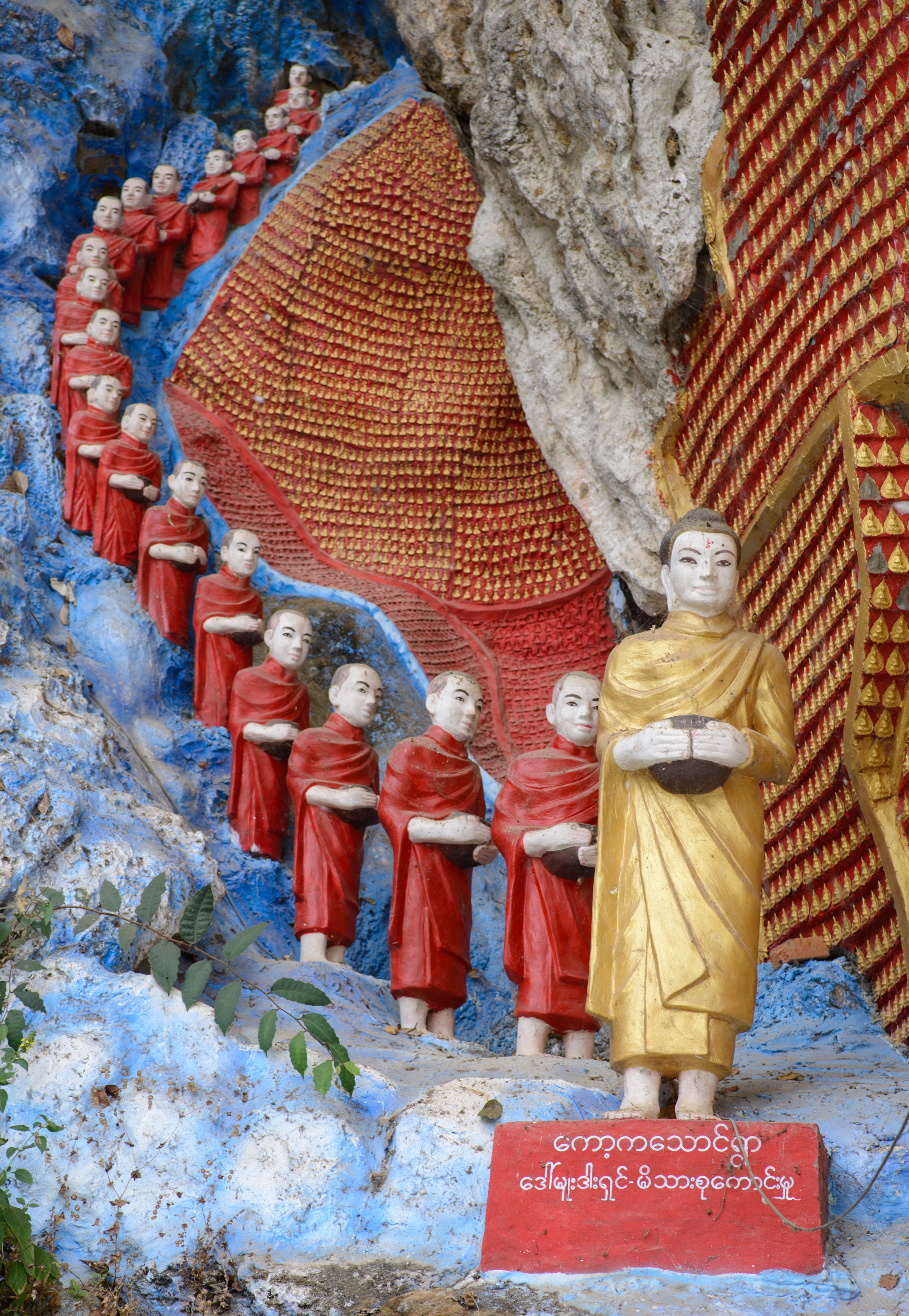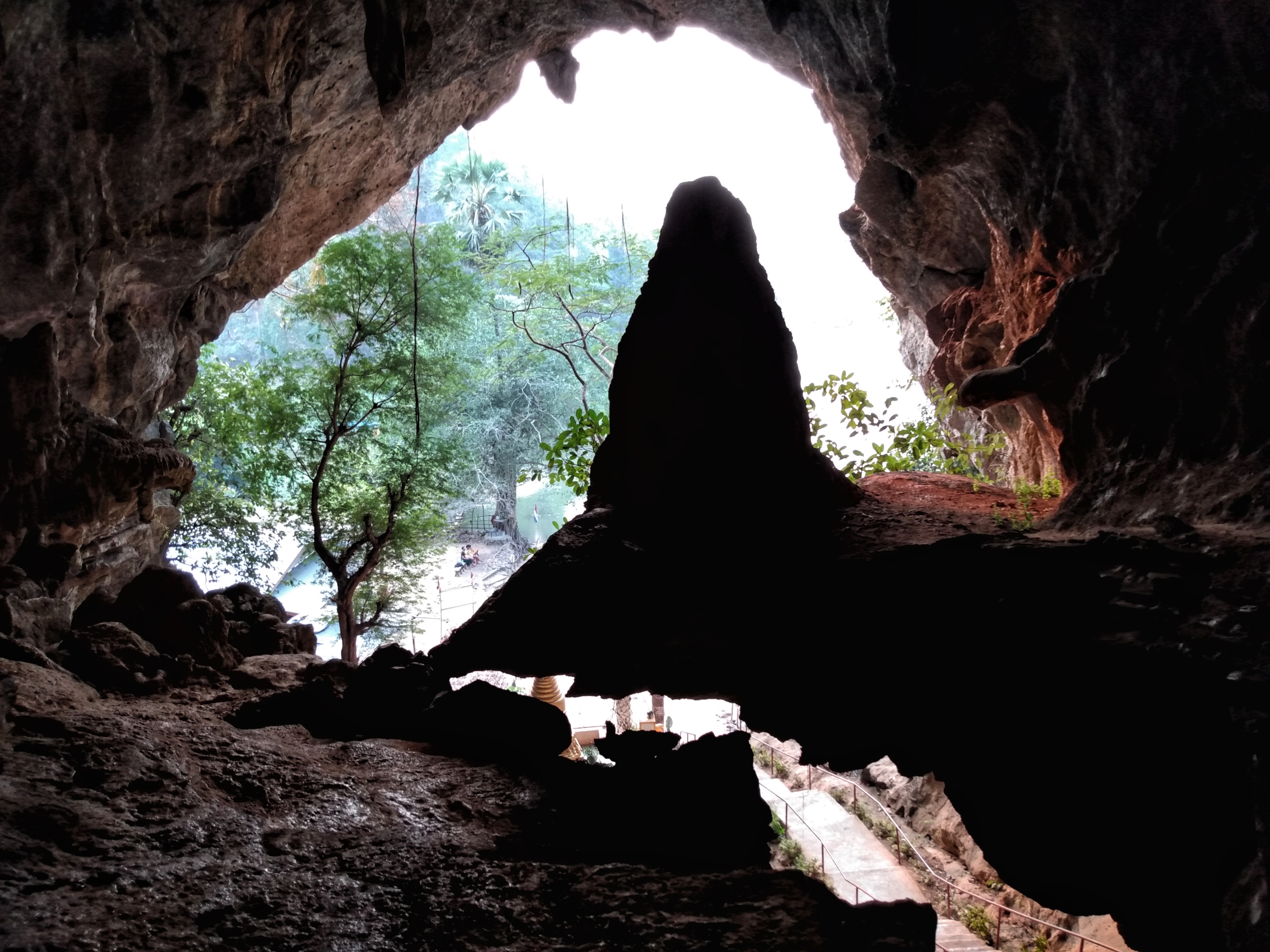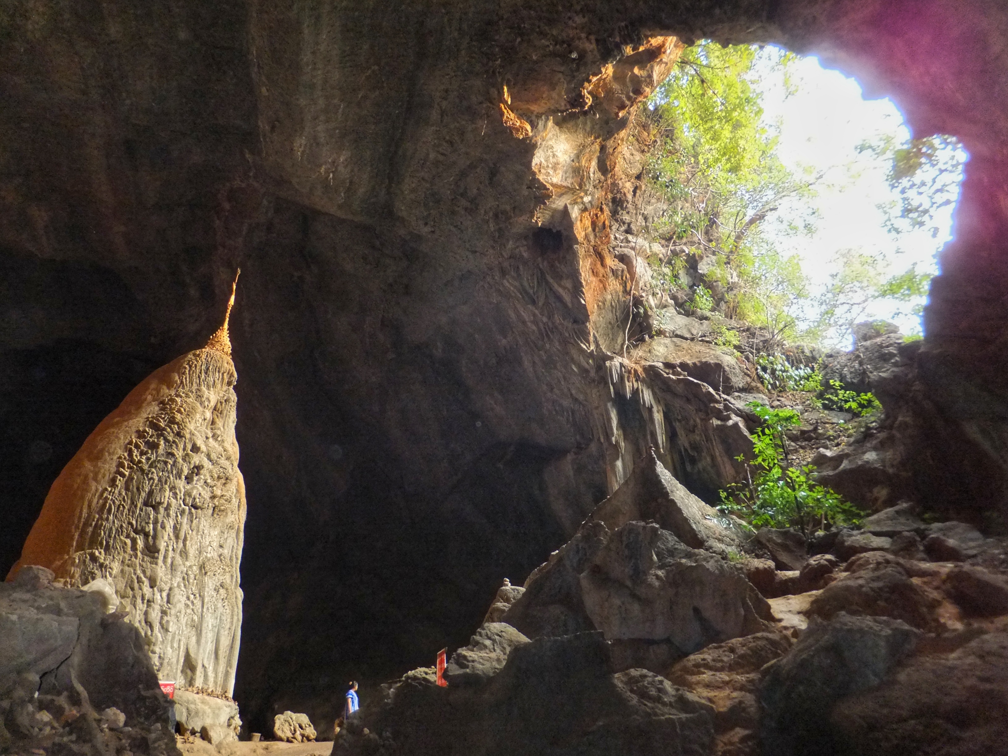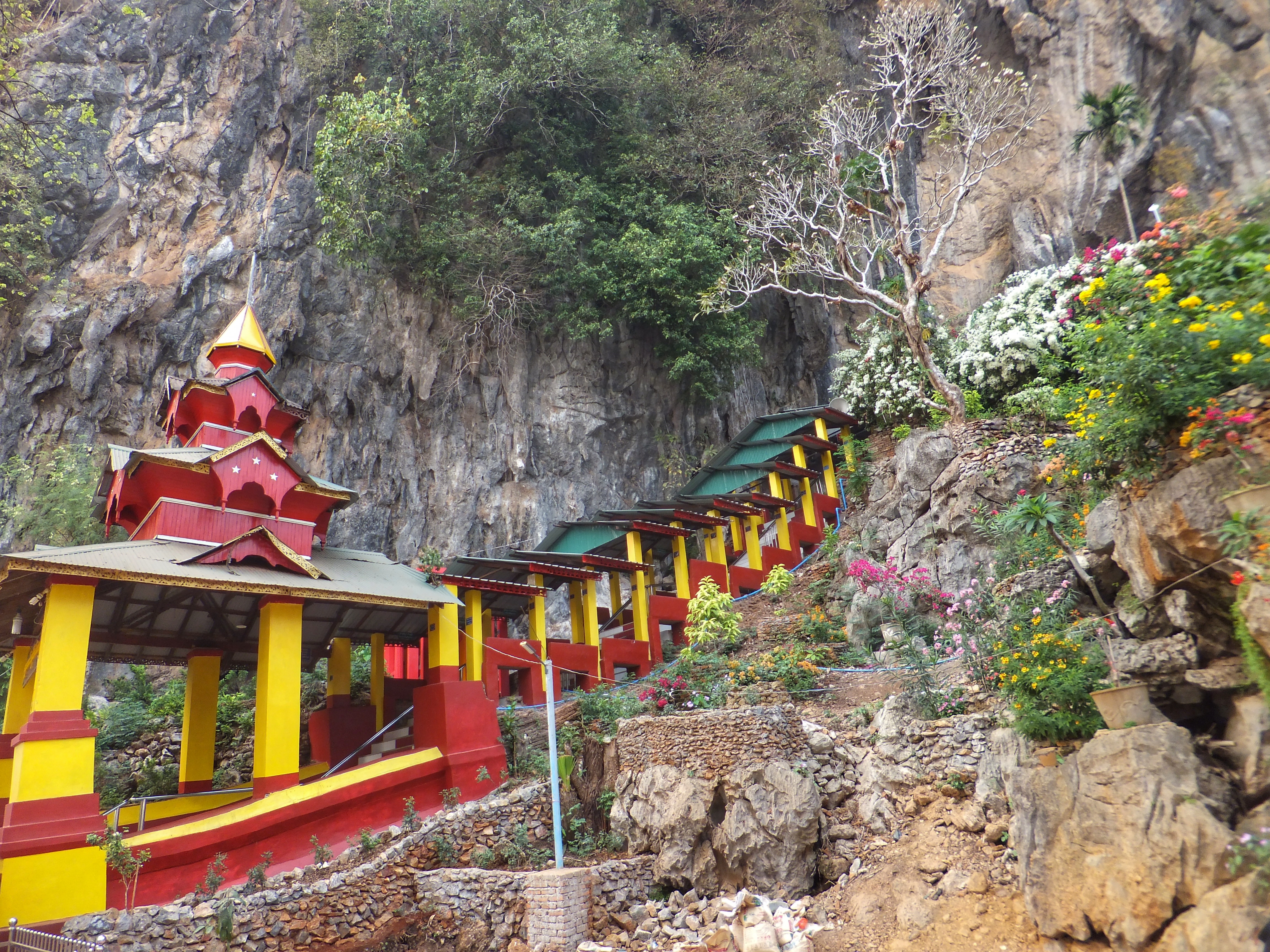 Auch heute fuhren wir mit unserem kleinen Roller. Dass er immer mal wieder ausging hat uns nicht weiter gestört. Wenn er erstmal am laufen war, ging es prima. Als erstes ging es zur Kaw Ka Thaung Cave, einer Höhle, die Mönchen gewidmet schien. Eine lange Prozession von Mönchsfiguren führte zur Höhle und auch im Innern gab es eine lange Reihe solcher Figuren. Aus dem Innern der Höhle bekamen wir eine schönen Blick auf die Landschaft außerhalb. In unmittelbarer Nähe gab es ein kleines Dorf, daß das ursprüngliche Leben zeigen sollte. Da es hier aber bereits ab dem Parkplatz klar war, dass es sich nur um ein „Vorzeigedorf“ handelte fuhren wir weiter und suchten ein bei Google angezeigtes Dorf inmitten des karstigen Waldes. Über schmale Wege, auf denen nur noch unser kleines Motorrad Platz hatte fanden wir es schließlich. Die Menschen dort winkten uns fröhlich zu, wie sie es immer taten, wenn sie uns vorbeifahren sahen. Sie schienen sich tatsächlich zu freuen, dass wir ihr Land besuchten und uns für sie interessierten. Wir fuhren weiter und kamen durch große Reisfelder wo wir auf einer kleinen Brücke ein Pause machten und einer Frau zusahen, die irgendetwas an einem Reisighaufen im Fluss tat. Danach besichtigten wir eine weitere Höhle: die Saddan Cave. Wir waren etwas überrascht, wie weitläufig diese Höhle war. Hinter den Figuren und einem großen Kopf in der Eingangshöhle gab es einen beleuchteten Gang, der durch zahlreiche Höhlen durch den gesamten Berg führte. Dabei kamen wir durch eine große Höhle, die von unzähligen Fledermäusen bewohnt war. Den Geruch und die Geräusche kannten wir bereits von gestern. Auf der anderen Seite warteten Boote darauf, die Besucher über kleine Kanäle zurück zum Eingang zu bringen. Wir nahmen jedoch den Weg durch die Höhle zurück und bewunderten noch einmal die vielen Farben und Formen der Figuren, die sich in den Kalksteinfelsen über die Jahrhunderte gebildet hatten. Die Sonne ging gerade unter als wir uns auf den Weg zurück nach Hpa-An machten. Zwischen den Bergen wurde es deutlich kühler aber als wir wieder das offene Land erreichten, wurde es wieder sehr warm. In Hpa-An besorgten wir uns auf einem Nachtmarkt unser Abendessen, das wir anschließend gemütlich im Hotel verspeisten.