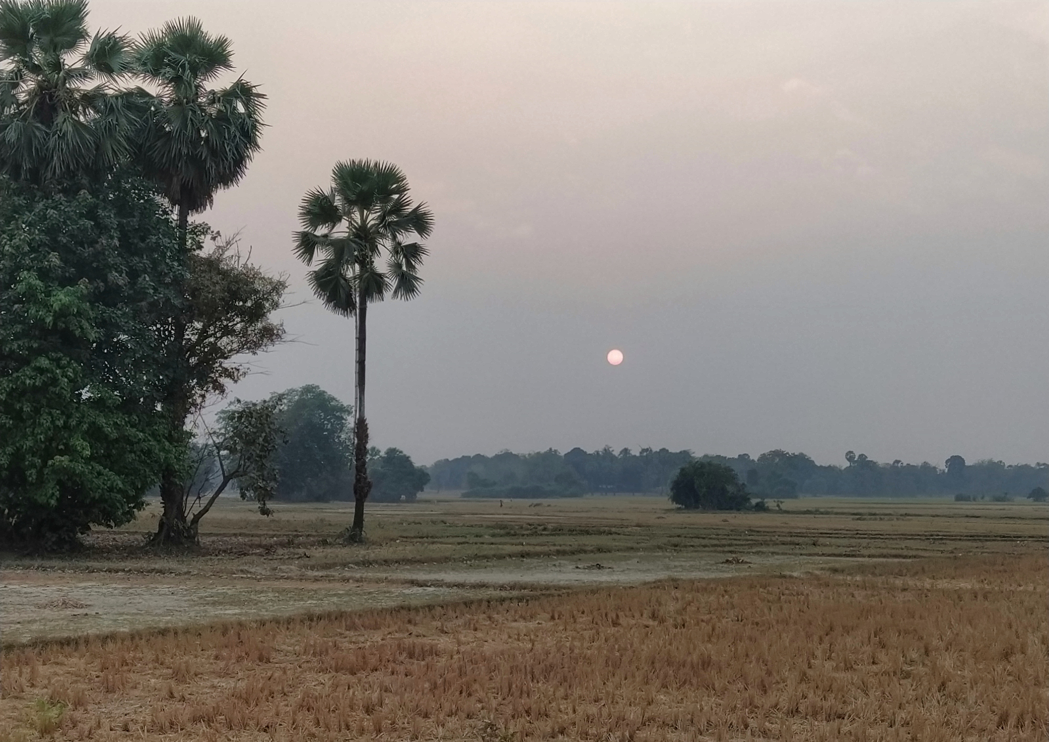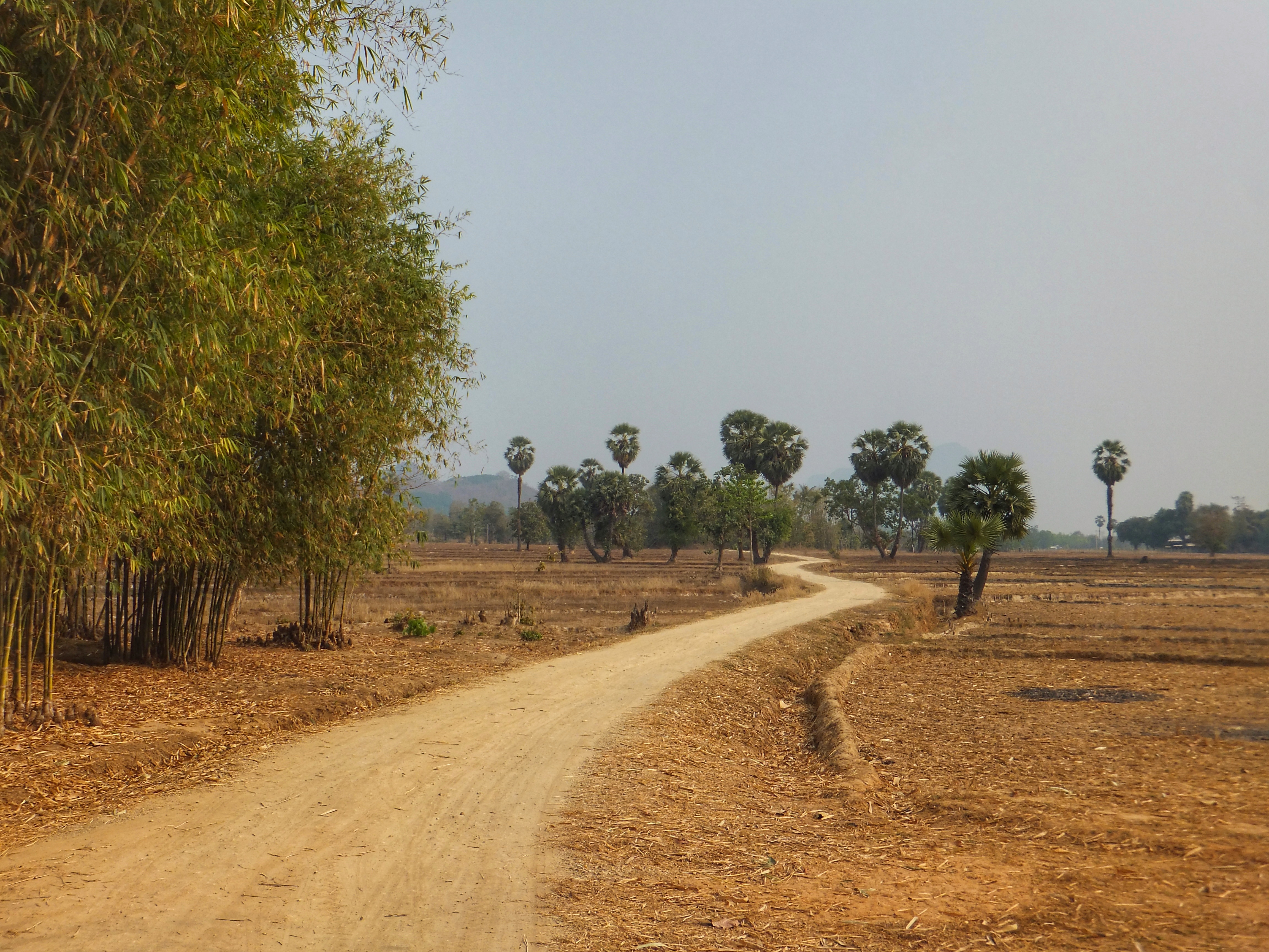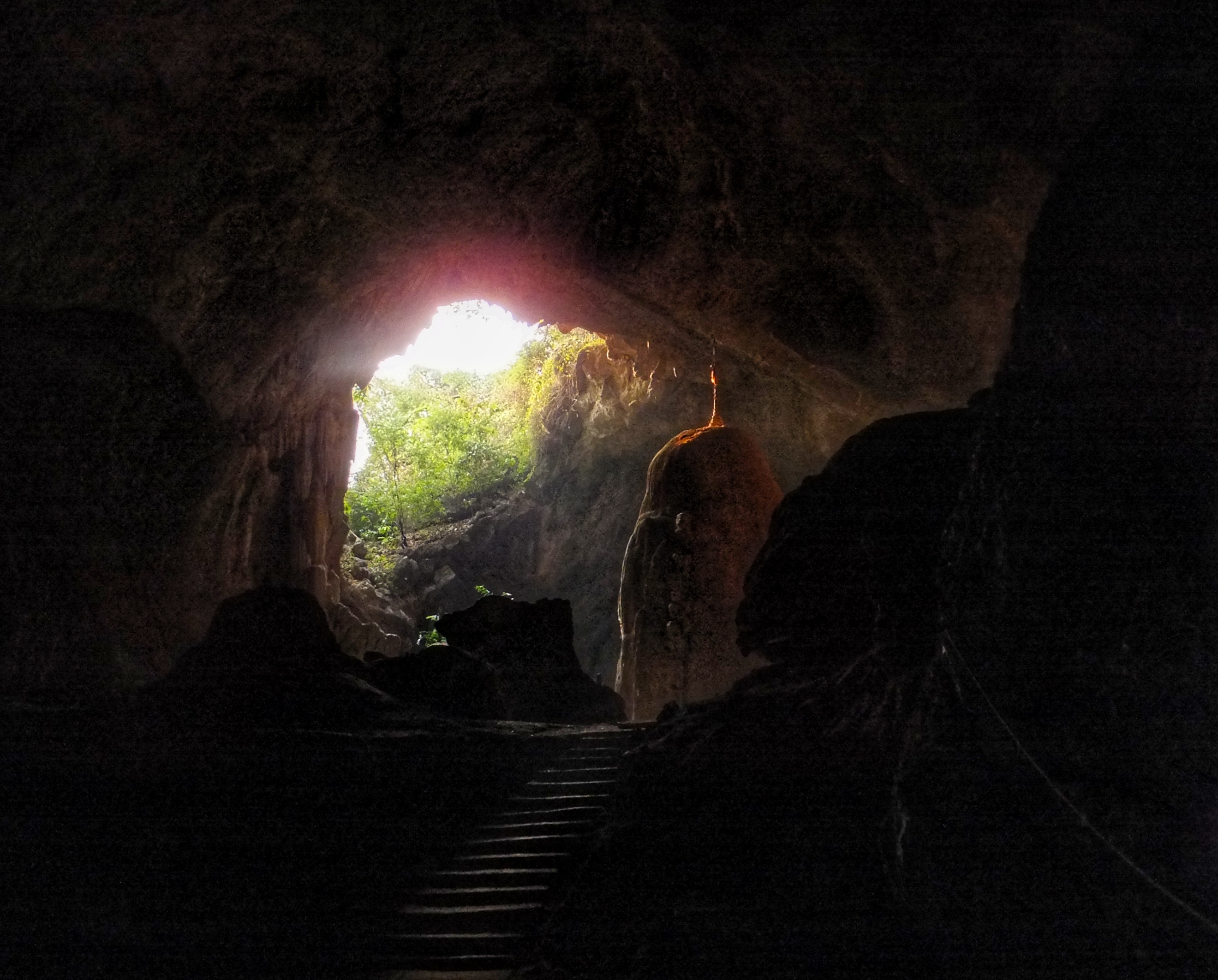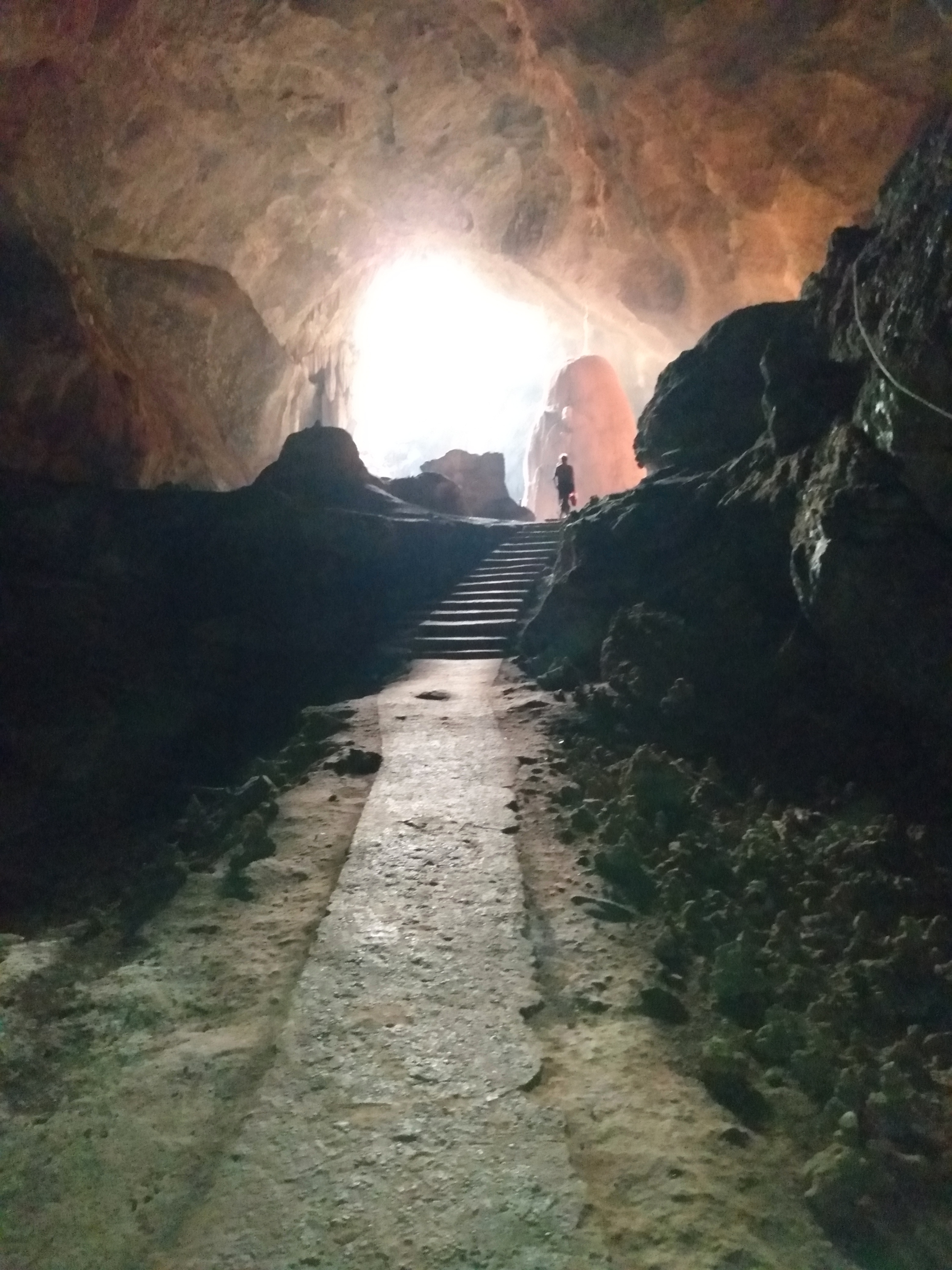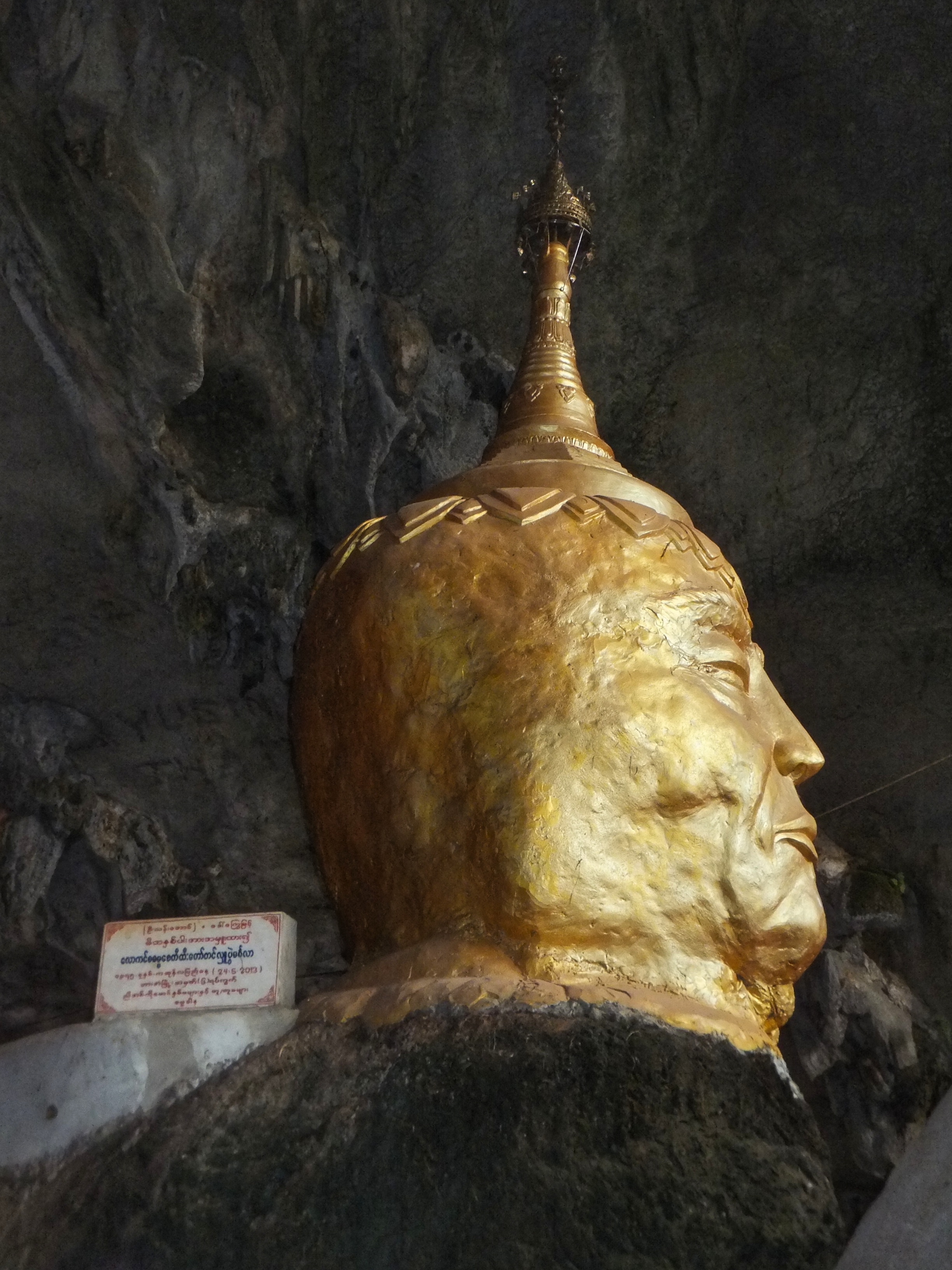 Auch heute fuhren wir mit unserem kleinen Roller. Dass er immer mal wieder ausging hat uns nicht weiter gestört. Wenn er erstmal am laufen war, ging es prima. Als erstes ging es zur Kaw Ka Thaung Cave, einer Höhle, die Mönchen gewidmet schien. Eine lange Prozession von Mönchsfiguren führte zur Höhle und auch im Innern gab es eine lange Reihe solcher Figuren. Aus dem Innern der Höhle bekamen wir eine schönen Blick auf die Landschaft außerhalb. In unmittelbarer Nähe gab es ein kleines Dorf, daß das ursprüngliche Leben zeigen sollte. Da es hier aber bereits ab dem Parkplatz klar war, dass es sich nur um ein „Vorzeigedorf“ handelte fuhren wir weiter und suchten ein bei Google angezeigtes Dorf inmitten des karstigen Waldes. Über schmale Wege, auf denen nur noch unser kleines Motorrad Platz hatte fanden wir es schließlich. Die Menschen dort winkten uns fröhlich zu, wie sie es immer taten, wenn sie uns vorbeifahren sahen. Sie schienen sich tatsächlich zu freuen, dass wir ihr Land besuchten und uns für sie interessierten. Wir fuhren weiter und kamen durch große Reisfelder wo wir auf einer kleinen Brücke ein Pause machten und einer Frau zusahen, die irgendetwas an einem Reisighaufen im Fluss tat. Danach besichtigten wir eine weitere Höhle: die Saddan Cave. Wir waren etwas überrascht, wie weitläufig diese Höhle war. Hinter den Figuren und einem großen Kopf in der Eingangshöhle gab es einen beleuchteten Gang, der durch zahlreiche Höhlen durch den gesamten Berg führte. Dabei kamen wir durch eine große Höhle, die von unzähligen Fledermäusen bewohnt war. Den Geruch und die Geräusche kannten wir bereits von gestern. Auf der anderen Seite warteten Boote darauf, die Besucher über kleine Kanäle zurück zum Eingang zu bringen. Wir nahmen jedoch den Weg durch die Höhle zurück und bewunderten noch einmal die vielen Farben und Formen der Figuren, die sich in den Kalksteinfelsen über die Jahrhunderte gebildet hatten. Die Sonne ging gerade unter als wir uns auf den Weg zurück nach Hpa-An machten. Zwischen den Bergen wurde es deutlich kühler aber als wir wieder das offene Land erreichten, wurde es wieder sehr warm. In Hpa-An besorgten wir uns auf einem Nachtmarkt unser Abendessen, das wir anschließend gemütlich im Hotel verspeisten.