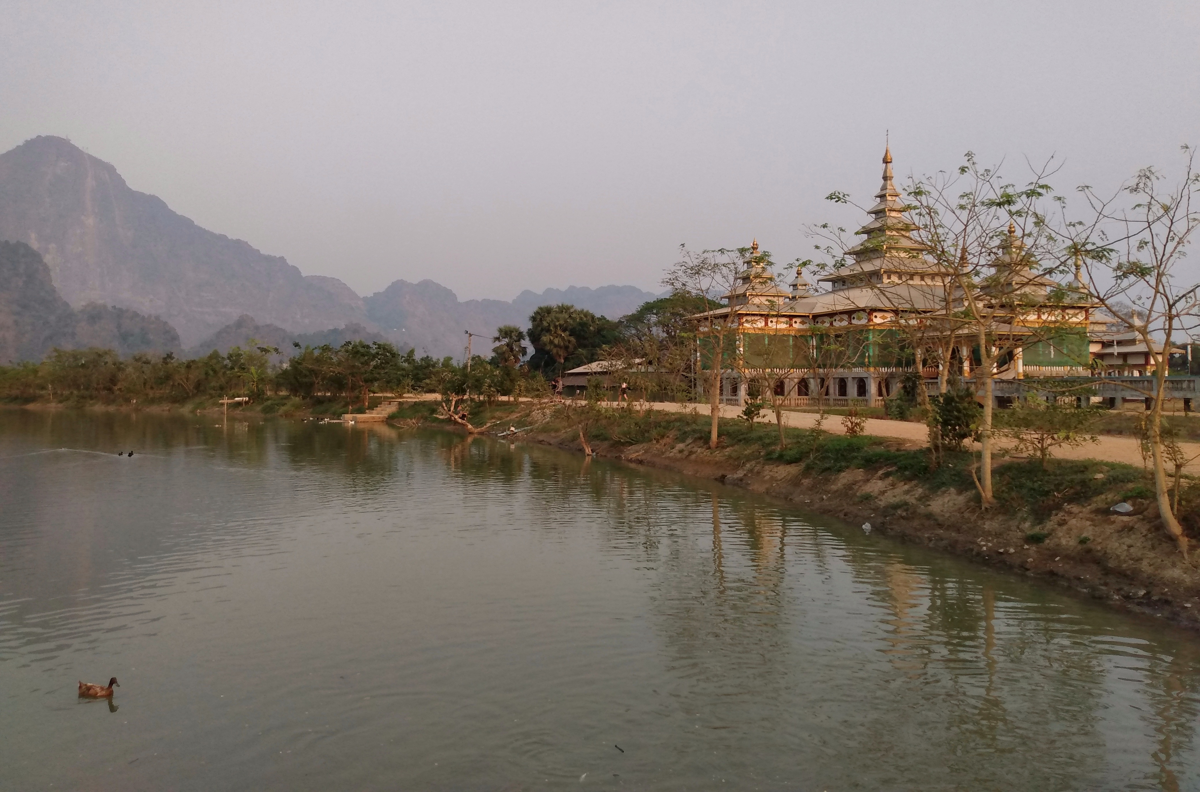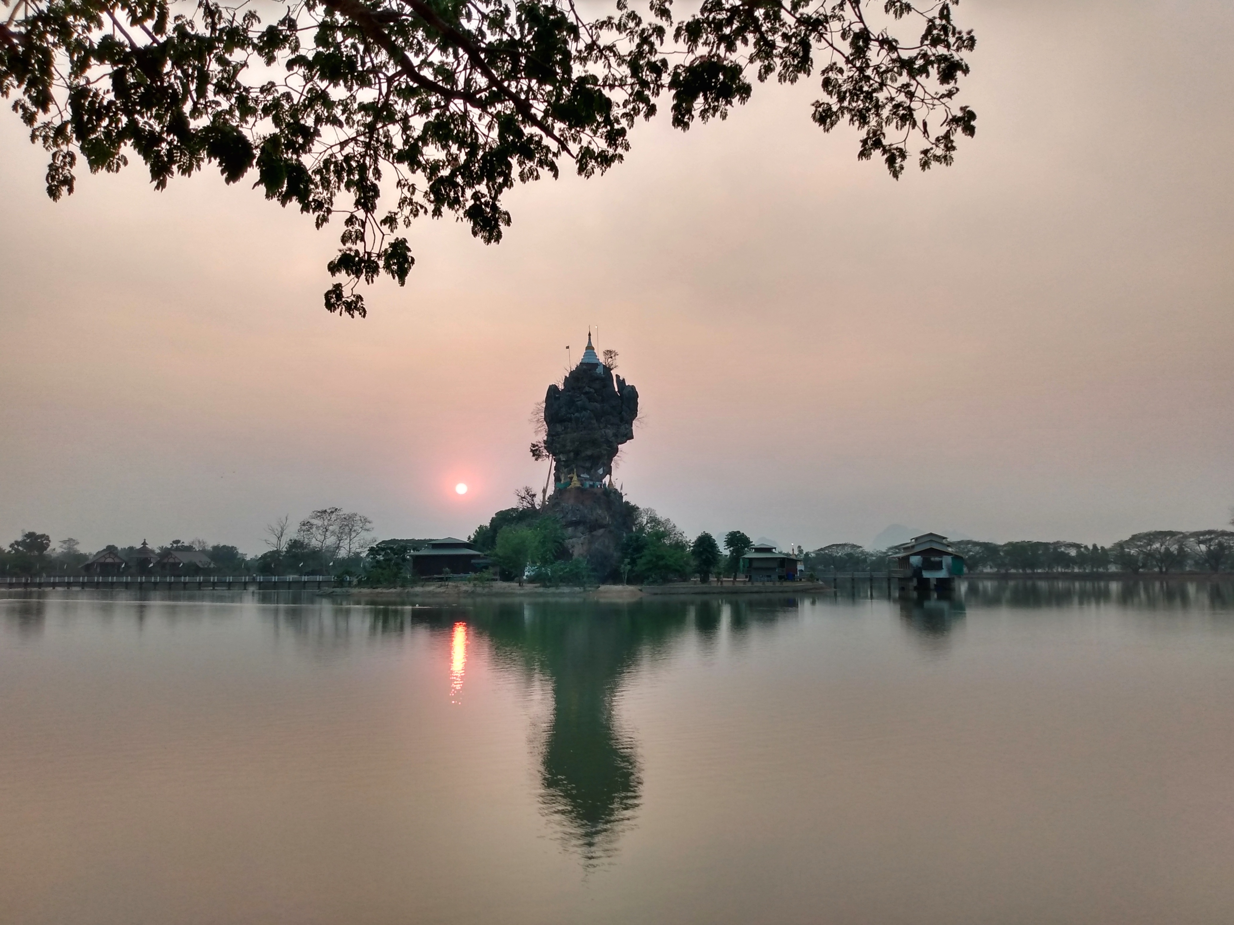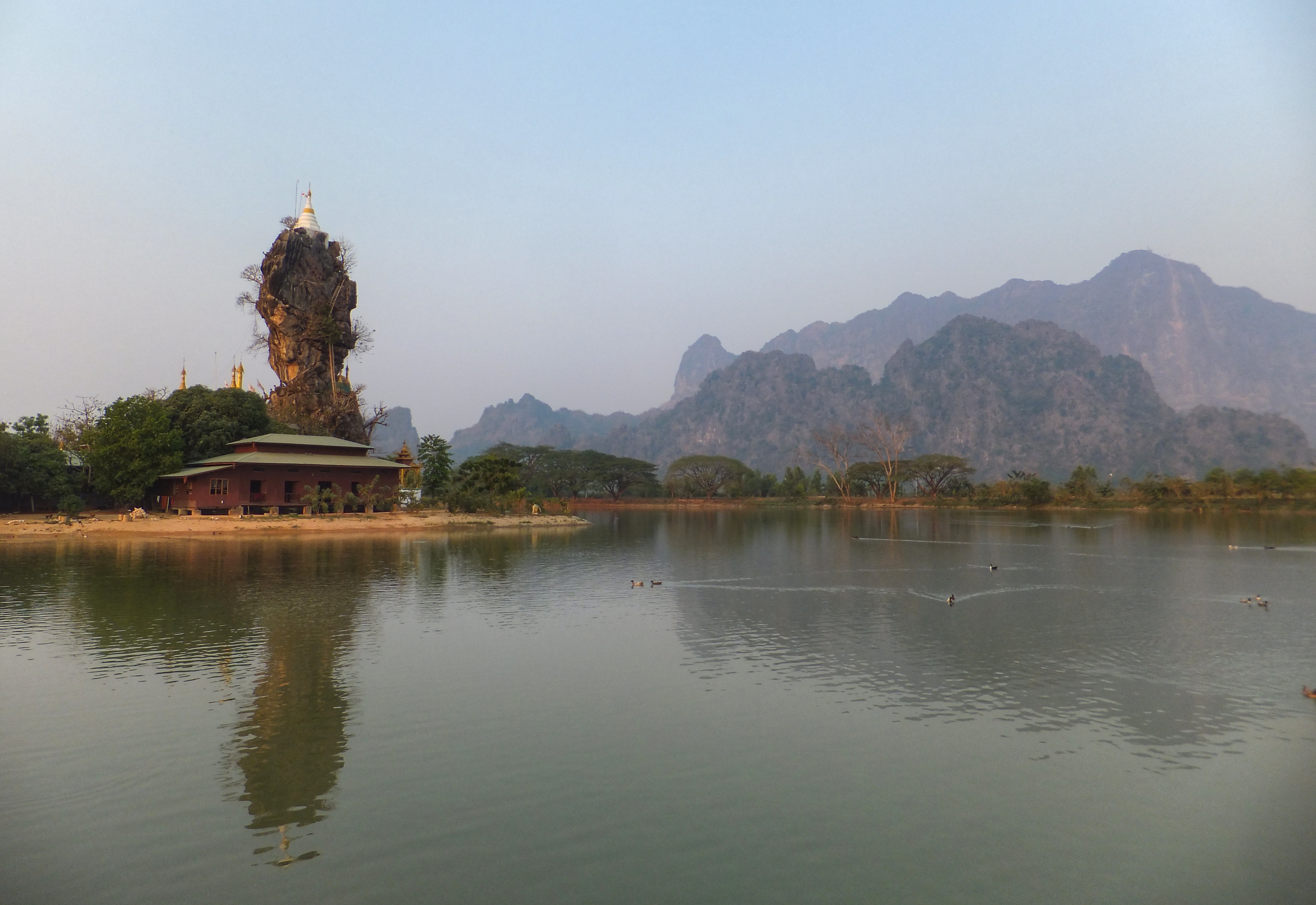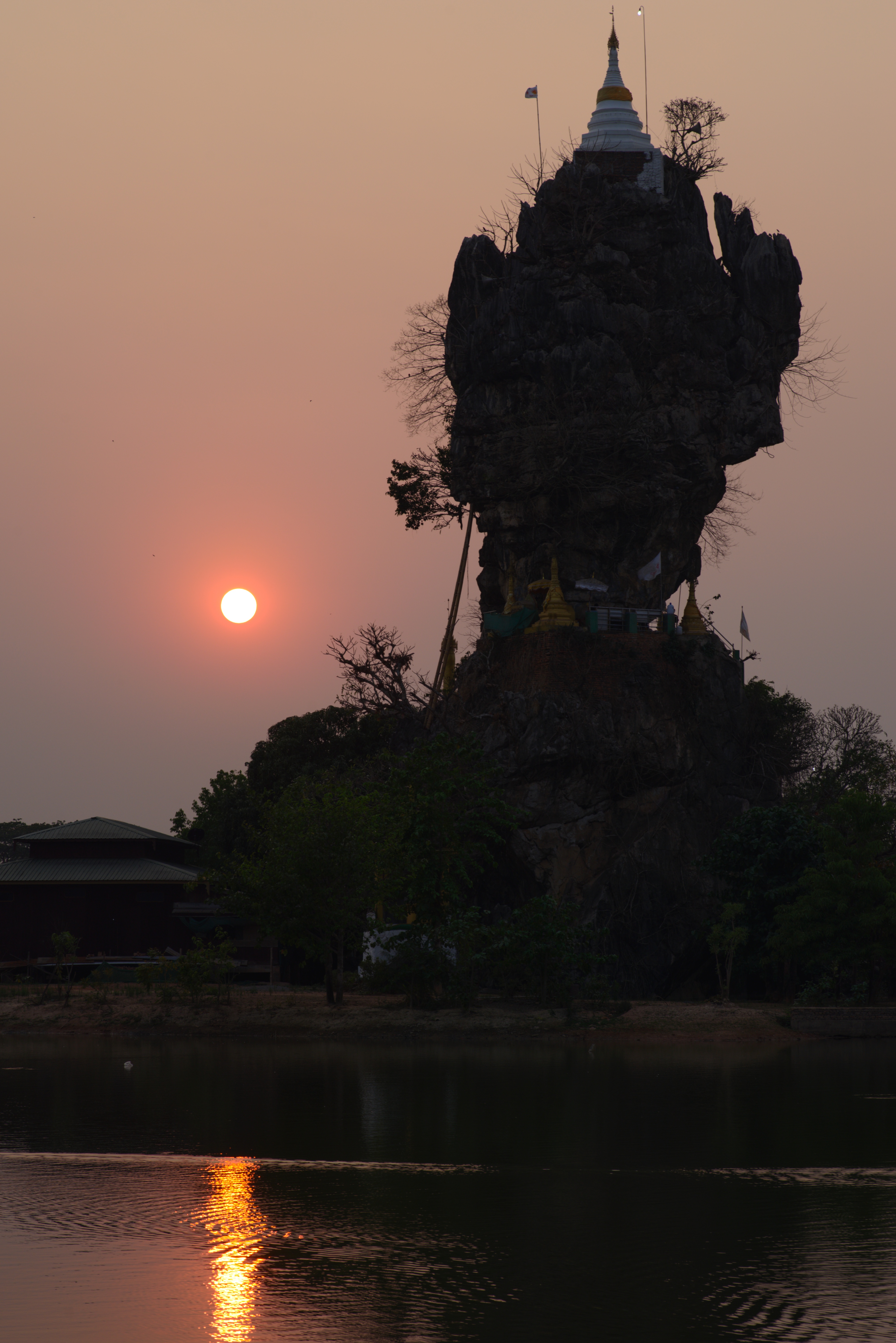 Überall stehen auf den Karstbergen Stupas und Pagoden. Wir hatten uns vorgenommen, eine davon zu besuchen. Der erste Versuch scheiterte jedoch am zu schwachen Motor unseres Rollers und den schlechten Schotterwegen, die nach oben führten. Bei der nächsten Stupa, die wir bei Nacht aus unserem Hotelzimmer sehen konnten, schafften wir es dann doch. Mit einigen Anläufen und teilweise zu Fuß, da das Motorrad die steile Straße nur mit einer Person bewältigte, kamen wir am unteren Ende einer Treppe an, die die letzte Meile zur Stupa hinaufführte. Es war sehr heiß und als wir oben ankamen bedauerten wir es sehr, das Wasser im Roller gelassen zu haben. Der Ausblick war fantastisch und wir konnten ganz Hpa-An und natürlich auch unser Hotel sehen. Zum Sonnenuntergang fuhren wir zu einer besonders auffälligen Stupa, die auf einer kleinen Felsnadel errichten worden ist, die auf einer kleinen Insel inmitten eines künstlichen Sees liegt. Die Sonne ging malerisch neben der bebauten Felsstruktur unter und das orange-rote Licht spiegelte sich dabei wunderschön im Wasser des Sees. Unser Abendessen holten wir wieder auf den Nachtmarkt: einen Fisch, Reis mit Hühnchen, Oktopus-Spieße und gebratene Maiskolben.