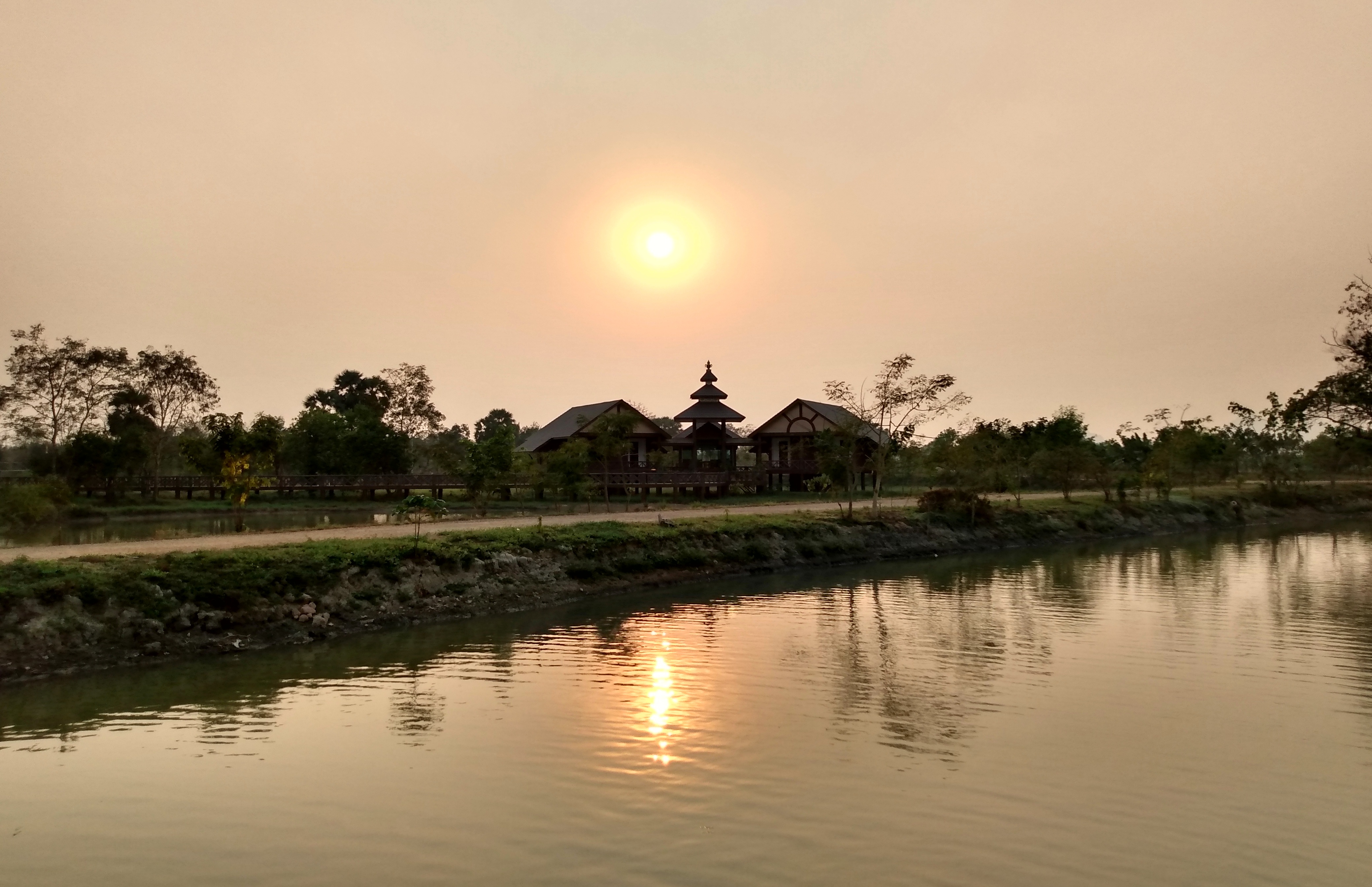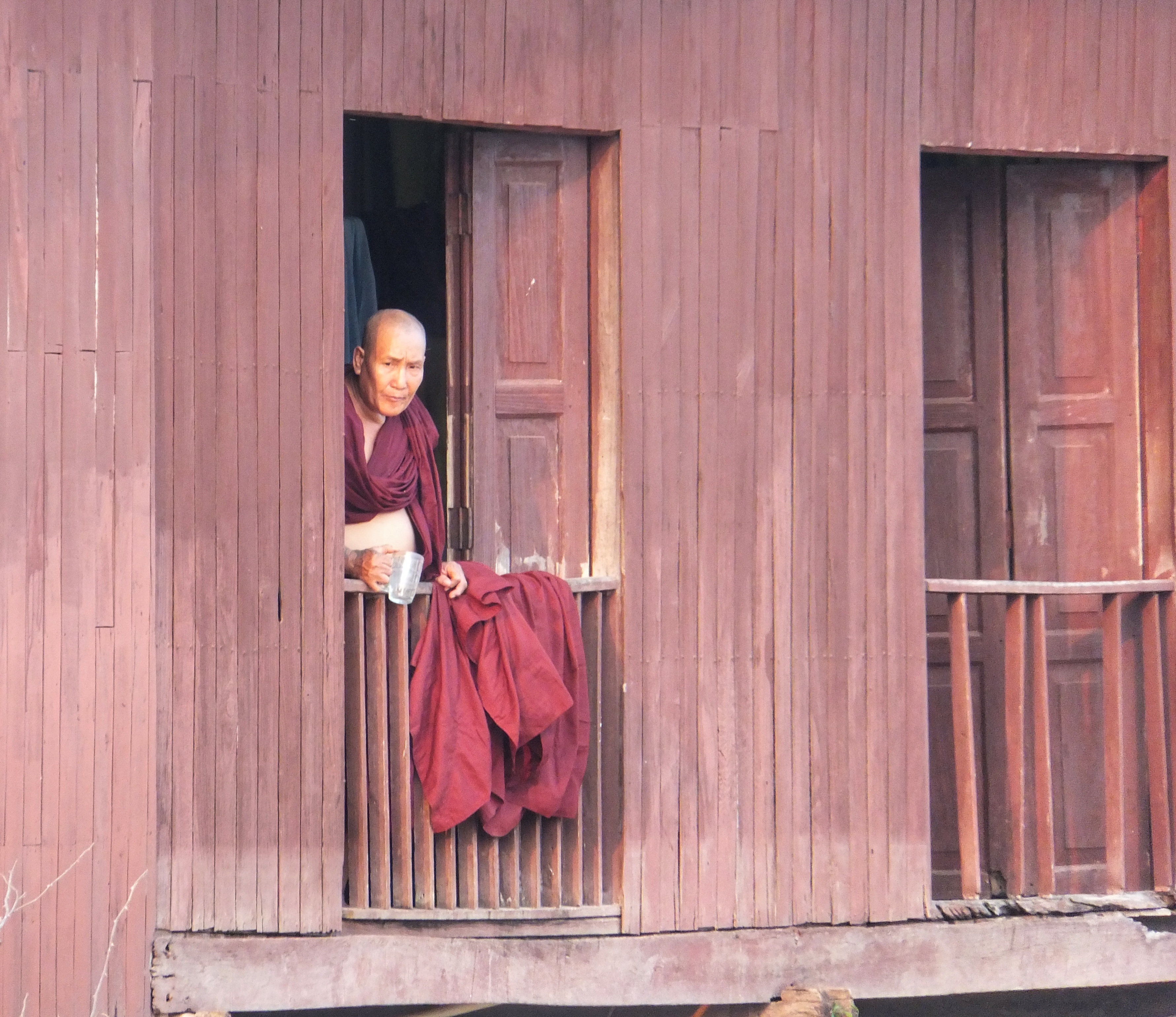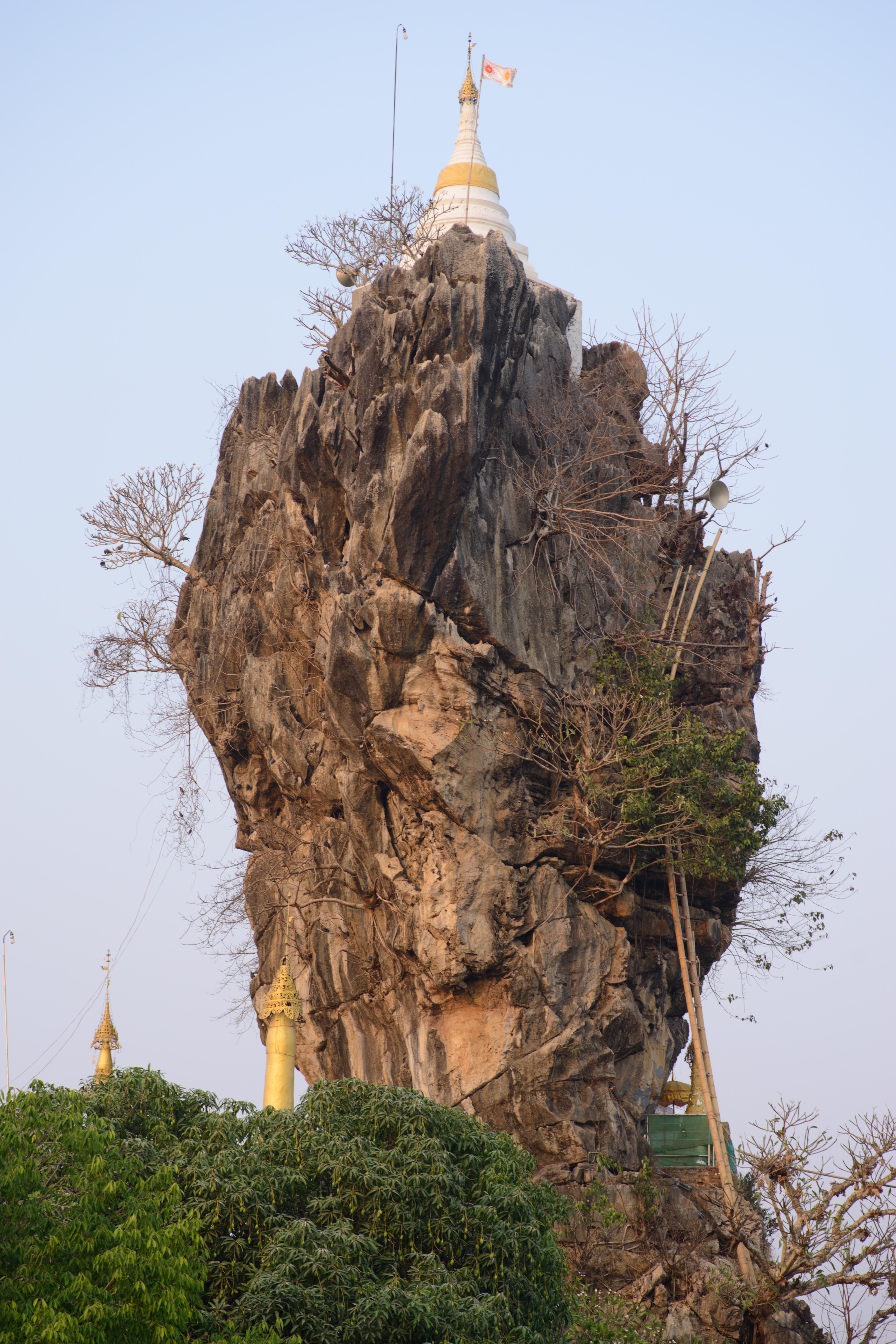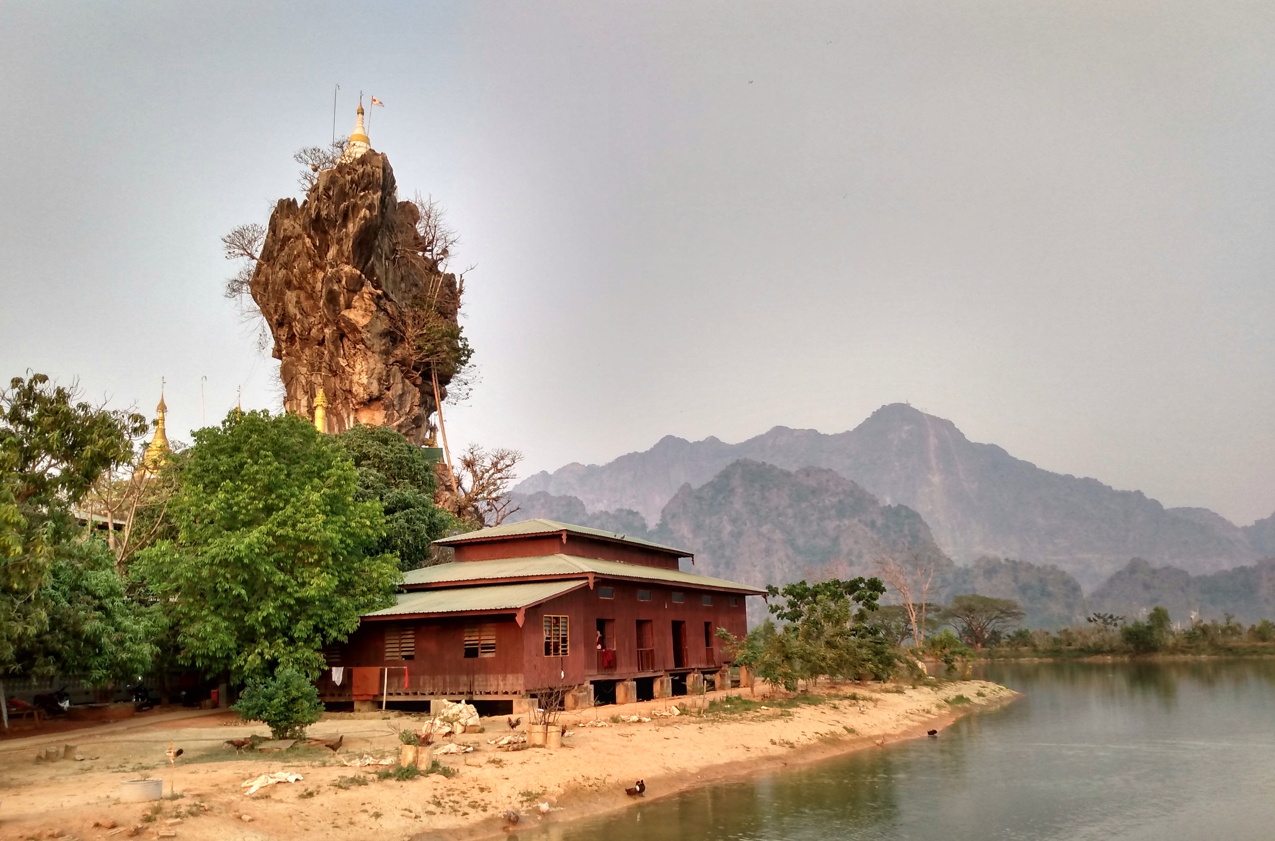 Überall stehen auf den Karstbergen Stupas und Pagoden. Wir hatten uns vorgenommen, eine davon zu besuchen. Der erste Versuch scheiterte jedoch am zu schwachen Motor unseres Rollers und den schlechten Schotterwegen, die nach oben führten. Bei der nächsten Stupa, die wir bei Nacht aus unserem Hotelzimmer sehen konnten, schafften wir es dann doch. Mit einigen Anläufen und teilweise zu Fuß, da das Motorrad die steile Straße nur mit einer Person bewältigte, kamen wir am unteren Ende einer Treppe an, die die letzte Meile zur Stupa hinaufführte. Es war sehr heiß und als wir oben ankamen bedauerten wir es sehr, das Wasser im Roller gelassen zu haben. Der Ausblick war fantastisch und wir konnten ganz Hpa-An und natürlich auch unser Hotel sehen. Zum Sonnenuntergang fuhren wir zu einer besonders auffälligen Stupa, die auf einer kleinen Felsnadel errichten worden ist, die auf einer kleinen Insel inmitten eines künstlichen Sees liegt. Die Sonne ging malerisch neben der bebauten Felsstruktur unter und das orange-rote Licht spiegelte sich dabei wunderschön im Wasser des Sees. Unser Abendessen holten wir wieder auf den Nachtmarkt: einen Fisch, Reis mit Hühnchen, Oktopus-Spieße und gebratene Maiskolben.