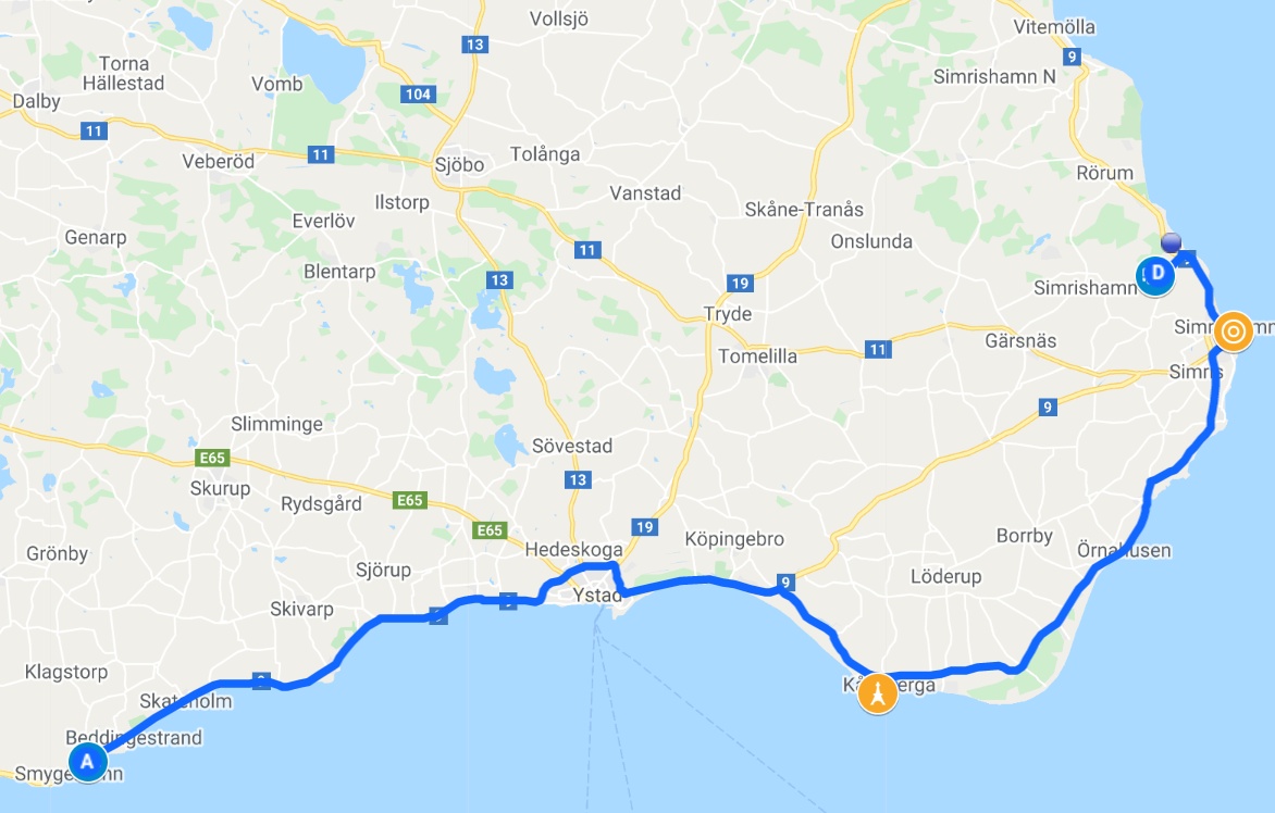 Vom Meeresrauschen geweckt zu werden ist schon etwas sehr Schönes. Die Sonne schien schon und als wir mit dem Frühstück fertig waren, war es auch schon Mittags. Wir genossen die langesame Fahrt auf der Küstenstraße zu unserem ersten Ziel, Ales Stenar, einem großen Kreis aus Hinkelsteinen, die in der Form eines Schiffsrumpfes auf einem Hügel stehen. Der Parkplatz war riesig und bis auf vier Wohnmobile völlig leer. So konnten wir uns die Steine in aller Ruhe ansehen. Weiter ging es durch Kiefernwälder mit kleinen versteckten Häusern weiter bis nach Simrishamn, einem kleinen Fischerdorf, das für seine alten pastellfarbenen Häuser bekannt ist. Wir erkundeten den Ort zu Fuß und nahmen dabei einen auf der Straße liegenden Zweig mit, an dem eine bunte Feder befestigt ist. Mit diesen Federn waren viele Restaurants aber auch Laternenpfähle und ähnliches geschmückt. Der Sinn dahinter ist uns noch verborgen, aber wir werden es bestimmt bald herausfinden. Am späten Nachmittag erreichten wir unseren Nachtplatz, einen kleinen (und leeren) Parkplatz oberhalb des Strandes bei Baskemölla, wo ein Wanderweg zum Strand anfängt. Und endlich haben wir auch unsere Drohne ausprobieren können. Der Erstflug verlief problemlos, auch wenn die Videoaufnahmen noch etwas ruckelig sind. Das werden wir noch üben müssen.