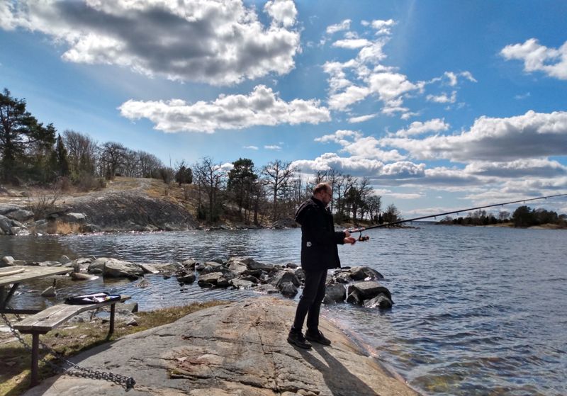 Unseren ursprünglichen Plan, heute eine Kunsthalle zu besuchen mussten wir aufgeben, da wir zum Glück noch vor der Fahrt dorthin festgestellt haben, dass diese nur Freitags, Samstags und Sonntag geöffnet ist. Aber die Sonne schien so schön, dass wir auch nicht die ganze Zeit im Auto verbringen wollten. Also fuhren wir, nachdem wir unseren Wassertank an einer Tankstelle aufgefüllt haben, ein wenig die Küste hinauf, bis wir in der Nähe von Karlshamn einen herrlichen Platz in einem Naturschutzgebiet gefunden haben, wo wir unsere ersten Angelversuche machen konnten. Gefangen haben wir zwar nichts, aber Spaß hat es trotzdem gemacht. Wir trösteten uns zum Kaffee mit einem Glas selbst gebackenen Marmorkuchen. Den zweiten Versuch machten wir an unserem Stellplatz auf der Insel Hasslö. Hier trennten uns vielleicht fünf Meter von der Ostsee und wir freuen uns schon auf das sanfte Gluckern, das uns in den Schlaf wiegen wird.