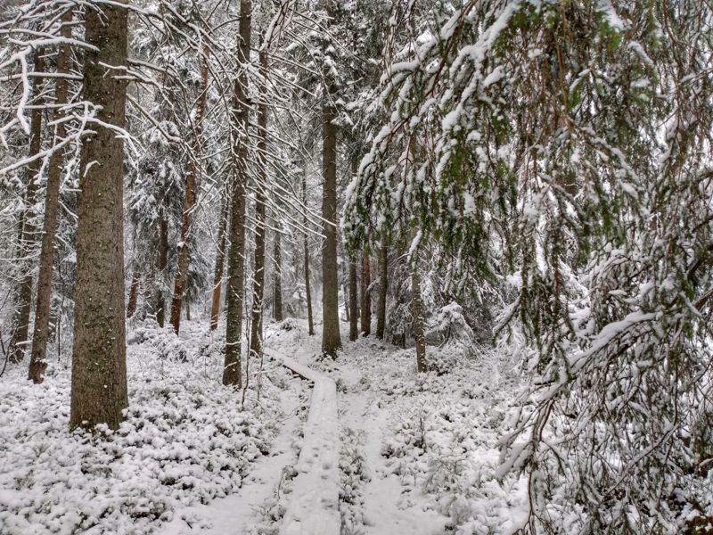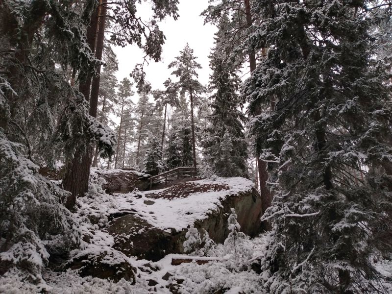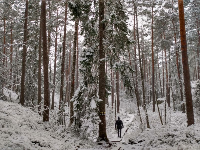 Es hat geschneit. In der Nacht hat es angefangen und als wir morgens aufwachen und aus dem Fenster sehen trauen wir unseren Augen kaum. Der ganze Wald ist schneeweiß und es schneit weiter. Wir machen uns für unsere Verhältnisse früh auf und fahren in den Tiveden Nationalpark. Es schneit noch immer und wir wandern und klettern auf knirschendem Schnee über Stock und Stein. Der Weg ist teilweise kaum noch zu erkennen aber die Markierungen an den Bäumen leiten uns dennoch sicher über den knapp 2 km langen Pfad. Ziel der Wanderung ist eine kleine Höhle, die sich unter einem gewaltigen Felsen gebildet hat, der durch die Eiszeit hierher getragen wurde. Immer wieder bieten sich schöne Ausblicke während wir durch die felsige Landschaft klettern. Und der Wald sieht mit dem vielen Schnee so viel schöner aus als die auf Frühling wartenden Wälder der letzten Tage. Nach der Wanderung fahren wir noch ein wenig mit dem Wohnmobil durch den Park ehe wir zu unserem nächsten Tagesziel der Festung Karlsborg fahren. Diese sah mehr nach einer großen Kaserne aus und nur eine halbe Stunde, nachdem wir Tiveden verlassen hatten, liefen wir wieder im Grünen herum und auch die Sonne kam schon wieder durch. Danach fuhren wir noch zum Einkaufen und an einem kleinen See fanden wir unseren nächsten Stellplatz. Wir erkundeten kurz den nahegelegenen Aussichtturm und sprachen kurz mit einem Mann, der gerade von dort kam und uns auf einen über den See fliegenden Seeadler aufmerksam machte. Er sprach sehr gut deutsch - eine echte Seltenheit hier.