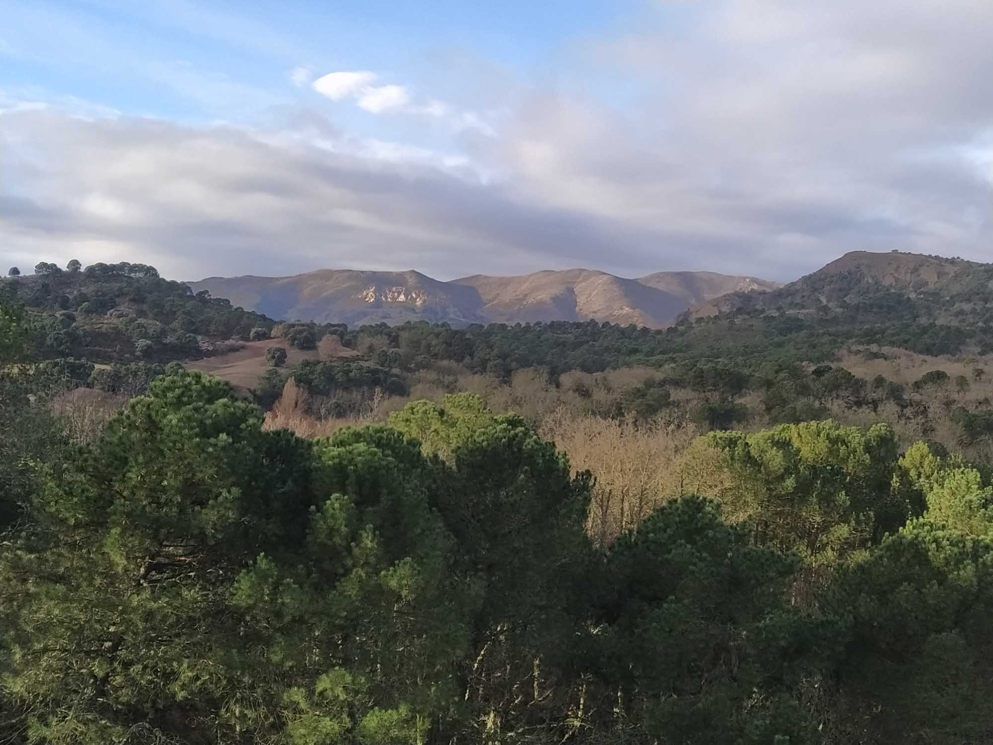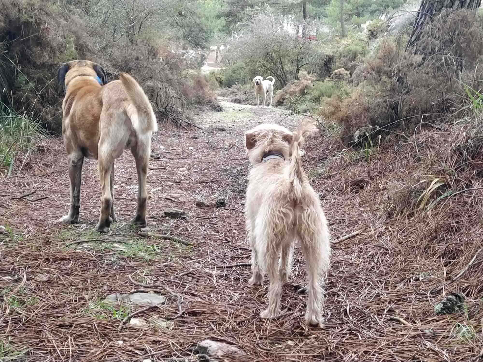 Wir hatten uns auf einen regnerischen Tag eingestellt und wurden von leichtem Nieselregen, grauem Himmel und viel Wind begrüsst. Berta bekam ihre Regenjacke an und auch wir machten uns halbwegs regendicht als wir unsere Morgenrunde machten. Aber nach dem Frühstück ließ der Regen nach und die Sonne schaute kurz durch das eine oder andere Wolkenloch. Nachmittags konnten wir dann sogar einen richtig schönen langen Spaziergang durch den Nationalpark machen und genossen die herrlich grüne waldige Berglandschaft, die so gar nicht nach Andalusien aussah. Den restlichen Nachmittag verbrachten wir mit Spielen, bis es Zeit für das Abendessen war. Wir bauten den Grill auf und es dauerte nicht lange, da bekamen wir Besuch. Wir hatten schon damit gerechnet, weil andere, die ebenfalls auf diesem Platz waren, davon berichtet hatten und wir bei einem Spaziergang den großen Hund beim nahegelegenen aber derzeit geschlossenen Kindergarten gesehen hatten. Jedenfalls kam ein großer Hund vorbei, roch kurz am Grill und pinkelte dann gegen die Gasflasche. Das fanden wir irgendwie gar nicht so lustig, verscheuchten das Tier erstmal und spülten die Flasche schnell mit Wasser ab. Er kam auch nicht wieder und so hatten wir ein leckeres Abendbrot mit gegrillten Hähnchenkeulen und Kräuterbaguette. Regen gab es auch keinen mehr und so konnten wir in der Nacht gut den Hund draußen hören, der sich offensichlich in unserer Nähe niedergelassen hatte und hin und wieder irgendetwas verbellte. Als wir am nächsten Morgen zum Spaziergang aufbrachen, lag er tatsächlich knapp 10 m von uns entfernt und kam gemütlich angetrabt. Da er uns in der Nacht so gut bewacht hatte bekam er zum Dank auch eine kleine Streicheleinheit, die er dankend annahm und uns anschließend, nachdem sich Berta und er bekannt gemacht hatten, auf unserem Morgenspaziergang begleitete. Zu Anfang war es fast so, als würden wir einen Spaziergang zu dritt machen. Berta blieb sowieso die ganze Zeit nah bei uns. Der große Hund lief vielleicht 20 m voraus. Als wir durch einen Graben gingen, war der andere Hund jedoch schon deutlich weiter und irgendwann sahen wir nur noch einen wedelnden Schwanz weit entfernt um eine Ecke biegen. Die Sonne strahlte herrlich vom Himmel und der Nationalpark zeigte sich von seiner schönsten Seite. Zwischendurch tauchte der andere Hund, den wir inzwischen Bruno genannt haben, wieder auf nur um kurz danach wieder in den Bergen zu verschwinden. Auf dem Rückweg hörten wir ihn Bellen und dann auch ein anderes helleres quickendes Geräusch. Es hörte sich so an, als hätte Bruno ein Reh gejagt und wir hörten die Todesschreie des Tieres. Und genau so war es auch. Als wir dem Graben näherkamen rannte Berta plötzlich los, durchquerte den Graben und ließ sich auch nicht zurückrufen. In diesem Graben war auch Bruno, der sich gerade in das Hinterteil eines Rehs verbiss, das mit Tritten versuchte, ihn davon abzuhalten. Berta war inzwischen wieder zurück auf unserer Seite. Wir durchquerten den Graben gemeinsam, nahmen sie an die Leine und gingen dann oberhalb des Grabens auf der anderen Seite zu der Stelle, an der wir direkt unter uns Bruno mit dem Reh sehen konnten. Was sollten wir tun? Es sah nicht so aus, als würde er das Tier schnell töten. Er war nur mit dem Hinterteil beschäftigt. Kein Versuch, das Reh an der Kehle zu erwischen. Wir nahmen einen herumliegenden Pinienzapfen und warfen ihn neben Bruno und das Reh und waren sehr überrascht, dass Bruno tatsächlich von dem Tier abließ und sich dazu bewegen ließ, den Graben zu verlassen und zu uns hochzuklettern. Hoffentlich war das Reh nicht zu sehr verletzt, so dass es sich wieder in den Wald verkriechen und die Wunden ausheilen lassen kann. Bruno kam jedenfalls einfach mit uns mit. Das Blut in seinem Fell glänzte rötlich. Wieder zurück beim Wohnmobil holten wir unser zusätzliches Hundefutter heraus und nachdem Berta ihr Frühstück bekommen hatte, gaben wir Bruno auch eine ordentliche Portion, die er dankbar annahm und sich anschließend vor unserer Tür in die Sonne zum Schlafen legte. Jetzt schauten wir uns Bruno etwas näher an. Er trug ein Halsband mit einer Tollwut-Plakette, weswegen wir und vermutlich auch andere, angenommen hatten, das er jemandem gehören würde und sich auch jemand um ihn kümmerte. Aber das Halsband war schon ziemlich alt und der Metallring verrostet. Die Plakette war auch schon alt. Sein Fell sah gut aus, aber er war ziemlich abgemagert, wie wir an den stark hervortretenden Rippen leicht erkennen konnten. Bruno war ein Streuner. Gegen Mittag gingen wir noch einmal zu dem Graben. Natürlich ohne Bruno. Berta kam jedoch mit und wartete mit etwas Abstand als wir an der Stelle, wo Bruno das Reh erwischt hatte in den Graben blickten. Zwei Augen erwiderten unseren Blick. Das Reh lag aufrecht in dem Graben und schaute zu uns hoch. Aber es sah weder ängstlich noch schwächlich aus. Es schaute eher interessiert. Für uns war die Situation jedoch eher traurig, wussten wir doch, das das Tier nicht überleben würde. Wenn es das Reh nicht schafft, aus eigener Kraft wegzukommen, dann wird es entweder verhungern, wahrscheinlicher aber noch von Bruno in der nächsten Nacht getötet werden. Wir überlegten, ob wir jemandem Bescheid sagen sollten oder könnten und entschieden uns zunächst dafür die kommende Nacht abzuwarten. Am Nachmittag machten wir mit Berta noch einmal einen langen Spaziergang. Als wir wieder zurück waren, gingen wir noch einmal zum Reh, das leider immer noch dort war und etwas versteckt von einem Baum im Graben lag. Wir beließen es erst einmal dabei und machten es uns im Wohnmobil gemütlich. Bruno ließ sich den ganzen Tag über nicht mehr blicken. Abends kam er dann aber doch und bekam von uns noch einmal eine große Portion Trockenfutter. Danach hörten wir ihn noch ein paar Mal in der Nähe bellen und vermutlich passt er auch heute Nacht wieder auf uns auf.