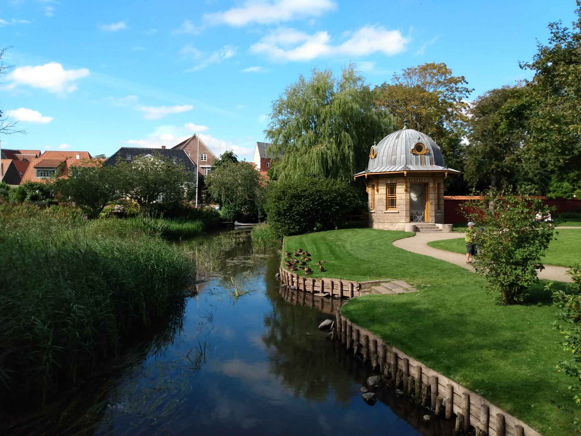 Die Nacht war ruhig und wir haben tief und fest geschlafen. Morgens allerdings wurden wir von lauten Stimmen und einem Fahrzeug geweckt, dass neben uns seinen Motor laufen ließ. Nach und nach kamen immer mehr Wagen und als wir nachsahen, stellten wir fest, dass eine halbe Kompanie Soldaten unseren Übernachtungsplatz als Sammelpunkt auserkoren hatten und wir plötzlich inmitten von Militärfahrzeugen standen. Es war schon ein lustiges Bild, unseren Forti so umringt von Soldaten zu sehen. Aber sie waren alle sehr nett, grüßten und störten sich nicht weiter an uns. Nachdem wir mit allem fertig waren, hatten sie vor unserem Wagen noch eine Besprechung und fuhren dann vor uns los, so dass auch wir problemlos wieder von dem kleinen Rastplatz herunterkamen. Als erstes fuhren wir zu einem Strand bei Hjerting und gingen dort spazieren. Schön war er nicht. Nicht sonderlich breit und der Sand war ziemlich nass. Dazu kam, dass auf der anderen Seite der Straße, die unmittelbar am Strand entlang führte, sehr moderne und für unseren Geschmack ausgesprochen häßliche Häuser standen. Aber Berta konnte immerhin frei laufen. Danach ging es weiter nach Esbjerg, wo wir uns die Skulptur "Der Mensch am Meer" ansahen, vier weiße Menschfiguren, die aufs Meer hinausblicken. Das Beste daran war der Hotdogstand daneben, der uns ein leckeres heißes Würstchen im Brotmantel zubereitete. Auf der gegenüberliegenden Straßenseite war das Fischerei- und Seefahrtsmuseum von Esbjerg, das neben allem was zur Fischerei und Seefahrt gehört auch noch ein Aquarium hat. Aber natürlich waren Hunde im Musem nicht erlaubt. Genausowenig wie im Wildpark Nørreskoven, den wir danach anfuhren. Bereits am Eingang wies uns ein Schild ausdrücklich auf das Verbot für Hunde hin, das wir gut nachvollziehen konnten, da das Dammwild dort frei herumläuft. Danach ging es für uns weiter nach Ribe, wo wir erst mal wieder unser Wasser auffüllten und uns danach die wunderschöne alte Stadt ansahen. Hier gab es sogar einen Dom, der seinem Namen alle Ehre machte. Zwar nicht ganz so üppig, wie mache katholische Kirche, aber angenehm hell und sehr schön anzusehen. Vor dem Domplatz trafen wir noch eine Gruppe Wikinger, die uns um ein Foto baten. Diese waren Laiendarsteller im Wikingermuseum von Ribe. Nachdem wir uns noch ein Eis gegönnt haben, die Sonne schien mal wieder prächtig, fuhren wir wieder an die Küste zu unserem nächsten Stellplatz. Diesmal war es ein Parkplatz unmittelbar vor dem Deich an einer Straße, die auf einem Damm zu der kleinen Insel Mandø führt. Bei Flut oder Hochwasser ist der Damm jedoch unter Wasser, die Straße also nur bei Ebbe befahrbar. Es hätte sogar gepasst, wir wollten aber gar nicht auf die Insel und machten lieber von dieser Seite aus noch einen kleinen Abendspaziergang bevor wir zum Abendessen und Spielen übergingen.
