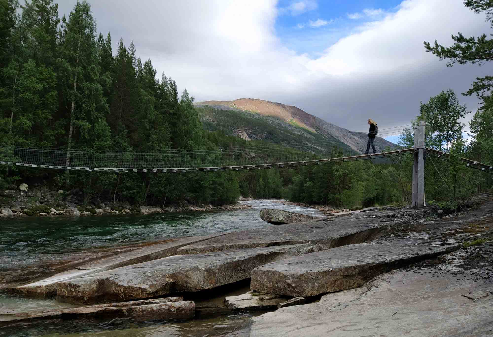 Wir wurden von der Müllabfuhr geweckt, die die Mülleimer auf dem Picknickplatz leerten, an dem wir standen. Als dann auch noch die Reinigungskräfte kamen, die sich um die Toiletten kümmerten, war die Nacht endgültig vorbei. Der Spaziergang war heute ein Klettergang über die Felsen am Ufer des Fjords entlang bis zur Brücke und zurück. Selbst für Berta war die Granitbrocken sehr glatt und wir rutschten abwechselnd darauf aus. Dann ging es weiter. Leider hatte Berta bei der ersten Fahrt wieder große Angst und auch das Füttern während der Fahrt half nicht weiter. Nachdem wir in Rognan einkaufen und noch einmal mit ihr Spazieren waren, ging es ihr besser und wir konnten die weitere Fahrt entlang der E6 nach Süden genießen. Unser Zeil war der Nationalpark Saltfjellet-Svartisen wo wir eine 5 km lange Rundwanderung am Kjemåfossen vorbei machten. Der Weg war einfach und Berta blieb diesmal an der Leine. Das war auch gut, denn bereits nach den ersten 100 m lief ein Elch über den Weg und über die angrenzende Wiese bevor er wieder im Wald verschwand. Die erste Hängebrücke mochte Berta nicht überqueren. Vermutlich wusste sie bereits, dass wir uns eigentlich nur den darunter brausenden Fluß ansehen wollten. Die zweite, entlang des Weges, ging sie dann aber auf eigenden vier Pfoten hinüber. Nach dem Spaziergang bogen wir ab und fuhren in Richtung der Reichsgrenze. Es war erstaunlich, wie schnell sich die Landschaft veränderte, als wir wieder in Schweden waren. Wir waren erst durch einen Tunnel und dann durch ein enges Tal entlang eines Baches den Berg hinauf gefahren. Dann kam der Pass und die Grenze. Und danach öffnete sich das Land und wir bestaunten eine zwar hügelige aber weithin übersehbare Fläche mit Wiesen, Wald und Seen und vor allem keinerlei Zivilisation. So brauchten wir auch nicht mehr lange, bis wir einen größeren Parkplatz zwischen der Straße und einem großen See fanden den wir in der Nacht mit vier weiteren Wohnmobilen teilten. Es gab auch keine Mülleimer, so dass wir nicht beführchten mussten, morgens wieder zu früh aus den Federn geholt zu werden.