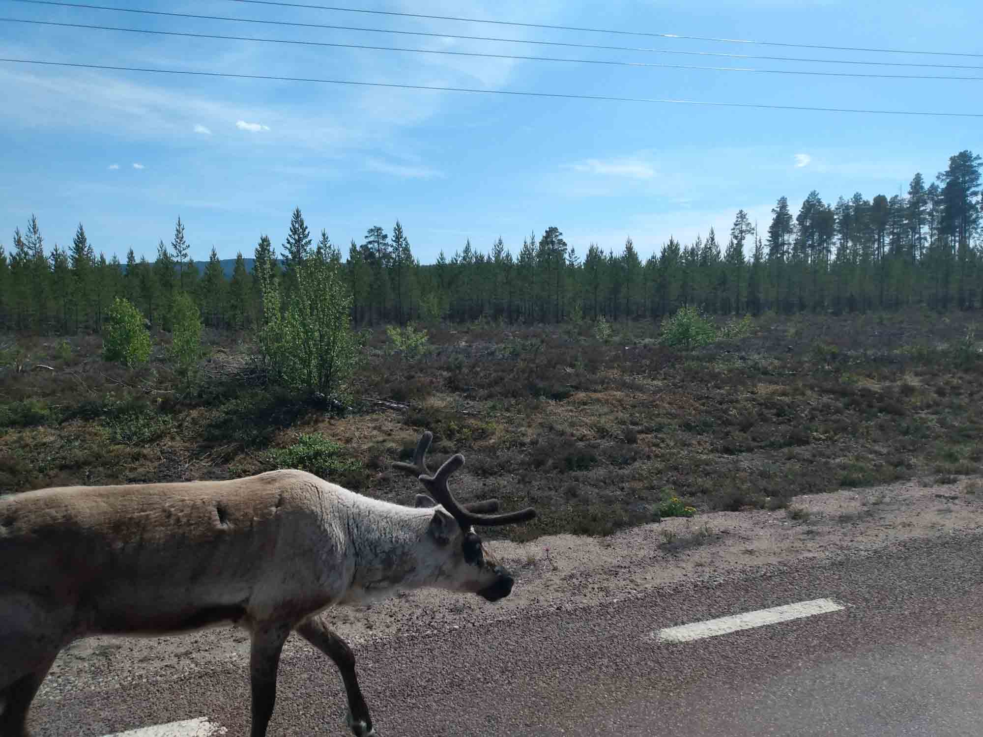 So schön der Platz auch war, so langsam wollten wir weiter. Es hatte sich auch jede Menge Müll angesammelt, der sich im Fußraum stapelte. So fuhren wir nach einem letzten Spaziergang bei strahlendem Sonnenschein weiter. Berta wurde wieder bei der Fahrt gefüttert. Zunächst ging es nach Sveg zum Einkaufen. Die Zeit nutzte Berta, um unseren Müll zu durchstöbern und nach etwas Eßbarem zu suchen, ganz so als hätte sie den ganzen Tag noch nichts bekommen. Noch auf dem Parkplatz machten wir den Wagen wieder sauber. Es war ziemlich heiß und wir waren plötzlich froh, die Klimaanlage noch vor unserer Abreise repariert zu haben. Wer hätte gedacht, dass wir in Nordschweden über 30 Grad haben würden. Irgendwo im Nirgendwo hielten wir und machten einen Spaziergang entlang einer Schotterstraße. Als wir zurück und beim Fertigmachen des Wohnmobils waren, machte sich Berta noch einmal auf, um den umliegenden Wald zu erkunden. Sie brauchte vielleicht 20 Minuten. Dann konnten wir weiterfahren. Irgendwann hatten wir genug und suchten uns ein schattiges Plätzchen beim Ljungan See. Dies war ein kleiner versteckter Picknickplatz direkt am See von dem aus die auf der anderen Seite des Sees gelegene Bahnschranke recht häufig und gut zu hören war. Ebenso wie der nach dem Bimmeln folgende Zug. Ansonsten waren wir hier völlig ungestört und kühlten uns im Schatten der Bäume wieder etwas ab.