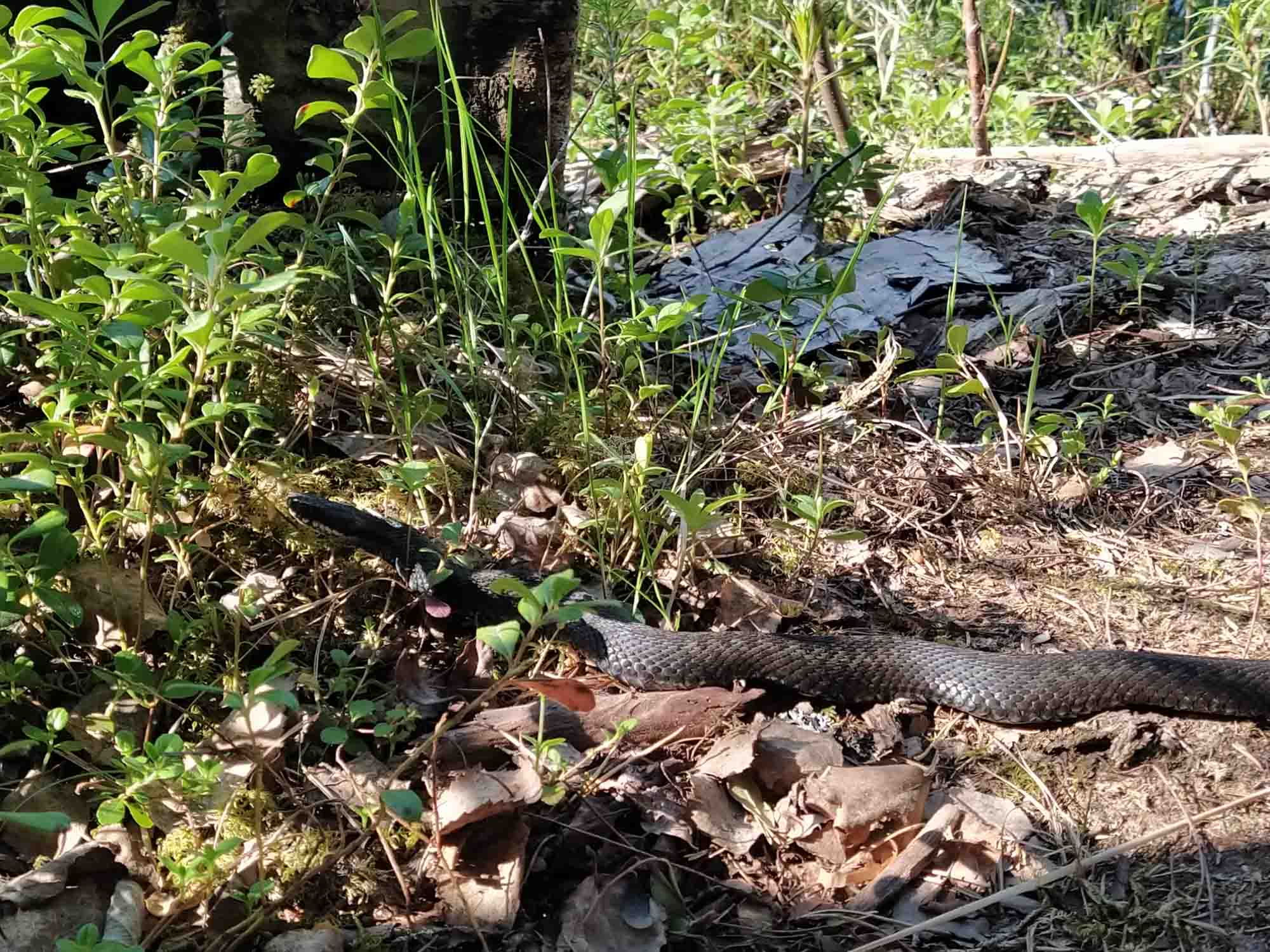 Die Sonne blieb uns treu. Der Spaziergang führte uns entlang eines schmalen Weges. Sicherheitshalber blieb Berta diesmal an der Leine. In einem Busch entdeckten wir ein Nest voller Raupen, die wohl bald das Weite suchen würden. Aber noch krabbelten sie nur in ihrem Gespinst herum. Danach fuhren wir knapp 100 km auf holprigen Schotterstraßen norwärds zum Nationalpark Björnlandet. Dort machten wir eine 3,7 km lange Wanderung um den See herum. Berta lief frei vor uns und wartete auf uns, wenn wir mal wieder etwas länger brauchten. Etwas anders wurde uns, als wir am Wegrand eine Schlange entdeckten, die ziemlich aufgeregt zu sein schien. Dann verkroch sie sich wieder im Gebüsch und wir liefen weiter. Warum diese Wanderung 3 Stunden dauern sollte, wurde uns auf der anderen Seite des Sees klar, als es über große Steine immer wieder hoch und runter ging. Das Geklettere war ziemlich anstrengend und wir kamen ganz schön ins Schwitzen. Vor einer kleinen Brücke bekamen wir noch weitere Schlange zu sehen, die es sich auf dem Weg gemütlich gemacht hat. Auch diesmal war Berta einfach vorbeigelaufen. Übernachten wollten wir hier nicht. Also fuhren wir noch etwas weiter auf der Schotterpiste nach Norden, bis wir irgendwann wieder auf eine asphaltierte Straße kamen. Dort kam nach kurzer Zeit ein Weg, der zu einem etwas versteckten Platz an einem großen Stausee herunterführte. Hier machten wir es uns schnell gemütlich. Draußen sitzen mochten angesichts der Mücken, die dort um uns herumschwirrten aber nicht.
