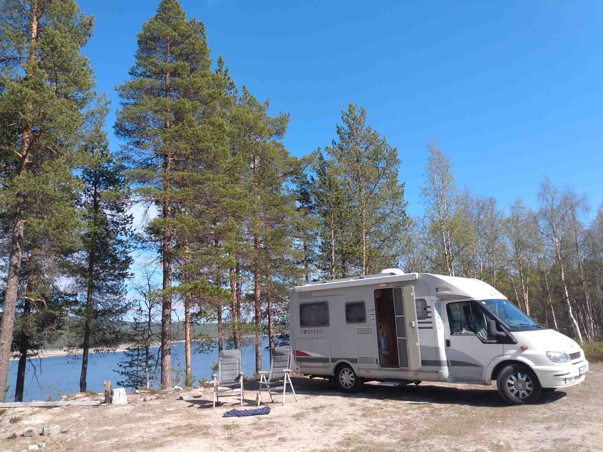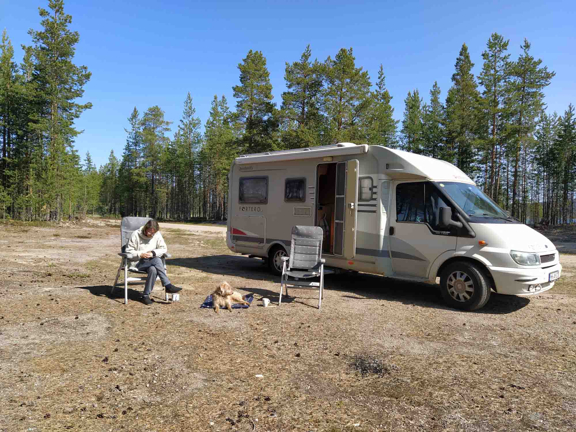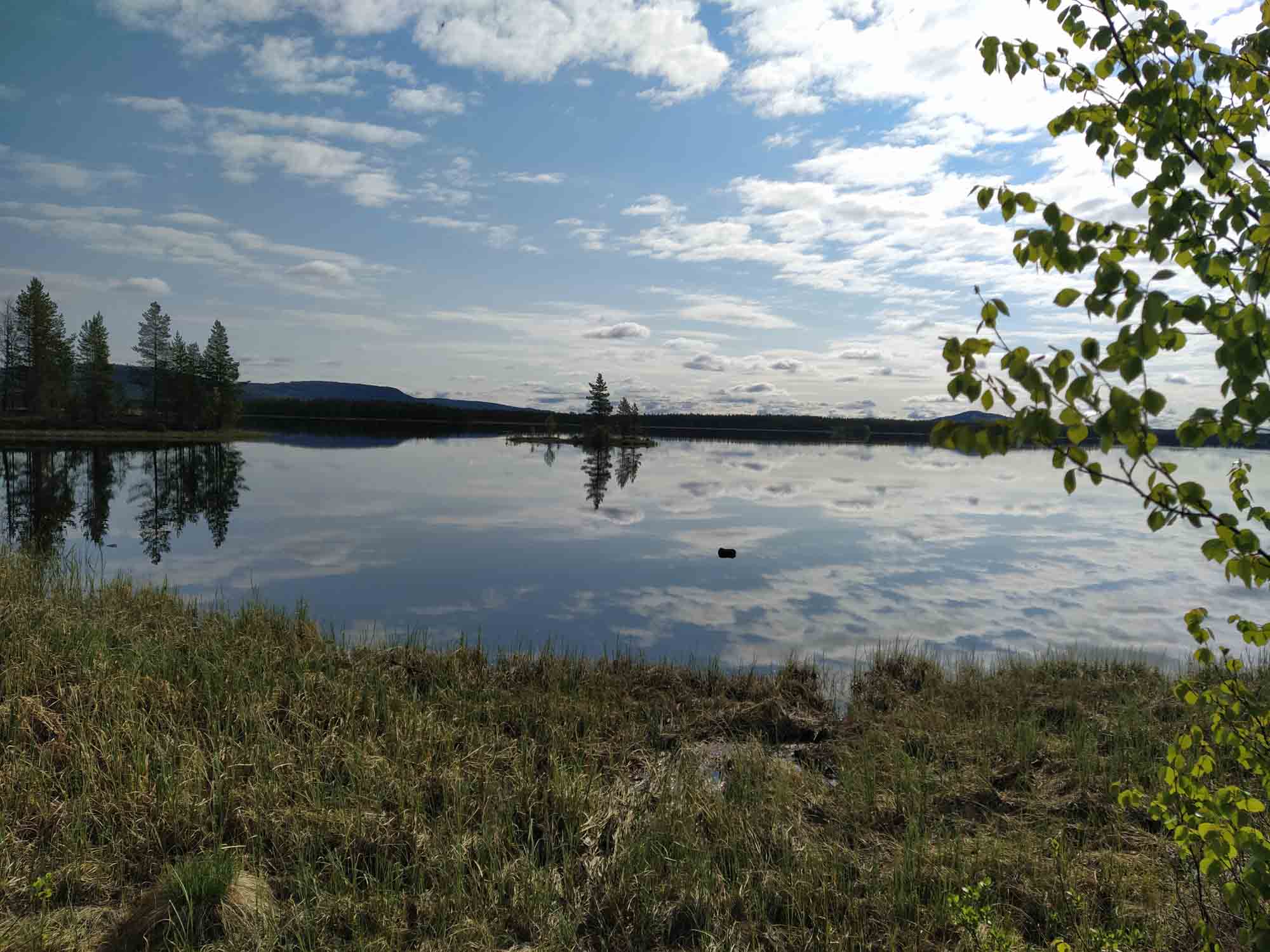 Nach dem morgendlichen Spaziergang machten wir uns wieder abfahrbereit. Berta musste wieder bis zum Beginn der Fahrt mit ihrem Essen warten, zitterte aber noch bevor der Motor gestartet war. Trotzdem ließ sie sich ein wenig durch das Füttern während der Fahrt ablenken. Erst als wir das Gaulatal erreicht und die Straße etwas besser wurde, wurde sie etwas ruhiger. Nach etwas einer Stunde erreichten wir den Aursunden, einen großen See auf der Hochebene, die im Grenzgebiet zwischen Norwegen und Schweden liegt und machten dort eine längere Pause. Nachdem wir weitergefahren waren, erreichten wir nach kurzer Fahrt die Grenze. Hier gab es eine Zollstation aber natürlich wieder keinerlei Kontrollen. Wir hätten sowieso die grüne Spur nehmen dürfen. Wir hatten Berta bereits Online beim Schwedischen Zoll angemeldet. Kaum hatten wir die Grenze überquert, wechselte der Fahrbahnbelag und anstelle des rumpeligen auf und abs mit regelmäßigen Schlägen durch quer verlaufende Erhebungen glitten wir die gut ausgebaute Straße bergab vorbei an schwedischen Skiorten bis wir zum Stausee Lossen abbogen und einen wunderbar einsam liegenden Platz direkt am See fanden. Die Straße war auf den letzten beiden Kilometern jedoch so schlecht, dass Aneta mit Berta lieber zu Fuß ging. Am Platz holten wir die Stühle heraus und saßen noch eine Weile in der herrlichen Sonne draußen und genossen die Ruhe und Abgeschiedenheit. Kein Auto war mehr zu hören und kein Haus zu sehen. Wir waren alleine mit dem Wind und den Vögeln, die um uns herum zwitscherten.