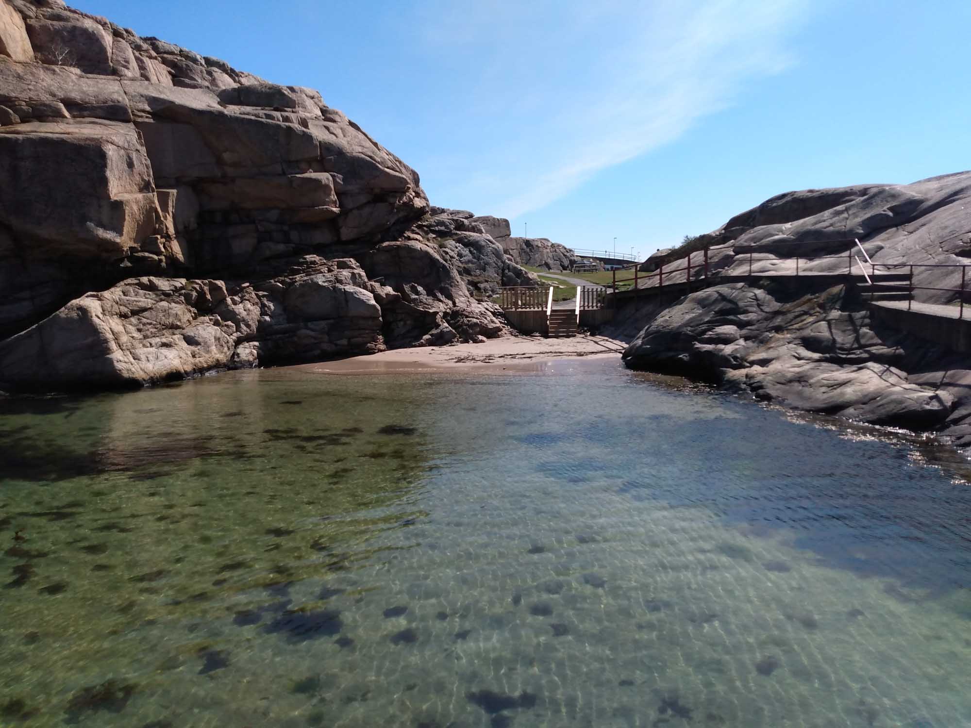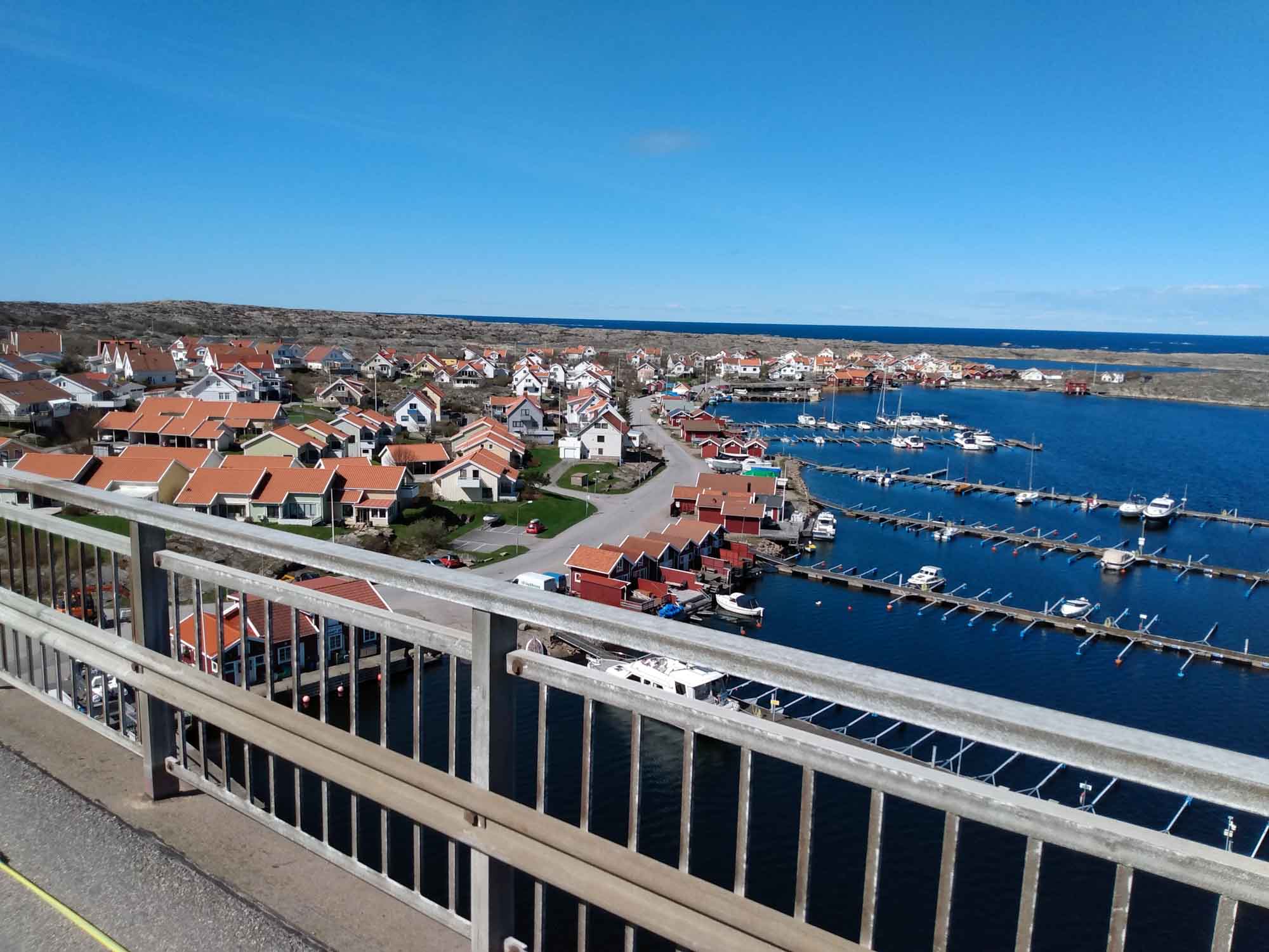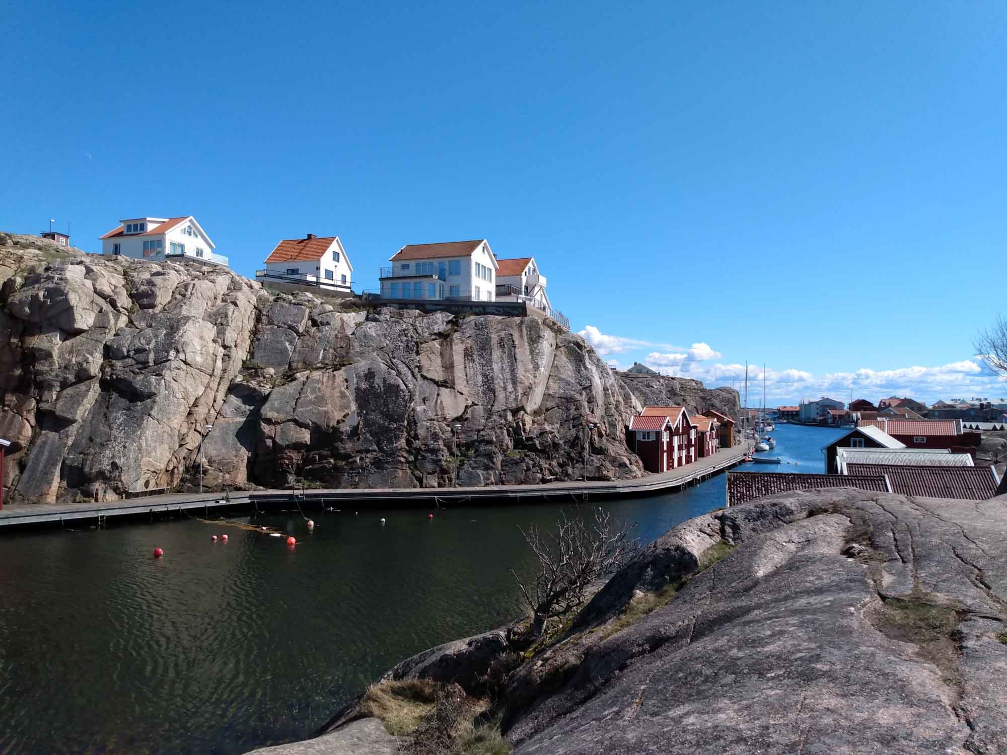 Nach einer erneuten Kletterpartie über die fantastischen Granitfelsen fuhren wir weiter an der Küste entlang nach Smögen. Dort parkten wir auf dem selben Parkplatz wie vor zwei Jahren und wanderten, diesmal mit Berta, über die Granitfelsen der urigen Landschaft. Zum Abschluß gingen wir noch den längsten Holzpier Schwedens entlang durch den Hafen des kleinen Städtchens. Anders als beim letzten Mal, erschien der Ort nicht wie ausgestorben. Einige der Restaurants und Souvenierläden waren geöffnet und vereinzelt begegneten uns sogar Menschen, die ihre Hunde ausführten oder in der Sonne saßen. Danach fuhren wir zu dem aus einer Kriminalserie bekannten Ort namens Fjällbacka. Dort wanderten wir durch die Kungsklyftan, in der in einer schmalen Schlucht mehrere Felsen hängen, die noch nicht hinabgestürzt sind. Auch diesmal kamen wir unbeschadet hindurch und bestiegen die Granitfelsen über eine 30 m hohe Holztreppe und konnten so auf die darunter liegende Stadt und natürlich wieder die Scheerenlandschaft sehen. Auch hier machten wir einen Spaziergang über die Felsen und Berta tobte wieder herum. Als sie nach einem kleinen Ausflug wieder zurück kam, war sie völlig durchnässt und schlammig. Sie war wohl abgerutscht und in einem der Tümpel gelandet, die sich zwischen den Granitfelsen gebildet hatten. Die Landschaft sah genauso aus, wie auf unserem letzten Übernachtungsplatz und wie so oft, waren wir hier völlig alleine. Wieder zurück beim Auto trockneten wir Berta erstmal ab und fuhren dann weiter bis kurz vor Tanum, wo wir auf einem Wanderparkplatz im Wald übernachteten.