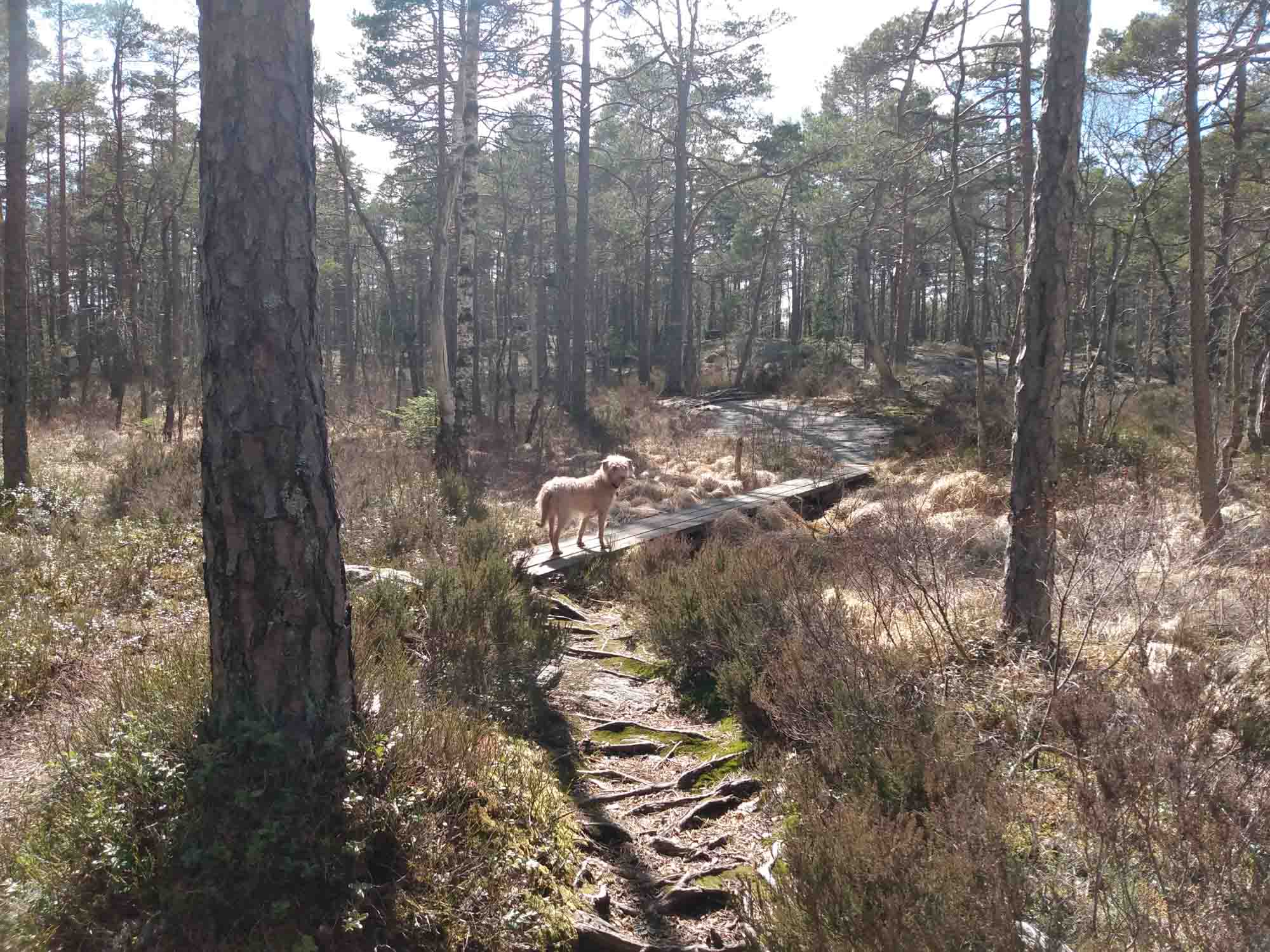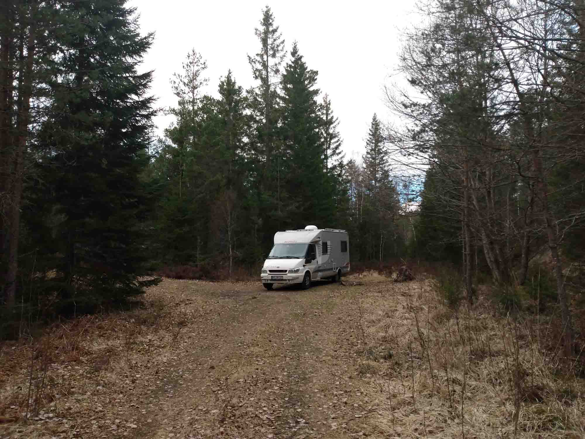 Nach einem morgendlichen Spaziergang durch den Wald, während dem wir noch einmal ein paar Granitfelsen hinaufkletterten und mit einem wunderbaren Blick über die waldige Küstenlandschaft belohnt wurden, fuhren wir nach Tanumshede, wo wir das letzte Mal vor Norwegen einen Dollarstore besuchten. Danach ging es weiter zum Nationalpark Tresticklan. Hier nahmen wir die rote Wanderroute die vom Parkplatz am östlichen Eingang bis zum 4,5 km entfernten westlichen Eingang des Parks führt. Dort gingen wir noch über eine Holzbrücke, die über einen Bach führte und waren in Norwegen. Berta lief die ganze Zeit frei und blieb vor uns auf dem Weg. Kurz nachdem wir uns während des Rückwegs darüber gefreut hatten, verschwand sie einige Zeit im Wald. Danach durfte sie ein Weilchen an der Leine bleiben. Zurück beim Parkplatz erkundeten wir zu Fuß eine Übernachtungsmöglichkeit, die noch einmal knapp 1 km entfernt war. Wir entschieden uns, den Platz anzufahren, obwohl die Fahrspuren sehr tief ausgefahren und unsere Bodenfreiheit an einigen Stellen wohl nicht ausreichen würde. Aber wir schafften es und wurden mit dem perfekten Platz belohnt: Einsam, nicht einsehbar und mitten in der Natur.