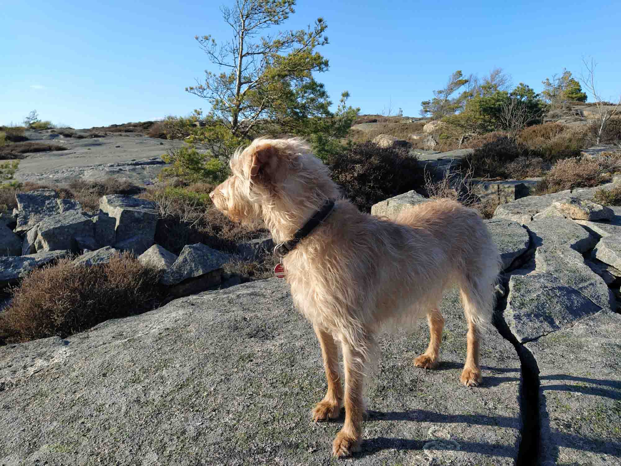Wir fuhren wieder zurück zur Küste und weiter durch die Scheerenlandschaft bis wir bei Lysekill einen einsamen Platz direkt unterhalb von Granitfelsen fanden, die wie in Fjällbacka mit Heide und Flechten bewachsen waren und über die sich Berta riesig freute. Sie rannte die Felsen geradezu hinauf und genoß mit uns von oben die herrliche Scheerenlandschaft, als die Sonne langsam unterging,