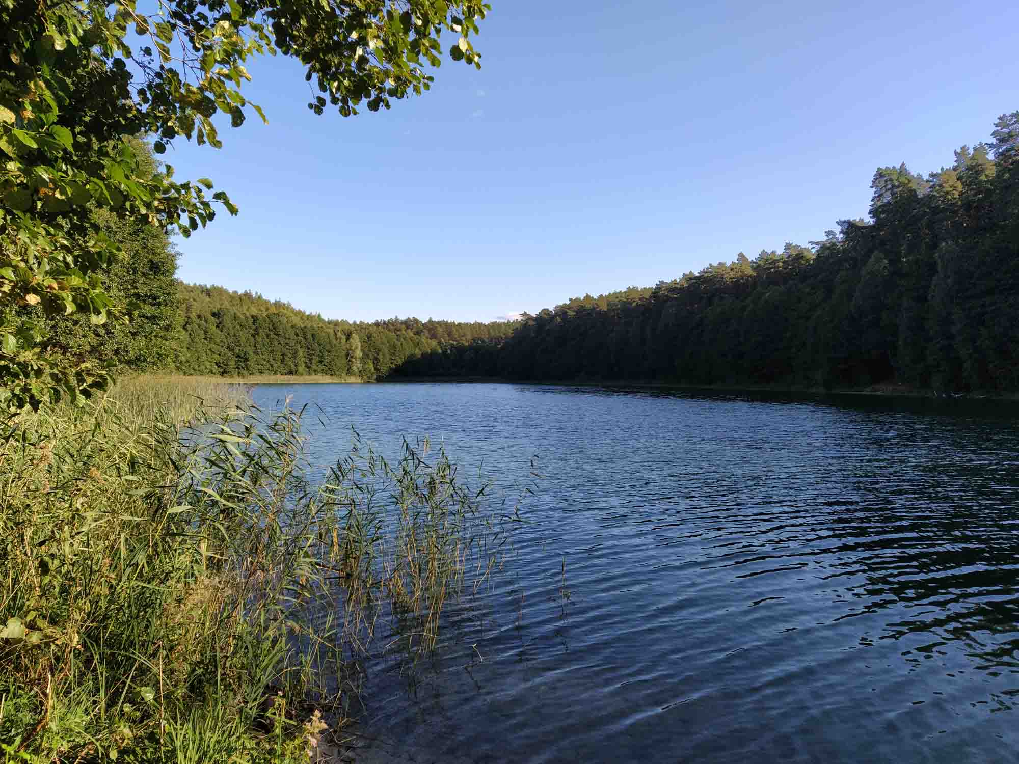 Um 6 Uhr war die Nacht vorbei. Es klopfte. Draußen stand ein Mann vom Sicherheitsdienst, der uns in pefektem polnisch erklärte, dass das hier Privatgelände sei und wir gefälligst verschwinden sollten. Sofort. 10 Minuten später waren wir unterwegs. Der Grund für den Überfall wurde klar, als wir durch das verlassene Campinggelände heraus fuhren. Es kamen uns zwei Lieferwagen und ein Autotransporter entgegen und unmittelbar vor unserem Übernachtungsplatz stand schon ein weiterer Wagen ohne Kennzeichen. Die herrlich ruhige Halbinsel wird wohl zu einem Park- oder Schrottplatz umgewandelt. Da hat uns die bisherige Nutzung sehr viel besser gefallen. Noch ziemlich müde fuhren wir als erstes den Bäcker im Dorf an, der zum Glück bereits offen hatte und versorgten uns mit zwei leckeren Teilchen. Nach einem kleinen Stopp zum Bezin und Gas tanken und einem weiteren für Frühstück und Spaziergang fanden wir ziemlich schnell einen schönen Picknickplatz im Wald. Es dauerte nicht mehr lang, bis aus den 6 Grad am Morgen angenehme 20 Grad geworden sind und dann konnten wir den Tag wieder draußen in der Sonne genießen.