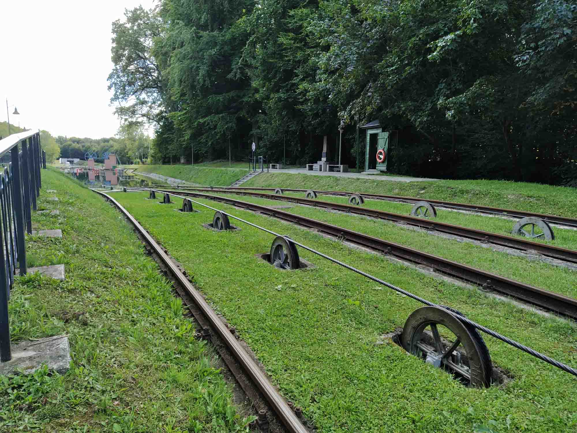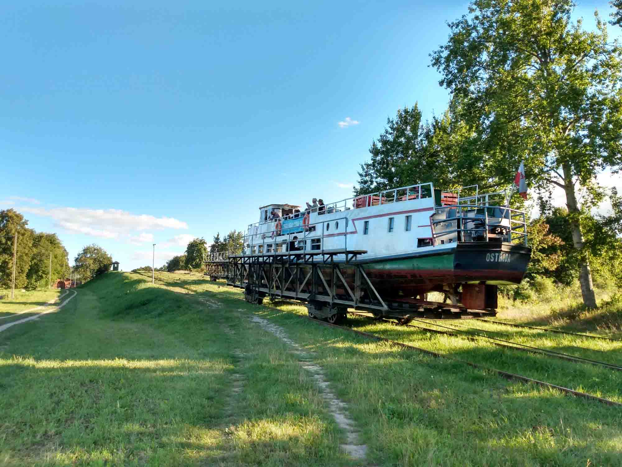 Es war schön, nicht um 6 Uhr geweckt zu werden. Trotzdem brachen wir zu unserem ersten Spaziergang bereits um 8 Uhr auf. Mit 3 Grad war es noch ziemlich kalt und die Nebelschwaden zogen langsam über den See. Ein toller Anblick, den wir ohne Hund vermutlich nicht gehabt hätten. Danach ging es weiter, erst zum Einkaufen in Olsztyn, danach zum Entsorgen, wobei wir unterwegs noch am Straßenrand anhielten und eine Tasche mit Äpfeln füllten und schließlich nach Buczyniec, wo wir uns am Oberländischen Kanal die Anlage ansahen, mit der die Ausflugsschiffe auf Schienen einen Berg hoch- oder heruntergefahren werden. Anschließend fuhren wir zu einer weiteren solchen Anlage bei Kąty und bekamen auch gleich das erste Schiff zu sehen, das gerade den Berg hinaufgezogen wurde. Unmittelbar neben den Schienen fanden wir sogar ein Plätzchen, wo wir über Nacht stehen konnten. Also machten wir es uns gleich gemütlich und beobachteten noch ein letztes Schiff, diesmal mit der Drohne, bevor der Schienenwärter in den verdienten Feierabend fuhr.