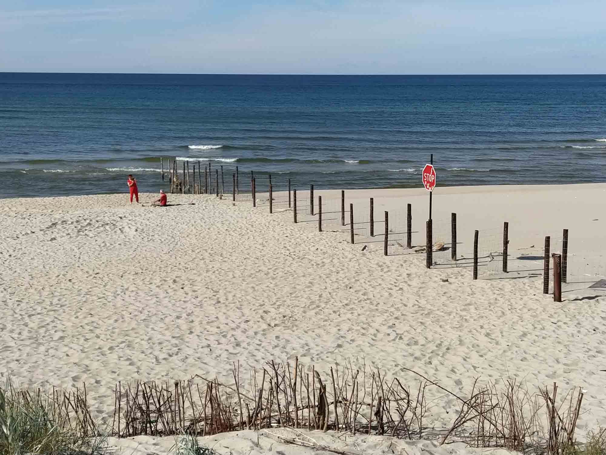 Der Wetterbericht für heute war ausnahmsweise mal richtig. Wir wurden vom lauten Prasseln auf das Wagendach geweckt. So wäre aus auch gar nicht so schwierig gewesen, diesen schönen Platz wieder zu verlassen, wäre da nicht diese niedliche kleine Katze gewesen, mit der sich Berta gestern sogar recht gut verstanden hatte. Ein noch ganz junges und anhängliches kleines Ding, das jetzt ganz einsam auf diesem kalten und nassen Platz bleiben würde. Schließlich waren wir die letzten hier. Wir überlegten hin und her und schließlich wagten wir einen Versuch, der allerdings mit einer Katze auf der Vorderachse und einer laut bellenden Hündin unter dem Wagen weiterging und mit der Katze an einem Baum mit einer davor bellenden Hündin endete. So war klar, dass Berta keine Katze neben sich dulden würde und wir fuhren dann doch ohne Katze los. Die Fahrt führte uns quer durch Danzig, das wir bereits kannten und weiter durch das östliche Kaschubien zurück an die Ostsee. Als wir bei Karwia einen Parkplatz direkt hinter der Düne fanden hatte der Regen bereits aufgehört. Also machten wir gleich noch einen ausgiebigen Spaziergang durch die bewachsenen Dünen, die genauso aussahen wie die Binnendünen in Lettland. Zurück gingen wir über den breiten Sandstrand, der sogar noch breiter war als der auf der kurischen Nährung.