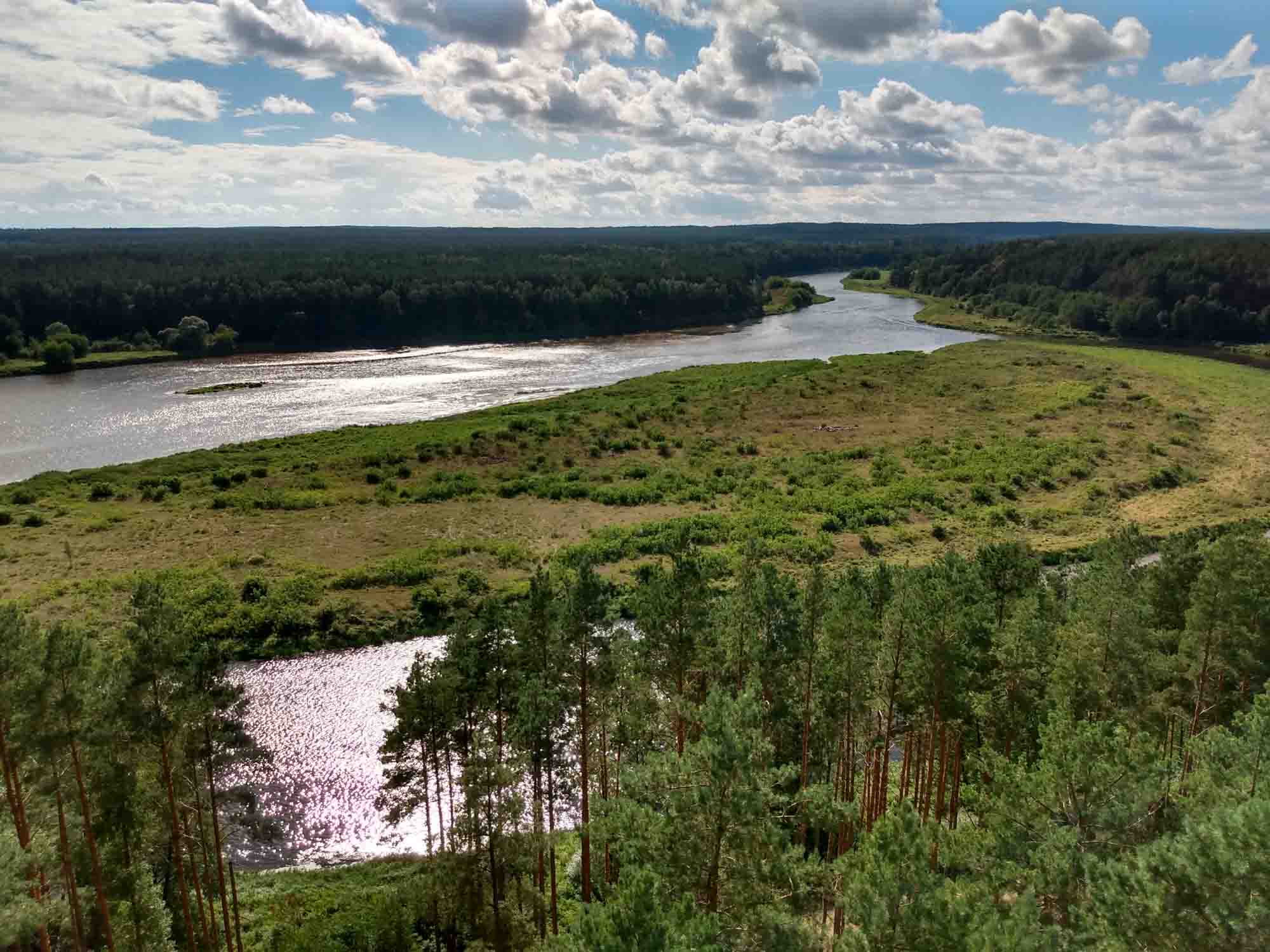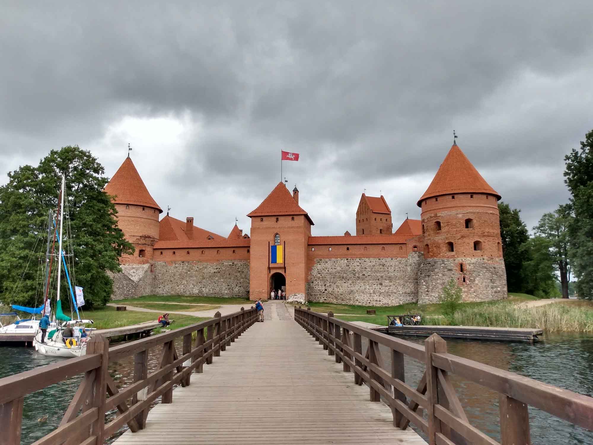 An dem Waldparkplatz, auf dem wir übernachtet hatten, ging zufällig ein 2,5 km langer Waldlehrpfad los, der die perfekte Morgenrunde war. Der Weg ging die meiste Zeit über Holzplanken und führte erst durch den dichten Kiefernwald, dann durch ein Moor und schließlich zwischen zwei Seen hindurch. Und alles noch vor dem Frühstück. Da es danach zu regnen begann, ließen wir es langsam angehen und kamen erst kurz vor Mittag los. Dafür schien dann auch schon wieder die Sonne. Unser erstes Ziel war die Wasserburg in Trakai. Im Ort bekamen wir den vermutlich einzigen kostenlosen Parkplatz, den es in dem hübschen, vorwiegend aus Holzhäusern bestehenden Ort gab. Die Wasserburg war ziemlich gut erhalten. Da Berta nicht mit hinein durfte, verzichten wir auf eine Besichtigung und gingen nur einmal um die Burg herum. Zu schade, dass es auch für die Drohne zu windig war. Danach fuhren wir nach Merkine. Unterwegs gab es mal wieder ein wenig Schotter. Aber die 18 km waren schnell vorbei. Merkine ist die älteste Siedlung in Littauen, wobei dies der Ortschaft nicht anzusehen ist. Es sind die gleichen Holzhäuser wie es sie überall im Land gibt. Aber es gibt dort einen Aussichtsturm, von dem man einen tollen Blick auf die Memel hat. Das Highlight des Tages war der Grūtas-Park. Hier sind die bereits 1991 abgebauten sowjetischen Denkmäler gesammelt worden. Zu dem Park gehören auch einige kleinere Museen sowie ein Tierpark. Obwohl Hunde im Park verboten sind, durfte Berta gegen Zahlung des Eintrittspreises für ein Kind mit hinein. Sie hatte viel Spaß mit den Tieren. Am meisten interessierte sie sich für die Emus. Aber auch die Strauße, Kängeruhs, Kaninichen, Schafe, Ziegen und Bären beäugte sie neugierig. Die Tiere waren genauso neugierig und kamen zum Zaun gelaufen, um Berta anzuschauen. Der Park war viel größer als der Memento-Park bei Budapest aber die Symbolik natürlich die gleiche. Lenin schien die Lieblingsskulptur gewesen zu sein. Aber auch Marx und Engels fehlten natürlich nicht. Nachdem alle Fotos geschossen waren fuhren wir nach Druskininkai zum Einkaufen und danach zum nächstgelegenen See. Es war spät geworden und wir freuten uns auf eine leckere Würstchenpfanne.
