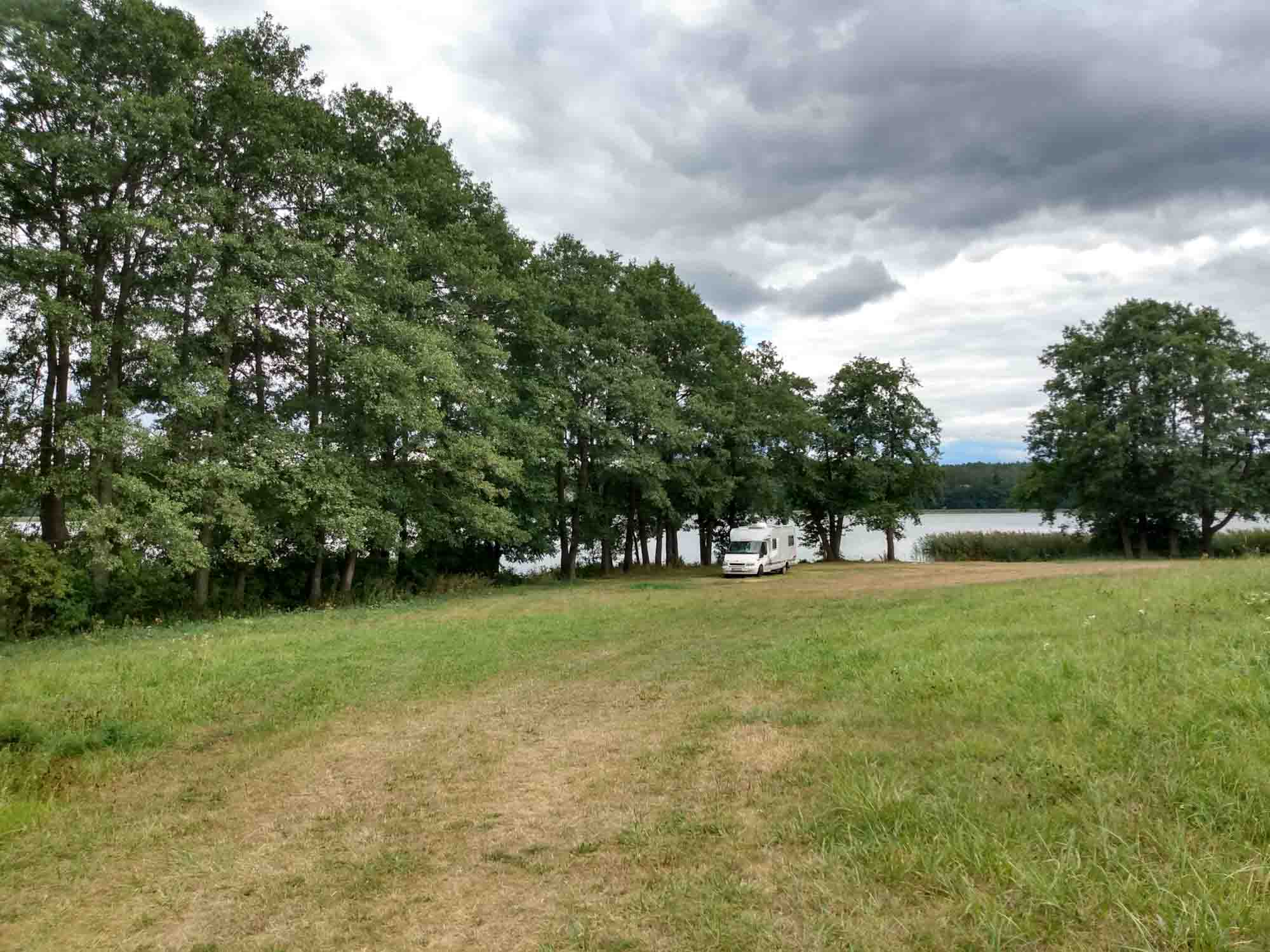 Die schöne Landschaft der Mazuren kannten wir schon aus dem letzten Jahr. Vor allem an den Seen versammelten sich die Polen in Schaaren. In diesem Jahr waren wir etwas später unterwegs und hofften auf ein wenig Ruhe. In der Nähe von Ryn fuhren wir zu einem Platz direkt am See, für den wir jedoch eine Pforte aus Draht öffnen mussten. Dafür verbrachten wir den Nachmittag direkt am Wasser bei allerschönstem Sonnenschein. Allerdings war die Ruhe zu Ende, als eine Horde Polen auf einem gecharterten Motorboot ausgerechnet direkt vor unserer Nase anlegen musste. Etwas ruhiger wurde es, als sich sich nach einiger Zeit auf ihr Boot zurückzogen und dort angelten. Gefangen haben sie nichts. Stattdessen versuchten sie nach Sonnenuntergang direkt vor unserer Tür einen Einweggrill zu entzünden und darauf Würstchen warm zu machen. In ihrem Zustand, mittlerweile hatten sie etliche Biere intus, war das offensichtlich nicht mehr ganz so einfach. Nachdem wir gegessen hatten, wollten wir uns das nicht länger antun und zogen kurzerhand auf einen oberhalb gelegenen Parkplatz um. Zum Glück waren die Männer am nächsten Morgen nicht mehr da und so konnten wir nach dem Frühstück wieder zu unserem alten Platz zurück. Dort blieben wir den Tag und verbrachten viel Zeit draußen in der Sonne, auch wenn es mit knapp 20 Grad plötzlich gar nicht mehr so warm war. Nach einem ordentlichen Spaziergang kam der Bauer vorbei, dem die Wiese gehörte. Aber gegen Zahlung eines kleinen Entgelts durften wir auch die nächste Nacht noch hierbleiben. Abends grillten wir mal wieder und diesmal kam niemend mehr mit dem Boot vorbei. Es kann auch ruhig sein in den Mazuren.