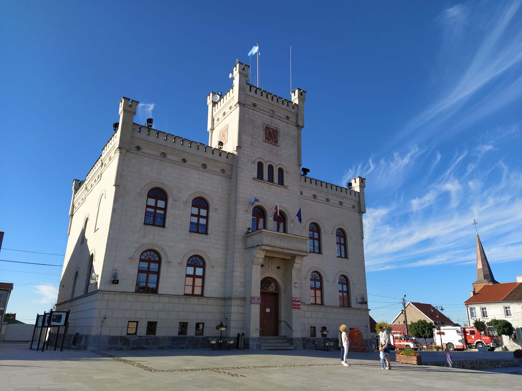 Auch wenn der Platz sehr schön war zog es uns dennoch weiter. Als erstes besuchten wir einen Bauernmarkt in Mragowo. Nachdem wir uns mit Bargeld versorgt hatten, kauften wir das eine oder andere ein bevor wir uns auf die Suche nach einem neuen Platz machten. Der Weg dorthin führte uns auf schönen kleinen Straßen quer durch die mazurische Landschaft. Bei Pasym nahmen wir einen schmalen Weg, der auf einen verlassenen Campingplatz auf einer kleine Halbinsel führte. Als wir ankamen stand dort bereits ein anderes Wohnmobil. Wir stellten uns aber soweit abseits, dass wir von den anderen zunächst nichts mitbekamen. Am zweiten Tag fühlte sich Aneta überhaupt nicht wohl und blieb stattdessen bis zum späten Nachmittag im Bett. Berta nutzte die Gelegenheit und machte Bekanntschaft mit unseren Campingnachbarn, die sich als sehr nettes Pärchen mit zwei Kindern herausstellten, die erst seit 3 Wochen unterwegs waren, sich vor kurzem das Wohnmobil angeschafft hatten und planten, den Winter in Griechenland und der Türkei zu verbringen. Am späten Nachmittag machten wir einen gemeinsamen Spaziergang in den kleinen Ort und bewunderten das Rathaus, das an eine kleine Burg erinnerte. Am Rathausplatz gab es auch einen mobilen Verkaufsstand für Pizza, der sogar einen Holzofen hatte. Dem konnten wir nicht widerstehen, kauften eine Pizza, nahmen sie mit zurück und vertilgten sie im Schein der Nachmittagssonne. Unsere Nachbarn waren in der Zwischenzeit abgereist und wir hatten die gesamte Halbinsel ganz für uns alleine.