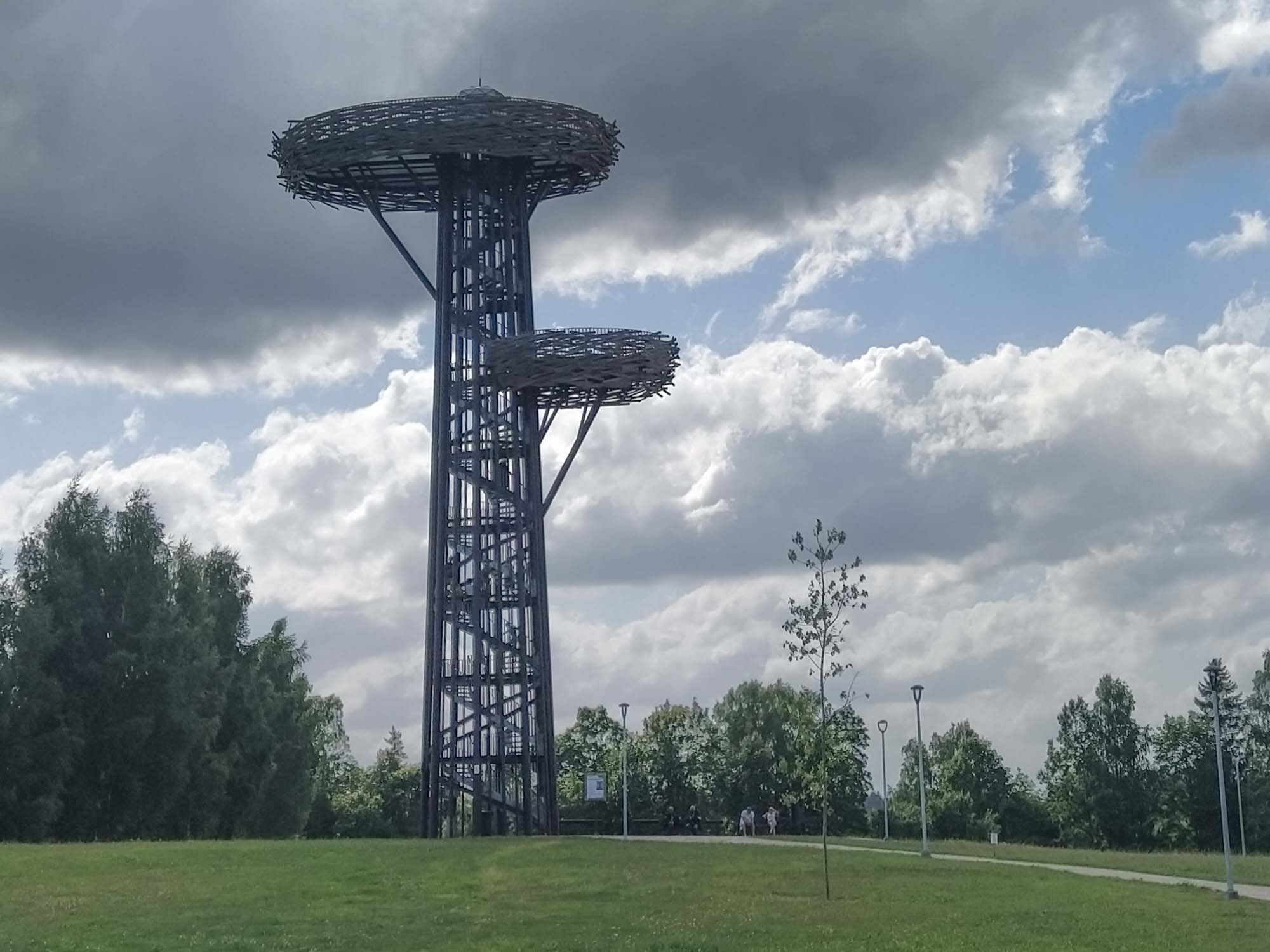 Noch ein letzter Spaziergang, dann verabschiedeten wir uns von dem Platz, der schon fast so etwas wie Heimat geworden war. Allerdings mussten wir vorher erst noch den Wagen gründlich vom feinen schwarzen Staub reinigen, der sich in den letzten Tagen auf dem Fußboden angesammelt hatte. Aber dann ging es los, zunächst nach Tartu, wo wir Frischwasser tankten und erstmal einkaufen gingen. Dann ging es weiter durch den estnischen Wald nach Rõuge zu einer Aussichtsplattform in der Form von einem Storchennest. Viel zu sehen gab es hier nicht, aber die Plattform selbst war eindrucksvoll genug. Über Krabi fuhren wir auf der 108 wieder nach Lettland. Das diese Straße eine Nummer hatte, war schon überraschend, war es doch nicht mehr als ein sandiger Feldweg. Entsprechend überschaubar stellte sich auch die Grenze dar. Zwei Schilder am rechten Sandwegrand, eines mit dem Europazeichen und dem Schriftzug "Latvia" und ein weiteres mit den Geschwindigkeitsbegrenzungen. Dann waren wir wieder in Lettland. Hinter dem nächsten Hügel wartete aber noch eine kleine Überraschung auf uns: Eine freundliche Dame vom Grenzschutz wartete vermutlich schon den ganzen Tag auf ein Auto, dass sie kontrollieren konnte und da waren wir. Freundlich bat sie uns, etwas ins Gras zu fahren und hinter ihrem Wagen anzuhalten. "Ausweis, Führerschein, Fahrzeugpapiere und Versicherungsnachweis," sagte die junge Frau. "Versicherungsnachweis?" überlegten wir, "was für ein Versicherungsnachweis?" "Die grüne Versicherungskarte," kam die Antwort bevor wir fragen konnten. Fragte sich nur, wo die war. Sie fand sich zum Glück ohne großes Suchen bei unseren restlichen Unterlagen zum Wohnmobil und dann verschwand sie mit allen Ausweisen in ihrem Van. Nach kurzer Zeit kam sie zurück, wünschte uns eine gute Fahrt und wir konnten weiter. Nach zwei Kilometern ließen wir einen Wagen passieren, wie wir es öfter mal tun, wenn die Straße schlecht ist und wir entsprechend langsam unterwegs sind. Es war die Polizistin, die jetzt wohl Feierabend gemacht hatte und sich mit der Warnblinkanlage für das Vorbeilassen bedankte. In Kometi fanden wir zufällig eine Entsorgungsstation, wo wir das verbrauchte Wasser ordnungsgemäß entsorgen konnten. Danach wanderten wir noch auf den mit 247 m MSL höchsten Hügel von Veclaicene, wie die Landschaft hier heißt, von dem aus wir bis nach Estland sehen konnten und zu einem "Burgberg", auf dem sehr vielleicht mal eine Burg gestanden haben könnte. Eigentlich war er dazu viel zu klein und irgendwelche Reste einer Burg waren auch nicht zu sehen. Aber das eigentliche Highlight kam erst noch. Auf der Herfahrt, waren wir an einem Spielplatz vorbeigekommen, dessen Parkplatz uns für eine Übernachtung geeignet erschien. Zumal er direkt am Sandweg lag, der nach Krabi in Estland führt und entsprechend ruhig dürfte es hier sein. Als wir gerade den Platz erkundeten, kam der Besitzer vorbei und fragte uns, ob wir hier übernachten wollten. Als wir das bejahten, lud er uns ein, mit dem Wohnmobil auf die große Rasenfläche des Spielplatzes zu fahren, drückte uns noch ein paar Flyer mit Sehenswürdigkeiten aus der Gegend in die Hand und verschwand dann genaus so schnell wieder, wie er gekommen war. Wir konnten unser Glück kaum fassen. Wir standen jetzt mittem im Grünen, fernab der Straße und kaum mehr zu sehen auf einem Kinderspielplatz. Naturlich ließen wir es uns nicht nehmen, einmal Karrussel zu fahren und die Wippe auszuprobieren. Berta kam bei einem Abendspaziergang durch den benachbarten leerstehenden Bauernhof auch noch auf ihre Kosten. Auf einem der Schornsteine hatte ein Stochenpaar ein großes Nest gebaut aus dem ein Storch erst auf uns herunterblickte und dann zum Abendessen ausflog.