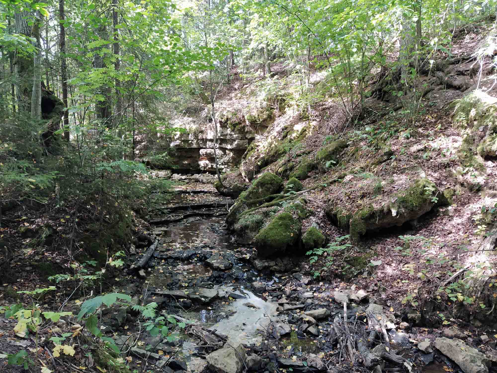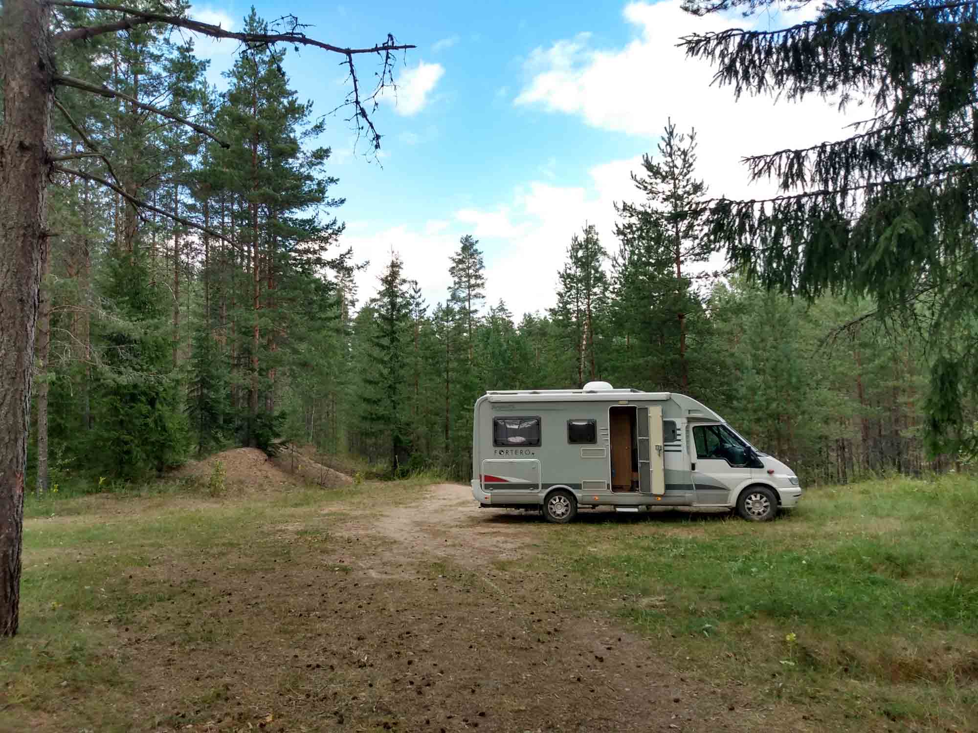 Morgens ließen wir uns viel Zeit und ließen Berta noch ein bisschen schlafen bevor wir uns langsam auf den Weg nach Westen immer entlang der lettisch-estnischen Grenze machten. Hinter Rüpnieki bogen wir nach rechts ab und ab dem Zeitpunkt fuhren wir dem Grenzverlauf weiter folgend nur noch auf Schotterstraßen. Kilometerlang und unglaublich staubig. Entgegenkommende Fahrzeuge warfen mit Steinen und zogen eine große Staubwolke hinter sich her. Verlangsamen ist hier ein Fremdwort und eingenebelt wird alles, was sich auf diese Straßen verirrt hat: Entgegenkommende Wohnmobile genauso wie Radfahrer, Fußgänger, Mopedfahrer und natürlich die Büsche und Bäume rechts und links der Straße. Nach einer halben Stunde kamen wir bei unserem ersten Ziel, der Schlucht von Kalamecu-Marküzu an. Es war noch ein kleiner Fußweg von knapp 500 m bis dorthin und dann standen wir mitten in der "Schlucht", die sich als an paar Felsen entlang eines fast ausgetrockneten Bachlaufs erwies. Aber ungefähr das, was man von einer lettischen "Sehenswürdigkeit" erwarten kann. Danach folgten wir der Schotterstraße für weitere 30 km und kamen bei einem Turm an, von dem wir dachten wir könnten von dort aus die größten Binnendünen Lettlands sehen. Aber außer Feldern und dem zugegebenermaßen sehr schönen Kiefernwald der Region Cirgalu sahen wir nichts. Aufschluß gab dann die Informationstafel auf dem kleinen Parkplatz des Turms. Wir stellten uns unter Dünen große Sandhaufen, wie etwa die Düne von Pyla in Frankreich oder die Düne bei Leba in Polen vor. Die Dünen in Cirgula bestehen natürlich auch aus Sand, sind aber wohl vor allem für Geologen interessant, befinden sie sich doch unter einer dünnen Schicht aus Moos und Büschen und sind von einem lichten Kiefernwald bewachsen. Auf der Karte war jedoch auch ein Picknickplatz eingezeichnet der unweit eben dieser Dünen an einem kleinen See lag. Dorthin führte ein kleiner Waldweg durch den schönen Kiefernwald und unser Wohnmobil passte gerade so durch. Aber hierhin würde sich so schnell niemand verirren und so verbrachten wir einen wunderbar ruhigen Nachmittag im Wald am See. Bei einem Spaziergang zu den Dünen erkannten wir dann auch das, was wir vorher auf der Tafel gesehen hatte. Niedliche kleine Hügel, die wunderbar gleichmäßig von hohen Kiefern bewachsen waren. Unten Moos und Flechten und dazwischen Blaubeeren die wieder mal sehr lecker waren und die Hände lila färbten.