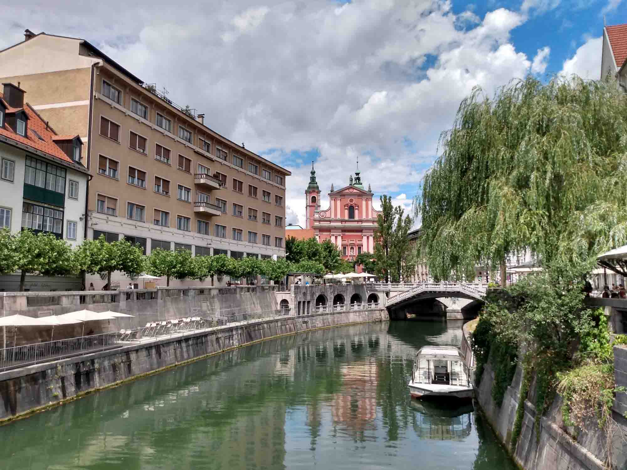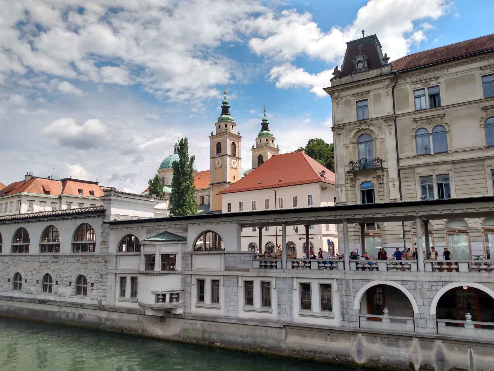 In der Nacht gab es heftige Gewitter und wir haben alle sehr unruhig geschlafen. Berta war ebenfalls aufgewacht und wollte etwas beruhigt werden. Morgens waren wir alle noch etwas müde. Trotzdem brachen wir zeitig auf und fuhren als erstes zu einem Tierarzt um ein Mittel gegen die vielen Zecken zu besorgen, die es hier überall gibt. Auch wenn wir inzwischen sehr viel Übung beim Entfernen der fiesen Blutsauger haben, ist das Risiko einer Infektion einfach zu groß. Die Tierärztin in dem kleinen Dorf war ausgesprochen nett und kompetent und klärte uns über die verschiedenen Möglichkeiten auf. Wir entschieden uns insbesondere wegen Bertas häufigen Badens in kalten Bergbächen für die Tablette, die sie anschließend auch gierig schluckte. Danach fuhren wir zur Dovžan Gorge, einer Schlucht, die uns unser letzter Gastgeber als Alternative zur völlig überfüllten Vintgar-Schlucht empfohlen hatte. Das Wasser tobte hier sehr laut, aber die Wanderung entlang der Stromschnellen des kleinen Flusses war eher kurz. Nach oben endete sie hinter einem versteckten Dorf mit einer Brücke wieder an der Straße und nach unten an in den Felsen eingelassenen Eisensprossen, über die ein Mensch noch ganz gut klettern kann, wenn er sich an dem darüber befestigten Stahlseil festhält. Für Berta war es jedoch unmöglich. Das nächste Ziel war die Hauptstadt Ljubljana. Den Wagen konnten wir unweit der Altstadt abstellen und dann gingen wir zwei Stunden durch die sehr hübsche Stadt. Unterwegs aßen wir noch ein Eis und genehmigten uns noch einen Espresso und einen Cappuchino. Zum Schlafen ging es wieder in die Berge. Heute standen wir in Radegunda, an der Talstation der Gondel, die zu einem Skigebiet herauffährt. Die zahlreichen Parkplätze können im Sommer von Wohnmobilen genutzt werden. Hier standen wir mit zwei weiteren Wagen dann endlich wieder fast frei.
