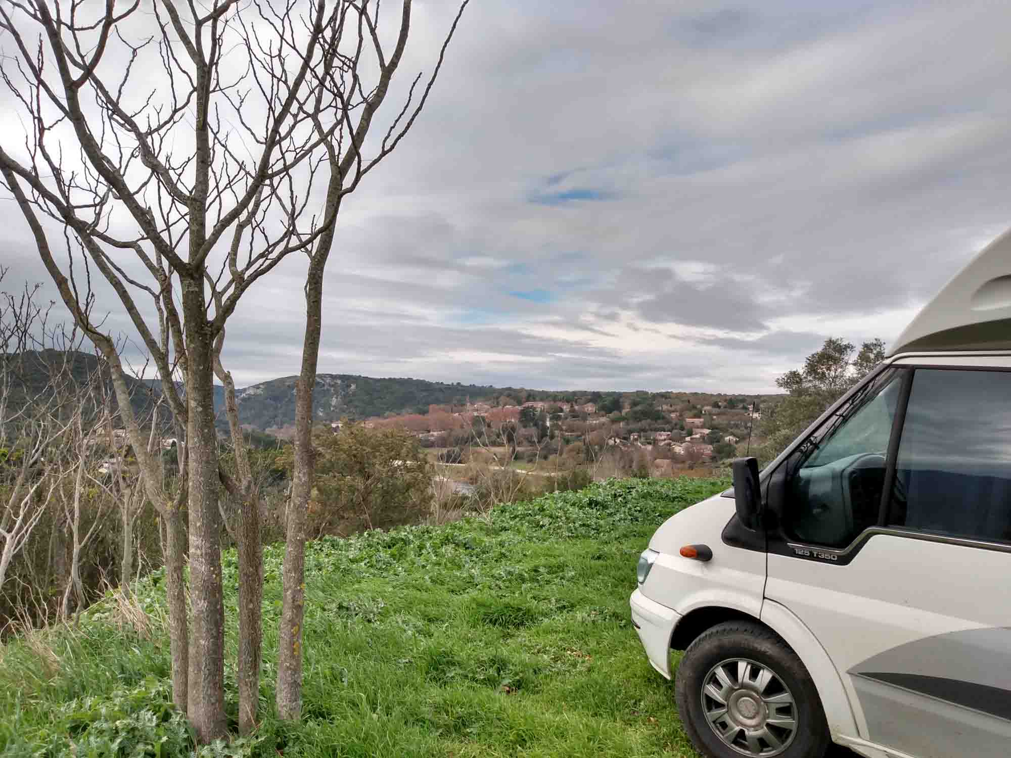 Die Nacht war kalt. Sehr kalt. Und wir konnten die Kälte unmittelbar spüren, als wir nachts aufgrund der eisigen Temparaturen im Wohnmobil aufwachten. Die Heizung war ausgefallen. Aber zum Glück haben wir es bemerkt, bevor das Sicherheitsventil unser Wasser auslaufen ließ. Die Störung war durch Aus- und Wiedereinschalten schnell beseitigt und wir konnten erstmal weiterschlafen. Zumindest solange, bis sie das nächste mal ausfiel. Das war um 6:40 Uhr. Damit war auch der Grund für den Ausfall klar: Unser Gas war schon wieder leer. Michael zog sich schnell an und ging nach draußen, um die Ersatzflasche anzuschließen. Berta schaute nur kurz hoch und legte sich gleich wieder hin. Es war ihr wohl noch zu früh. Danach wurde es schnell wieder warm und wir schliefen noch drei Stunden weiter. Ansonsten alles wie gehabt: Morgenspaziergang, Frühstück, Losfahren, Gas auftanken, Wein kaufen (wir haben 5 Kartons bekommen), Weiterfahren, Nochmal einkaufen (Wasser, Gemüse), Noch etwas weiterfahren und endlich, es war bereits nach 19 Uhr, ankommen. Angekommen sind wir auf einer auf einem Berg gelegenden Wiese in der Nähe von Bellegarde-Poussieu von der aus wir einen tollen Blick bis zur Ardèche hätten, wenn die Sonne nicht schon untergegangen wäre. Hier lag sogar noch ein bisschen Schnee. Beim Abendspaziergang machten wir mit Berta noch ein paar Suchspiele und stellten fest, das sie inzwischen wunderbar auf das Kommando "Such" reagiert. Sie weiß genau, was zu tun ist und findet mit ihrer Schnüffelnase zielgerichtet ein ausgelegtes Leckerli. Ist schon süß, die Kleine. Danach gab es (Abend-)brot und Spiele und eine mit Sicherheit wieder warme Nacht.