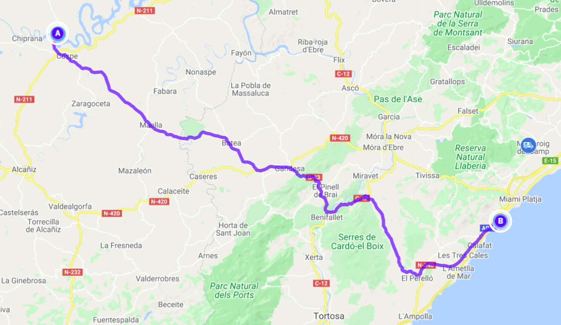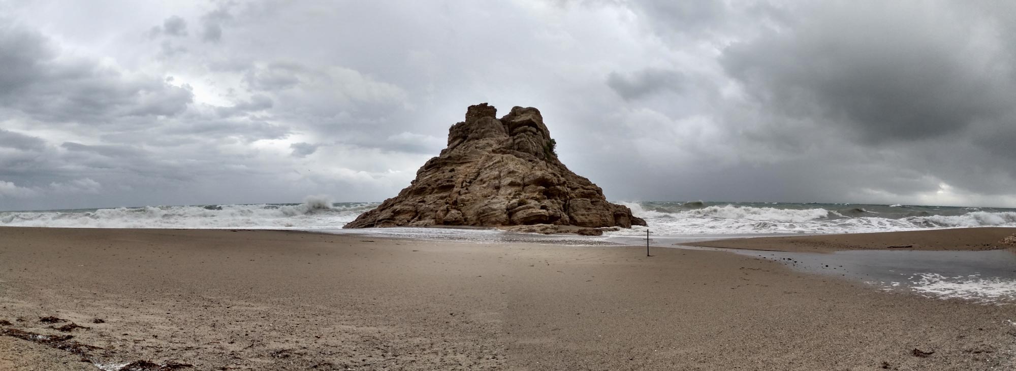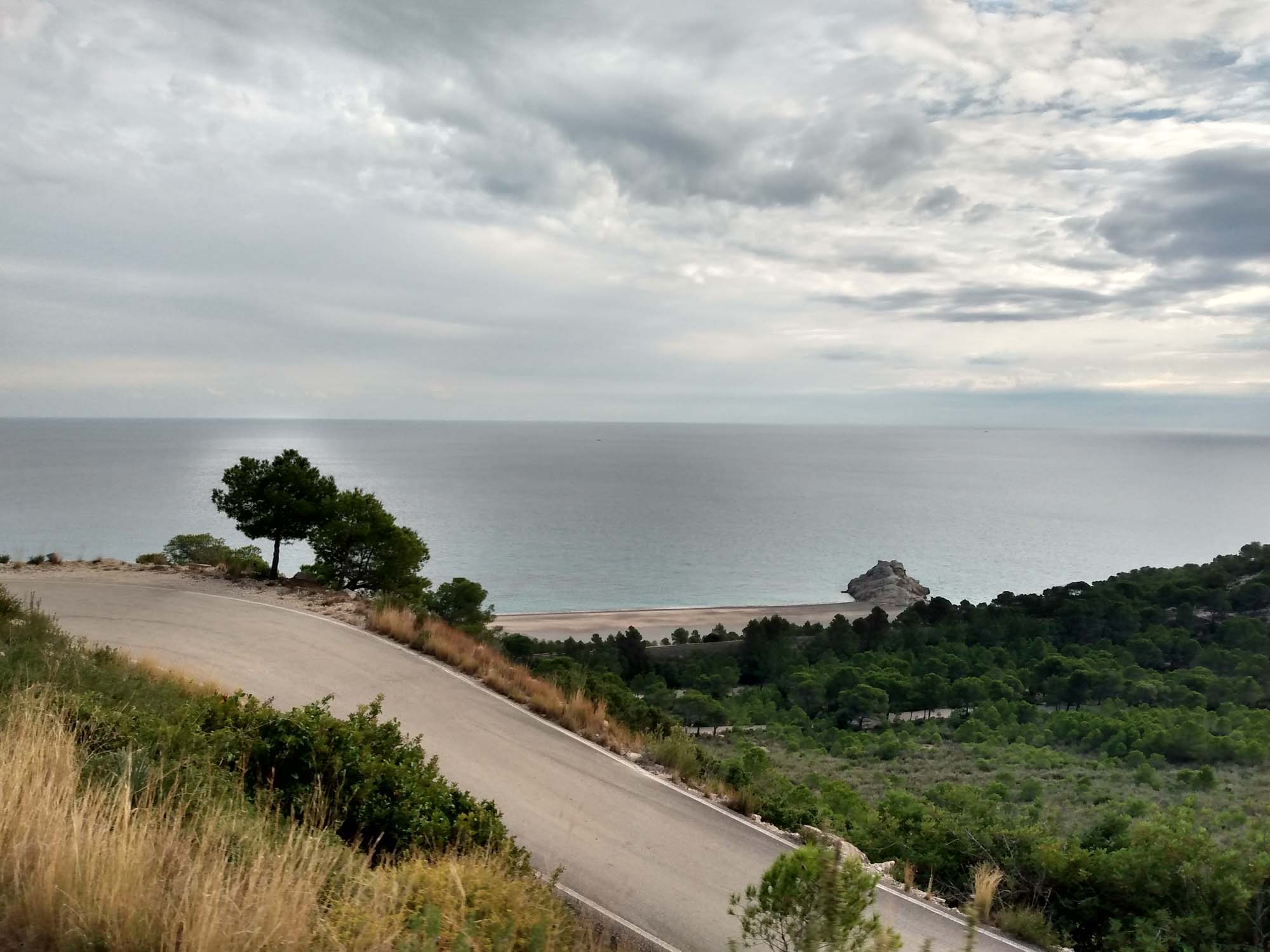 Auch in dieser Nacht hatte es fleißig geregnet und für den Morgenspaziergang mussten wir eine kleine Regenpause abpassen. Aber wir blieben trocken. Bei diesem Wetter blieb uns nur eines übrig: Weiterfahren. So fuhren wir an der Küste entlang in Richtung Barcelona. Unterwegs erledigten wir noch ein paar Einkäufe. In Cambrils hielten wir bei Lidl und in Salou noch einmal bei Mercadona. Berta wartete jeweils im Auto. Als wir bei Mercadona fertig waren, fiel wieder der Himmel auf uns herab. Es regnete in Sturzbächen und gleichzeitig gab es Blitz und Donner. Nach 10 Minuten hatte der Regen nachgelassen und wir gingen zum Wagen zurück. Berta war erfreut uns zu sehen, aber glücklicherweise keineswegs verängstigt. Als wir weiterfuhren, konnten wir die Folgen des kurzen aber heftigen Gewitters erleben. Vor uns war ein Kreisverkehr von Polizisten abgesperrt worden, der vollständig unter Wasser stand. Einige Fahrzeuge kamen uns zwar noch entgegen, aber die waren so tief unter Wasser, dass selbst das Nummernschild nicht mehr zu sehen war. Wir wurden nach rechts abgeleitet und fuhren einmal im Kreis. Google sagte uns schnell, dass wir so nicht in die gewünschte Richtung kommen würden. Hier ging es nur zum Strand, dann nach rechts und zurück, von wo wir gekommen waren. Kurzerhand bogen wir noch einmal rechts ab, vollendeten den Kreis und kamen aus einer nicht abgesperrten Richtung zu eben diesem Kreisverkehr, der natürlich noch immer unter Wasser stand. Wir wollten es trotzdem versuchen. Als wir schon tief ins Wasser gefahren sind, wurden wir doch etwas unsicher. Im Kreisverkehr standen mehrere Fahrzeuge, darunter ein Transporter mit eingeschalteter Warnblinkanlage, die offensichtlich abgesoffen waren. Stehenbleiben ging nicht mehr, zurück auch nicht. Also die Flucht nach vorn. Der erste Gedanke war, die erste Ausfahrt des Kreisverkehrs zu nehmen. Aber hier stand die gesamte Straße unter Wasser. Also die nächste Ausfahrt. Dort ging es etwas bergauf. Wir fuhren an den stehengebliebenen Fahrzeugen vorbei und unter den Augen der Polizisten, die den entgegenenkommenden Verkehr aufgehalten hatten und all der Fahrer in den wartenden Autos fuhren wir das letzte Stück durch das Wasser im Kreisverkehr und gemütlich auf der anderen Seite wieder hinauf. Wir hatten es tatsächlich geschafft. Die weitere Strecke war dann wieder entspannter. Unmittelbar an der Küste schien die Sonne. Nur wenn wir den Blick nach links in das Landesinnere wandten, war der Himmel grau. Also schauten wir einfach häufiger in Richtung des Meeres und freuten uns über das gute Wetter. Das war sogar so gut, dass wir noch einmal am Strand anhielten und einen Strandspaziergang machten. Danach wollten wir einen Stellplatz in der Nähe von Panta del Foix anfahren. Hier wurden wir jedoch an einer Furt aufgehalten, durch die nicht nur sehr viel Wasser floss, sondern in der auch ein Baum und einiges an Gestrüpp lag, was eine Weiterfahrt unmöglich machte. Zum Glück konnten wir an dieser Stelle gerade noch wenden auch wenn es mal wieder extrem eng war. In Villafranca del Penedes suchten wir noch eine Entsorgungsstation auf und endeckten, dass es dort freies WLAN gab. Das nutzten wir aus und versorgten unsere Berta währendessen vor Ort. Tasächlich haben wir dann an einem Friedhof in einem süßen kleinen Örtchen namens Saint Miguel d'Olèrdola übernachtet. Völlig allein und ungestört, wie wir es lieben.
