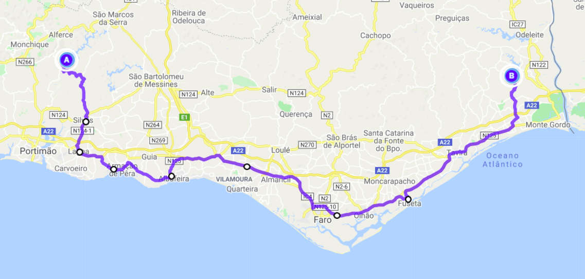Der Platz war schön, abgelegen und von zwei Wanderen und ein paar Autos abgesehen auch wunderbar einsam. Aber wir wurden gestern derart von Fliegen überfallen, dass es so gar keinen Spaß machte, draußen zu sitzen. Also machten wir auch heute keinen Pausentag, sondern fuhren einfach weiter. Es ging als erstes zum Leuchttum am Cap von São Vicente. Der Nationalpark, der auch hier am Küstenstreifen eingerichtet wurde, ist auch hier eher langweilig und triest. Wenn es Bäume gibt, dann Eukalyptus, aber auch diese wurden immer spärlicher. Die Ortschaften wirkten recht ärmlich: Eindeutig keine touristisch sonderlich bedeutsame Region. Am Leuchtturm dann das komplette Gegenteil. Für unsere Verhältnisse Schaaren von Touristen, darunter viele Deutsche,. Sie alle wollten wie wir das südöstlichste Ende Europas gesehen haben. Wirklich voll war es natürlich nicht, aber deutlich mehr, als wir es aus den letzten Wochen gewohnt waren. Wir fuhren weiter an der Küste entlang nach Lagos, wo wir über eine Holztreppen zum Praia do Camillo herunterstiegen. Dieser kleine Strand liegt malerisch in der sandsteinfarbenen Küste. Aus dem Wasser ragen imposant einzelne Felsen empor. Auf dem kleinen Sandabschnitt tummelten sich zahlreiche Sonnenanbeter und auch einige Wasserratten konnten es trotz der eisigen Wassertemperatur nicht lassen, baden zu gehen. Uns genügte es, die Füße vom Meer benetzen zu lassen. Über Portimão fuhren wir weiter zum Castelo de São João do Arade. Hier liegt eine kleine Festung direkt an einem Strand. Allerdings liegt der Strand an der Flußmündung der Arade, auf deren anderen Seite die Stadt Portimão liegt. Nicht unbedingt ein Ausblick, den man haben möchte, wenn man sich am Strand aufhält. Wir zumindest bevorzugen am Strand das Zimmer mit Meerblick. Danach ging es wieder ins Landesinnere. Über Silves, wo es auch eine Festungsanlage gibt, die wir uns in den nächsten Tagen noch ansehen wollen, fuhren wir in die Berge, um dort im Hinterland einen Übernachtungsplatz zu finden. Dabei ging es erneut auf sandigen und steinigen Pisten steil bergauf und vielleicht noch etwas steiler wieder bergab, durch ein kleines Dorf, wo wir das Gefühl hatten, direkt durch ein Wohnzimmer zu fahren, an einem staunenden Mann vorbei, der auf dieser Straße vermutlich noch nie ein Wohnmobil gesehen hat. Aber irgendwann kam der Asphalt wieder und wir waren durch. Na ja, fast. Denn dann kam diese Brücke, die wohl deshalb so extrem schmal war, um große Autos, wie unseres davon abzuhalten, in die Straße hineinzufahren, aus der wir gerade kamen. Aber zum Glück war sie gerade breit genug, dass wir darüber fahren konnten, denn zurück hätten wir beide beim besten Willen nicht gewollt. Ein kurzes Stück danach fanden wir an einer Straße, die an einem Stausee endete, einen Picknickplatz, wo wir uns häuslich einrichteten.