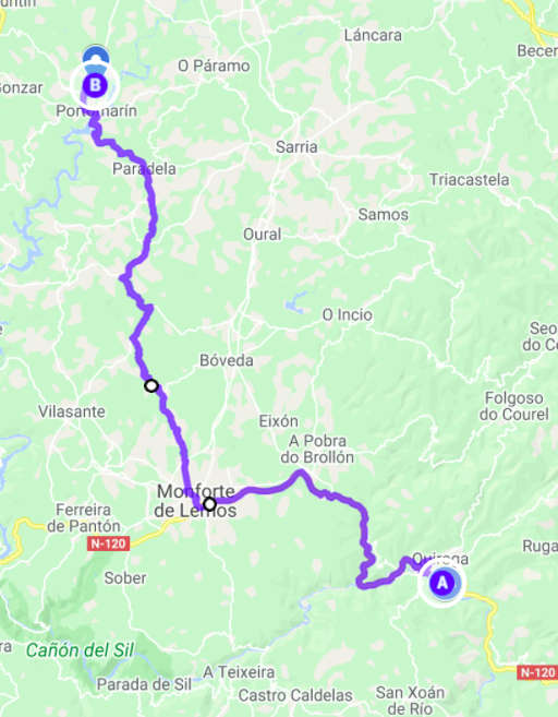 Letzte Nacht brauchten wir nicht zu heizen. Es wurde nicht kälter als 15 Grad. Komisch. Warum es nur 100 km weiter östlich gefroren hat, bleibt uns ein völliges Rätsel. Sei es drum. Aber was auch hier normal ist: Morgens Regen. Pünktlich um halb acht. Laut und prasselnd. Aber auch irgendwie schön, nicht aufstehen zu müssen. Als wir losfuhren hatte es wieder aufgehört, die Sonne schien und es waren die perfekten 24 Grad. Über Monforte de Lemos, wo wir ausgiebig einkauften, fuhren wir in Galizien nordwärts bis in die Nähe von Portomarin, wo wir uns in einem Wald einen wunderbar einsamen Platz ausgesucht haben. Die Strecke war sehr schön. Die Landschaft ist hügelig und bewaldet. Entsprechend abwechslungsreich war die Fahrt. Wir kamen auch an einigen Stellen vorbei, wo vor kurzem noch Waldbrände gewütet haben mussten. An den benachbarten baumlosen Bergen kann man erahnen, wie diese Berge in ein paar Jahren aussehen werden, wenn die verkohlten Baumstümpfe zerfallen und Gras darüber gewachsen ist. Je weiter wir nach Norden kamen umso mehr Felder mengten sich zwischen den Wald. Es sind kleinere Betriebe und ebenso kleine Felder, auf denen Rinder grasen und Wein oder Mais angebaut wird. Überall stehen Obstbäume an denen fast reife Früchte hängen: Äpfel, Orangen, Feigen, Birnen, Pfirsiche, Pflaumen und natürlich Maronenbäume. An unserem Platz angekommen packten wir den Grill aus, und grillten uns als erstes eine kleine Vorspeise bestehend aus 4 großen Scampis, die es so tiefgekühlt einzeln bei Lidl zu kaufen gibt. Als Hauptgang gönnten wir uns eine große Lachsforelle. Dazu gebratenen dünnen grünen Spargel. Man könnte meinen, wir wärem im Paradies angekommen, so lecker war es.