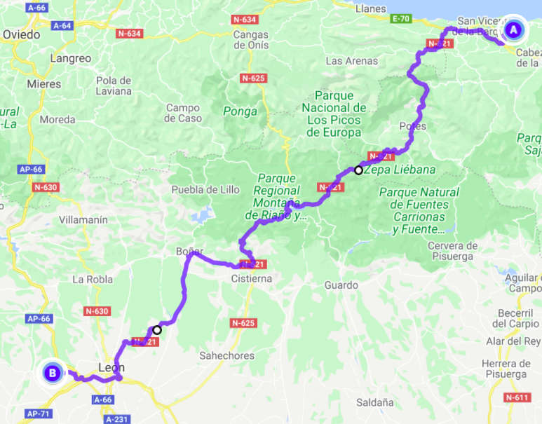 Regen, Regen, Regen. Nichts als Regen. Und der Himmel grau in grau. Keine Besserung in Sicht. Gut, dass wir mit dem Wohnmobil unterwegs sind und nicht mit dem Motorrad oder zu Fuß, wie die vielen Wanderer auf dem Jakobsweg, die wir unterwegs gesehen haben. Es schüttete ununterbrochen, als wir auf der N-634 gen Westen und kurz danach auf die N-621 in Richtung Süden fuhren. Diese Route führt über Panes und Potes, zwei sehr schöne Bergdörfer. Dazwischen aber liegt der Nationalpark Desfiladero de La Hermida. Die Straße führt hier entlang eines kleinen Flusses durch eine ziemlich hohe Schlucht, die beinahe an die von Verdon erinnert. Danach schängelte sich die Straße langsam bergauf, bis wir bei Portilla de la Reina den Pass bei 1609 m passierten. Hier bekamen wir fantastische Ausblicke auf die hier wunderschöne Landschaft. Besonders schön wurde es, weil es endlich aufklarte, als wir den Pass passiert hatten und in Richtung León fuhren. Die Sonne war wieder da und es wurde schlagartig wärmer. Die bergige Landschaft wechselte zu sanften Hügeln, von denen wir beim Herunterfahren immer wieder einen weiten Blick bis zum Horizont bekamen. Landschaftlich war diese Fahrt die Schönste, die wir bisher in Spanien hatten. In León schauten wir uns noch kurz die Kathedrale an. Es war bereits spät geworden und die Suche nach einem Stellplatz dauerte heute länger, als uns beiden lieb war. Der avisierte Platz war viel weiter von León weg, als wir gedacht hatten und war dann auch nicht erreichbar, weil die Zufahrt so eng und steil war, dass wir mit Sicherheit hinten aufgesetzt hätten. Also fuhren wir wieder in Richtung León zurück und fanden dann zum Glück abseits der Straße ein ruhiges Fleckchen. Es war dann aber auch schon 20:30 Uhr so machten wir uns nur noch schnell etwas zu essen.