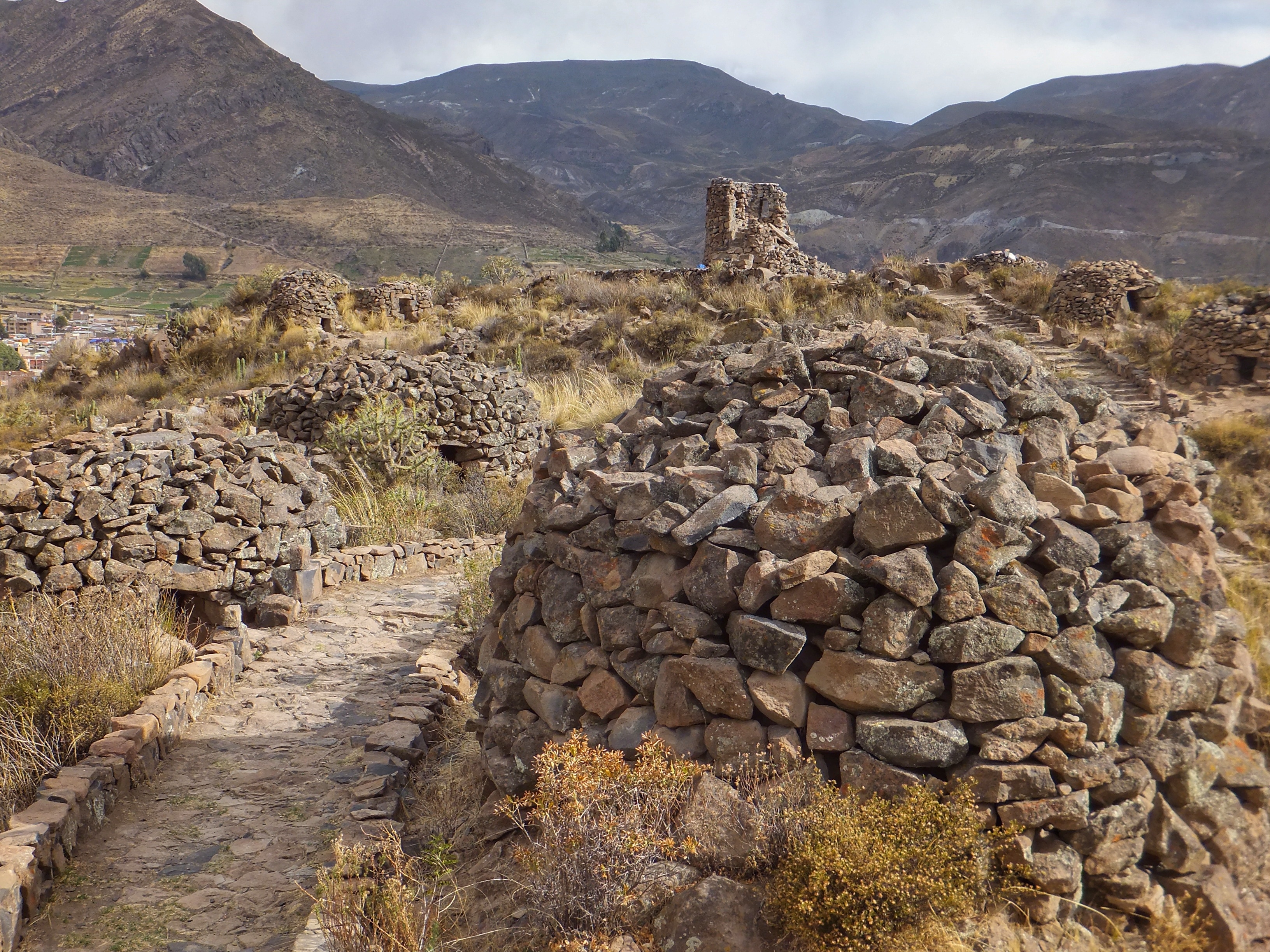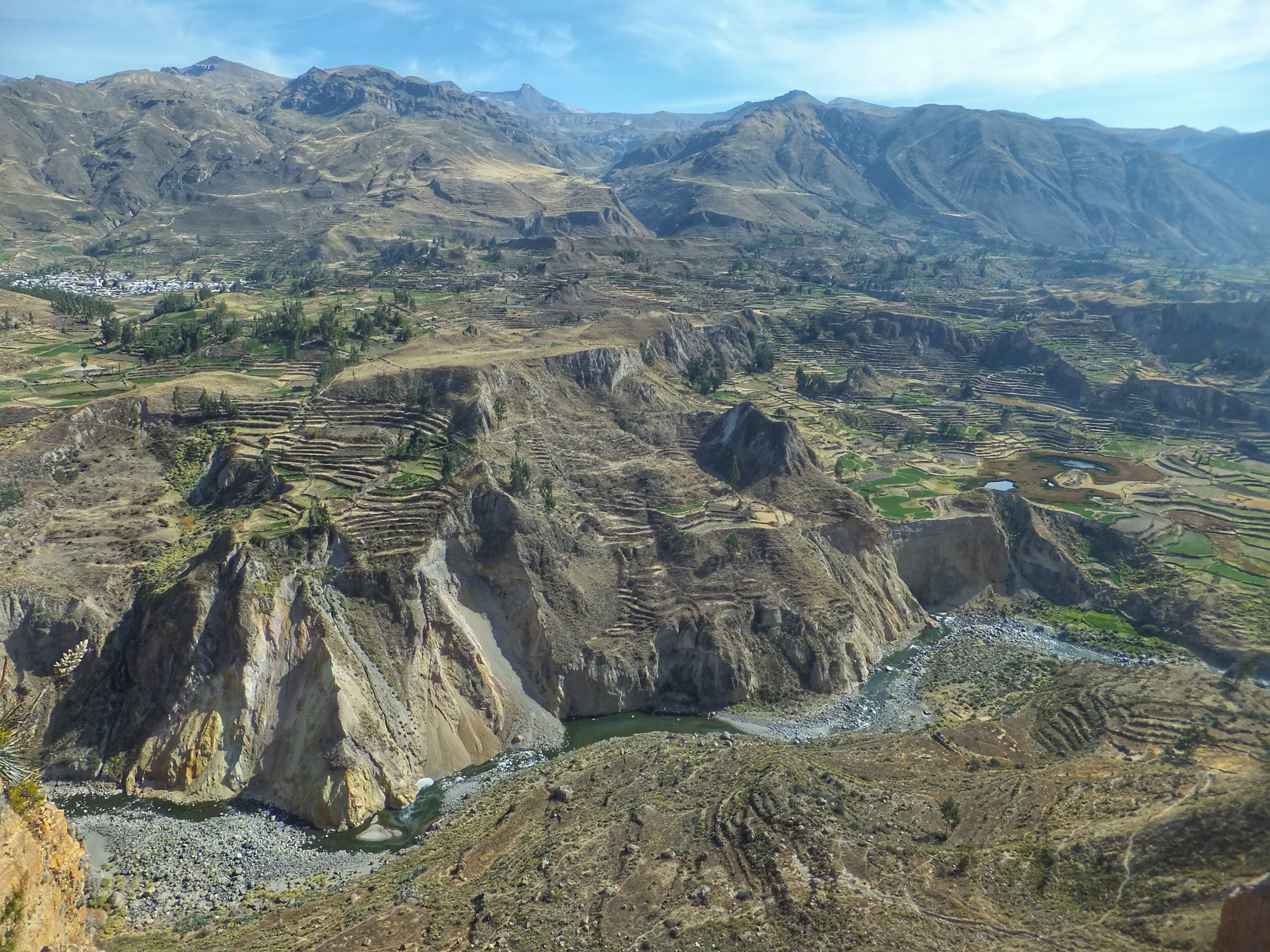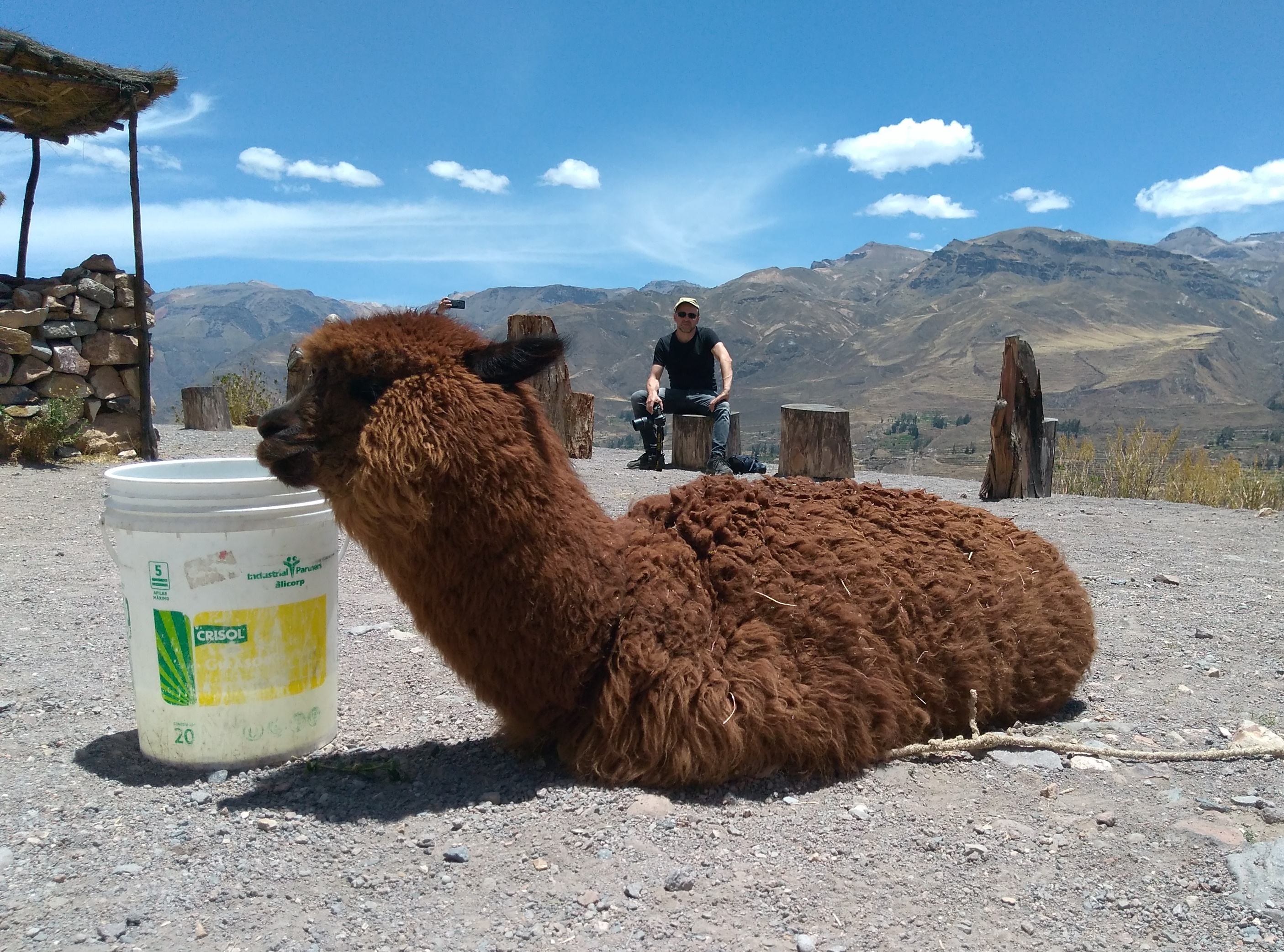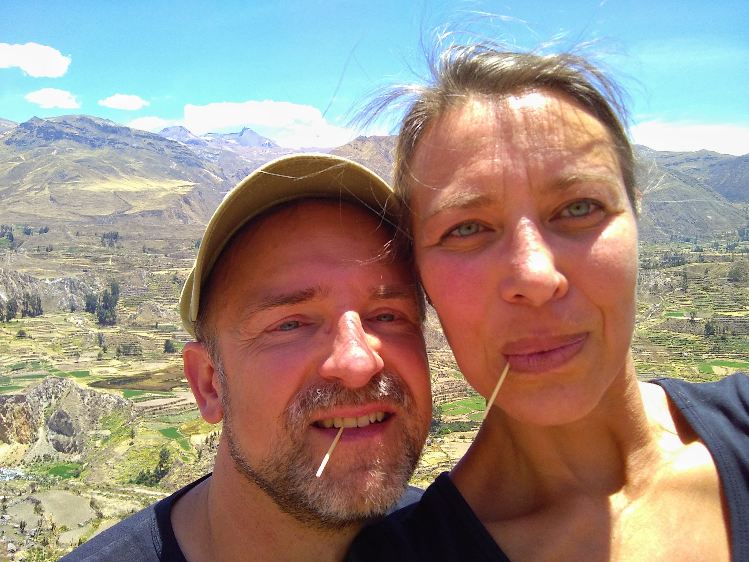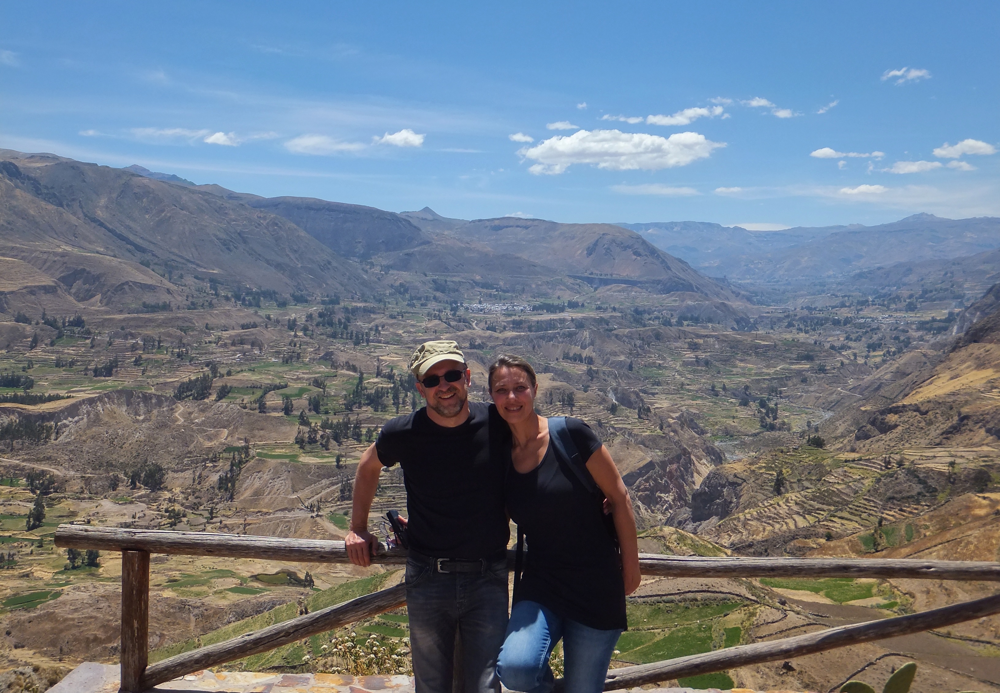 Um 5:30 klingelte der Wecker, weil wir schon um 6:30 Uhr für unseren Ausflug durch den Colca Canyon abgeholt wurden. Es war die gleiche Gruppe wie gestern auf der Herfahrt. Mit vielen kleinen Stopps, wo wir immer wieder den Ausblick auf den Canyon genießen konnten, ging es zum Cruz de Condor, wo in den frühen Morgenstunden zahlreiche Condore ihre Kreise ziehen. Hier hatten wir zum Glück ausreichend Zeit, um diese majestätischen Vögel zu bewundern. Mit weiteren Zwischenstopps ging es wieder zurück nach Chivay, wo wir die Gruppe verließen, die noch ein Mittagessen in einem Touristenlokal hatte. Wir gingen zurück zum Hotel, das jedoch geschlossen war. Zufällig hatten wir unterwegs ein kleines unscheinbares Restaurant gesehen. Dort teilten wir uns eine wunderbare Ceviche (rohe in Zitrone angemachte Meeresfrüchte). Nachmittags machten wir noch einen kleinen Spaziergang, wobei wir zufällig auf eine alte Ansiedlung aus der Prä-Inka-Zeit trafen. Ein Arbeiter, der dort gerade Kakteen einpflanzte erzählte uns ein wenig darüber, z. B. dass es sich bei den Steinhaufen tatsächlich um Häuser handelte. In einem der Häuser gab es sogar ein kleines Museum. Im Dorf gab es eine große Sonnenuhr und auch ein Kolosseum. Natürlich mussten wir die Akustik testen: Michi unten und Aneta im Publikum. Das war lustig. Nach einem frühen Abendessen gingen wir auch wieder früh ins Bett. Die lange Fahrt nach Cusco morgen beginnt bereits um 7:00 Uhr.