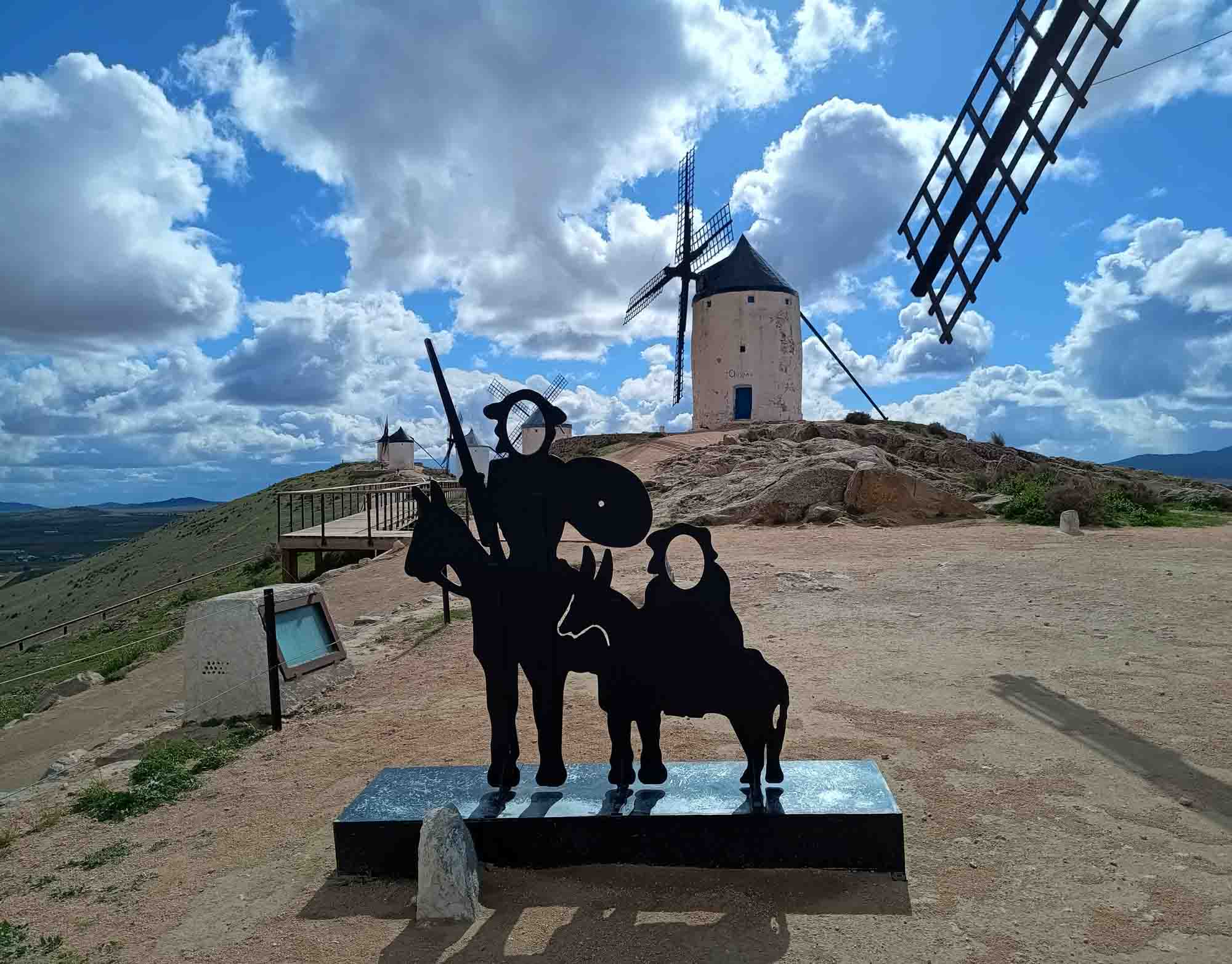 Der Morgen begann wechselhaft. Wir warteten eine Regenpause ab und wie durch ein Wunder war es der letzte Regenschauer, so dass wir bei aufgelockertem Sonnenschein unsere Morgenwanderung auf den nächsten Gipfel machen konnten. Von oben hatten wir einen schönen Blick auf den weitläufigen Picknickplatz und die weite Ebene, durch die wir vor zwei Tagen gefahren waren. Das schöne Wetter wollten wir ausnutzen und fuhren in Richtung Consuegra, wo wir die Windmühlen sehen wollten, gegen die Don Quichote vergeblich gekäpft hat. Wie erwartet gab es noch eine bessere Straße, die zu unserem Übernachtungsplatz geführt hätte. Dieser Weg war sogar asphaltiert. Allerdings nahmen wir dann doch eine Abkürzung durch die Olivenbäume, so dass es dann doch wieder etwas hoperiger und matschiger wurde. Dafür fuhren wir direkt auf die Windmühlen zu. Angekommen parkten wir in einem alten Steinbruch und kletterten auf einem steilen Pfad zu den 6 Windmühlen hoch, die auf einem Bergkamm oberhalb des Ortes Consuega standen. Von oben konnten wir nicht nur die runden weißen Windmühlen bestaunen, sondern wir bekamen auch einen tollen Blick auf den Ort unter uns. Natürlich gab es auch hier wieder eine Stierkampfareana. Consuega hat sogar ein eigenes Fußballstadion. Nach dem Spaziergang machten wir noch einen kurzen Zwischenstopp zur Entsorgung bevor wir der gut ausgebauten Nationalstraße bis kurz vor Toledo folgten. Nach etwa einer Stunde erreichten wir unser heutiges Ziel. Wie immer ein kleiner leerer Picknickplatz an einer Ermita. Diesmal war es die Ermita Nuestra Señora De Gracia, die zu dem gemütlichen Plätzchen gehörte, wo für uns für die Nacht einquartierten.