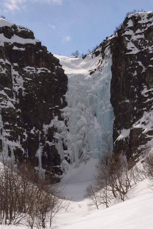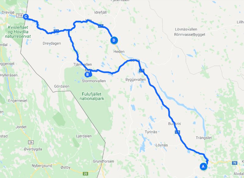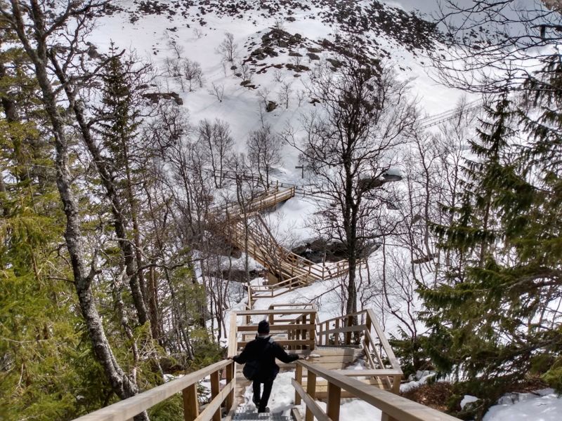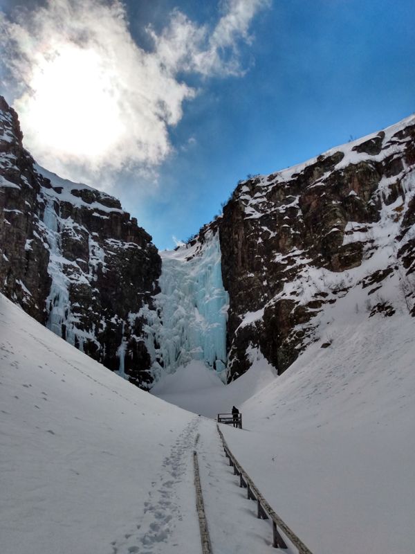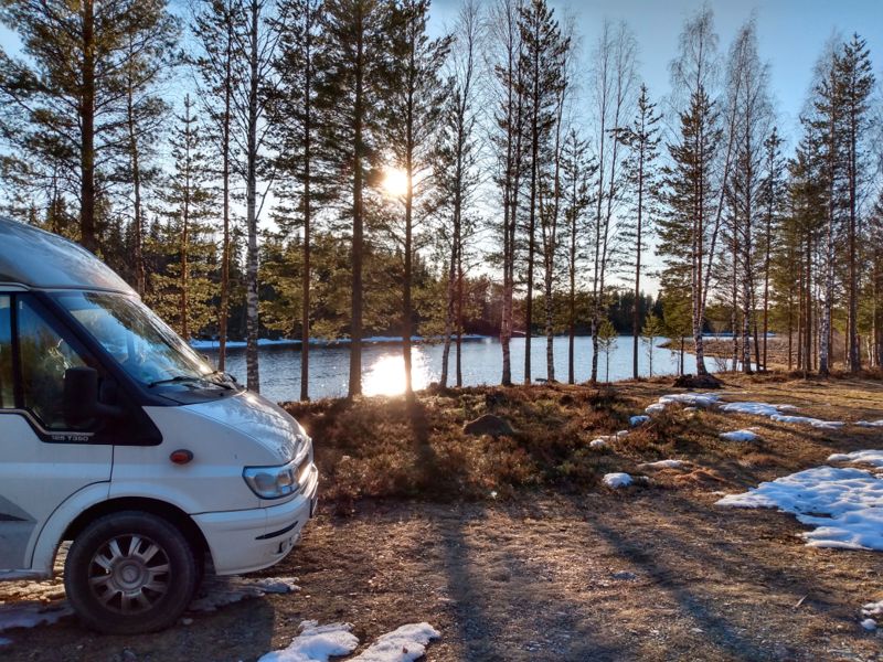 Die Sonne schien mal wieder herrlich, als wir uns auf die fast 2 stündige Fahrt zum Fulufjället Nationalpark aufmachten. Immer höher ging es in die Berge und am Ende erreichten wir die schneebedeckte Landschaft des Parks an der Baumgrenze, die hier schon bei 800 m liegt. Es war eine atemberaubende Wanderung durch den Schnee. Wir waren kurz vor unserem Ziel, dem Njupeskärs Wasserfall, übrigens mit einer Fallhöhe von 90 m der höchste Wasserfall in Schweden, als uns am oberen Ende einer Treppe ein Schild den Weg versperrte. Wegen Glätte sei der Weg zum Wasserfall geschlossen. Die Treppe war jedoch frei von Eis und so kletterten wir kurzerhand unter dem Schild hindurch und stiegen die Treppe hinab. Von dort aus ging es dann doch etwas halsbrecherisch oberhalb des eigentlichen Weges, der unter mindestens einem Meter Schnee nicht mehr zu erkennen war, an einem zum Bach hin abfallendenen Hang die letzten 200 m bis zum Wasserfall. Dort packten wir unsere Drohne aus und machten einen kurzen Flug. Diesmal hatten wir die Verbotsschilder gesehen. Eines bereits am Parkplatz, zwei weitere unterwegs. Das vierte sahen wir, nachdem wir den Flug beendet hatten knapp 50 cm vom Landeplatz der Drohne entfernt. Aber da wir wieder einmal völlig alleine waren, störte sich niemand an diesem kurzen Flug. Zurück nahmen wir den Rest des Rundwanderweges, der jedoch nicht so ausgetreten war, wie der Hinweg. Dieser Weg war ein Sommerweg und wurde nur selten genutzt. Wir merkten auch schnell warum, als wir die 2 km entlang der wenigen Fußspuren gingen und immer mal wieder tief im Schnee einbrachen. Die Brücken, die wir überquerten, waren kaum mehr sichtbar, so hoch türmte sich der Schnee auf ihnen auf. Etwas beschwerlich aber wunderschön war dieser Teil der Wanderung. Danach setzten wir uns wieder in unser Wohnmobil und fuhren an die norwegische Grenze. Überrascht stellten wir fest, dass wir hier problemlos über die Grenze hätten fahren können. Nur ein großes Schild, dass die Grenze geschlossen ist, stand auf der Straße. Aber der Weg war frei. Und so war es auch nicht verwunderlich, dass ein schwedisches Auto aus Norwegen kommend an uns vorbei die geschlossene Grenze passierte. Wir wollten uns jedoch nicht illegal in Norwegen aufhalten und fuhren daher die Straße zurück und fanden ein schönes Plätzchen auf einem noch geschlossenen Campingparkplatz etwas unterhalb der Straße an einem See.