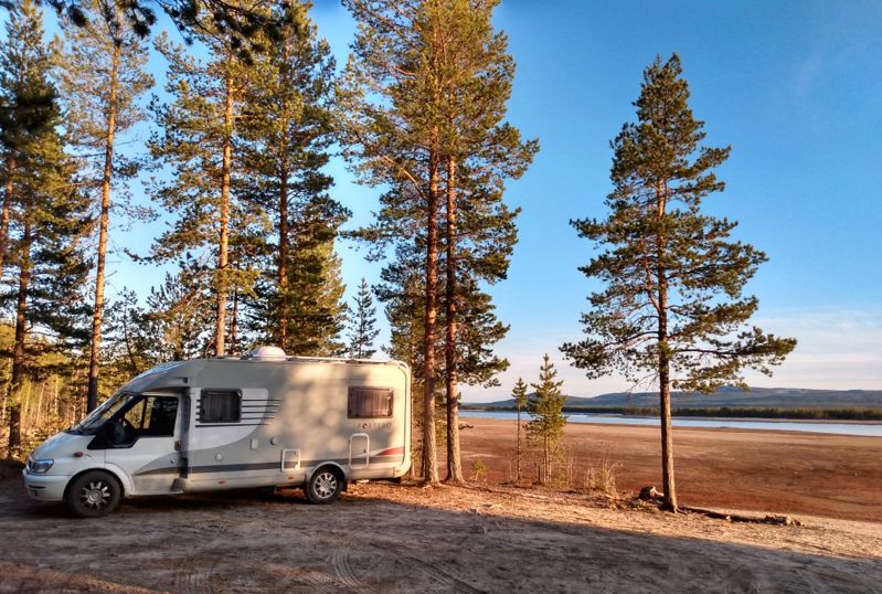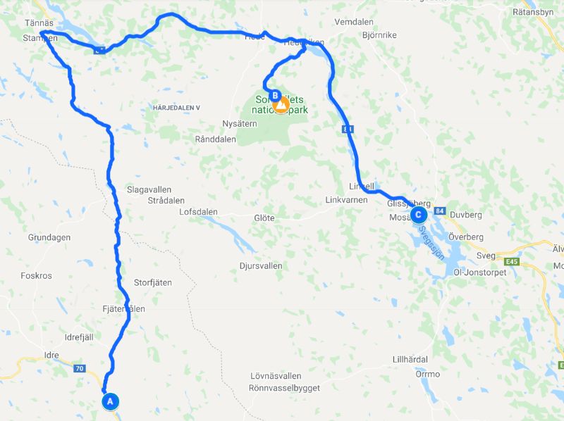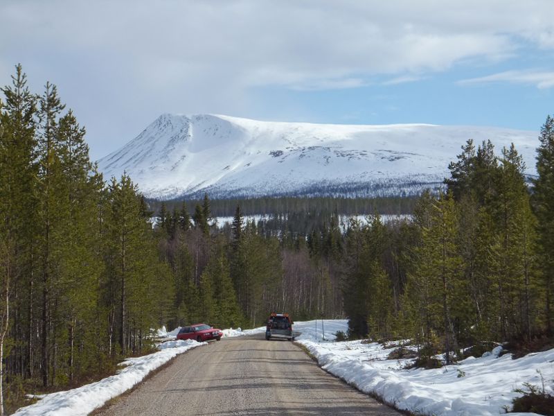 Die 2 ½ stündige Fahrt zum Sonfjällets Nationalpark kam uns gar nicht so lang vor. Wunderschön schlängelte sich die Straße über ein schneebedecktes Hochplateau. Die Seen waren noch dick mit Eis und Schnee bedeckt und wir sahen einige, die mit Ihren Schneemobilen unterwegs waren. Wir hätten große Lust gehabt, das auch einmal zu versuchen. Schließlich erreichten wir den großen weißen Berg, den den Nationalpark ausmacht. Den ersten Versuch, näher an den Berg heranzukommen, brachen wir ab, weil die Straße aus großen scharfkantigen Steinen bestand und wir Angst um unsere Reifen hatten. Der zweite Zugangsweg in Richtung Nyvallen war dann deutlich besser. Allerdings war dann auch hier die Weiterfahrt 6 km vor dem Ziel zu Ende, wo der Weg nicht mehr geräumt war und ein verlassenes Schneemobil auf dem Weg stand. Wir stellten unser Wohmbil an einer Weggabelung ab, machten einen kurzen Drohnenflug und gingen dann ein Weilchen den verschneiten Weg entlang. Nach einiger Zeit kam uns ein Trecker und kurz danach ein Auto entgegen. Dann war uns auch klar, warum an der Weggabelung ein Wagen des hiesigen ADAC gestanden hatte. Der PKW hatte sich offensichlich irgendwo festgefahren und musste befreit werden. Aber auch wir kehrten bald um, da wir durch die Bäume entlang des Weges auch keinen besseren Blick auf den Berg bekamen. So bestaunten wir den großen weißen Berg aus der Ferne, als wir unseren Weg fortsetzten und zu einem schönen einsamen Platz am nördlichen Ende des Svegssjön Stausees fuhren, wo wir einen herrlichen Sonnenuntergang hinter den Bergen beobachten konnten.