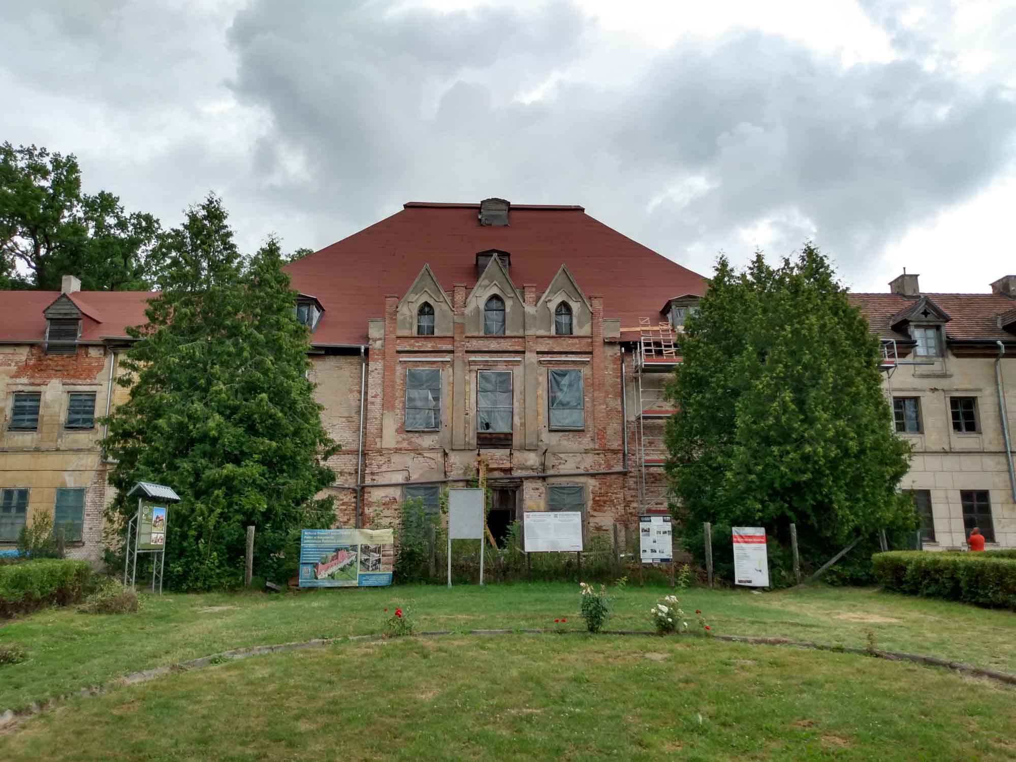 Von Olecko aus fuhren wir nach Westen in den Puszcza Borecka Nationalpark. In dem dichten Urwald leben seit 1962 Wisente, die aus einem Gehege ausgebrochen waren. Es gibt auch einen Wisenthof, der allerdings nur von 9 - 11 und von 16 - 18 Uhr geöffnet ist. Wir wollten nicht so lange warten und fuhren stattdessen weiter zum SS Field Command Hochwald, dem Bunker von Himmler. Die Anlage ist kein Vergleich zum Mauerwald oder zur Wolfsschanze. Hier steht lediglich ein einzelner großer Bunker, mit einem langen Gang und davon abgehend einem einzigen großen Raum. Etwas abseits gab es noch einen weiteren, allerding sehr kleinen und nicht mehr zugänglichen Bunker. Die nächste Station war das Bunkermuseum Mamerki oder Mauerwald. Etliche Bunker sind hier zu besichtigen und 2016 gab es den Versuch, in einem Stollen das Bernsteinzimmer zu finden. Allerdings vergeblich. Auf dem Weg zu unserem Stellplatz machten wir noch beim Palast von Lehndorff in Stynort Halt. Dies soll das besterhaltenste Gebäude seiner Art in ganz Polen sein. Diesen Eindruck hatten wir jedoch nicht. Vor uns stand ein ziemlich baufälliges Gebäude, das aber immerhin derzeit restauriert wird. Vielleicht lohnt sich ein Besuch in 10 Jahren wieder. Unseren Übernachtungsplatz fanden wir auf einer kleinen Wiese, die von einem Feldweg abging. Müde vom langen Tag machten wir kalte Küche und mit ein wenig Spielen ließen wir den Tag ausklingen.