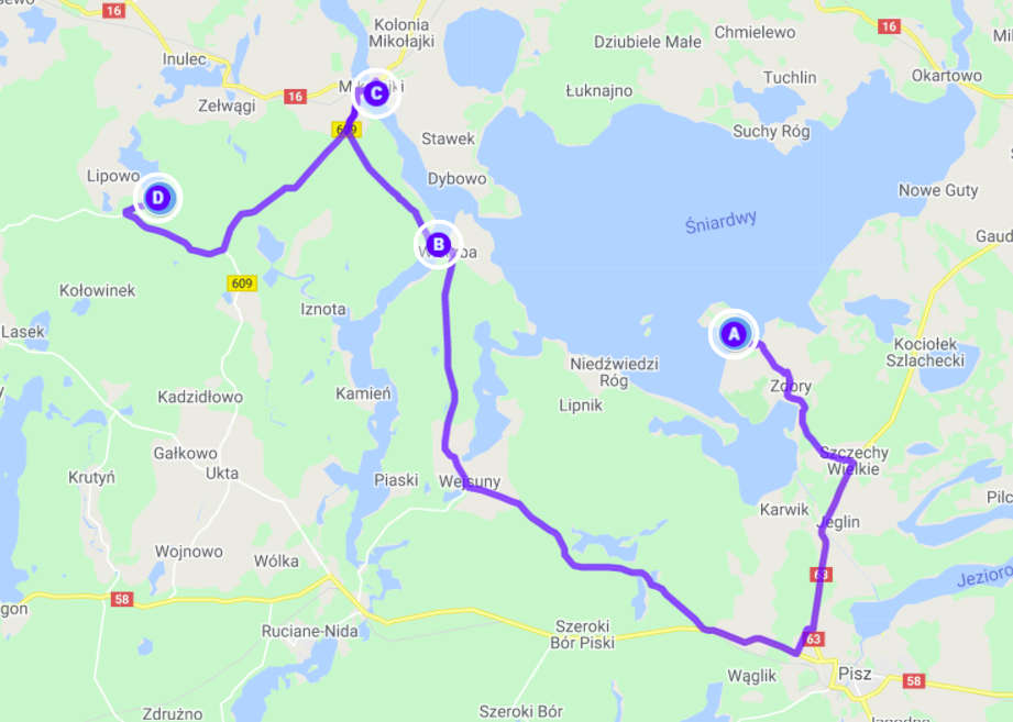 Morgens machten wir noch einen schönen Spaziergang zur Spitze der Halbinsel im See Sniardwy, wo wir die Nacht verbracht hatten. Die knapp 2 km waren sehr kurzweilig und als wir an der Spitze ankamen und durch die dort aufgebaute Zelt-, Wohnwagen- und Wohnmobilstadt liefen, waren wir froh über unseren einsamen Platz auf der Wiese. Auf einem Hügel hatte es sich eine Motorradgang breit gemacht und beschallte die Umgebung mit Heavy-Metall-Klängen. Ganz gemütlich fuhren wir anschließend an der Westküste des Sees entlang in den Nationalpark Warnowo. Dort sollte es wilde Pferde geben, die wir allerdings nicht zu Gesicht bekamen. Stattdessen fanden wir bei einem Halt Blaubeeren, die wir direkt vom Busch aßen. In Wierzba nahmen wir eine kleine Fähre. Die einzige Fähre, die es in den Masuren überhaupt gibt. Wir hatten Glück mit unserem Wohnmobil: 3,5 t war das Maximalgewicht, das ein Auto haben durfte. Gut, dass wir das einzige Fahrzeug in diese Richtung waren. Ein weiteres hätte auch nicht gepasst. Für die 360 m bis zum gegenüberliegenden Ufer benötigte die kleine Kabelfähre etwa 10 Minuten. Auf der anderen Seite warteten etliche Fahrzeuge und wir konnten uns ausrechnen, wie lange sie wohl würden warten müssen. Die Weiterfahrt ging über einen schmalen Sandweg etwa 5 km quer durch den Wald. Wunderschön, aber eben auch sehr eng. Immer passend gab es eine Ausbuchtung, wenn entgegenkommender Verkehr kam. Und die anderen Fahrer hielten ausnahmslos sehr rechtzeitig. So kamen wir nach Mikolajki, dem Vendig der Masuren. Warum der Ort diesen Beinamen bekommen hat, blieb uns schleierhaft. An den vielen Brücken, kann es nicht gelegen haben, es gab nur zwei. Eine für Autos und eine für Fußgänger. Vielleicht aber an den vielen Menschen. Entlang des Flusses gab es viele Andenkenstände, zwischen denen sich die Leute enggedrängt entlangschoben. Uns war das etwas zu eng und so beließen wir es bei einer kleinen Stadtrundfahrt. Wir fuhren weiter nach Westen und nutzten einen Wiesenparkplatz am See Jezioro Majcz Wik. für unsere nächste Übernachtung. Vor dem Abendessen liefen wir noch kurz zum See hinunter, der ausgesprochen sauber war und regelrecht zum Baden aufforderte. Wir aber hatten Hunger und brutzelten und noch leckeren überbackenen Brokkoli bevor wir zum gemütlichen Teil des Abends übergingen und spielten.