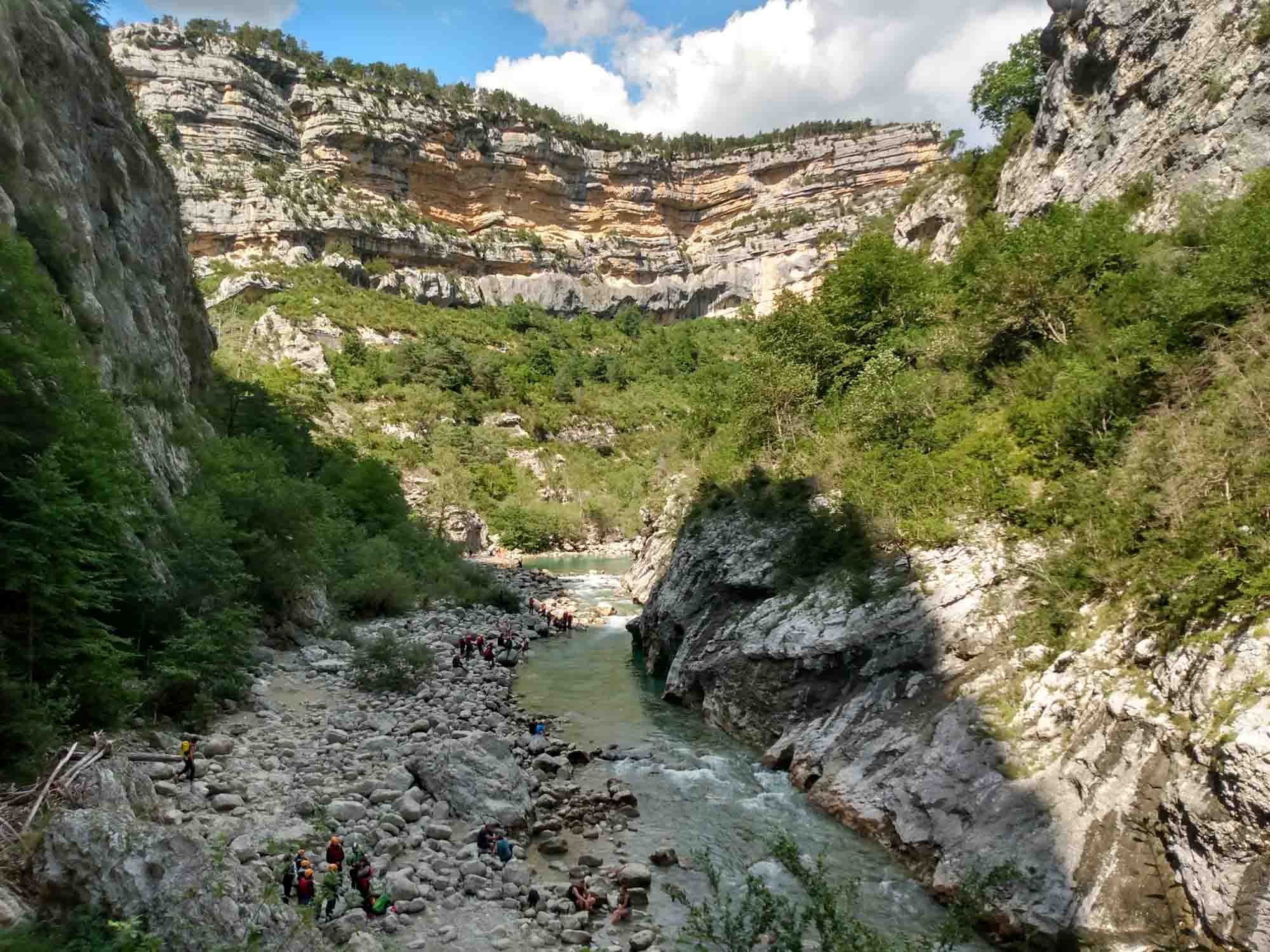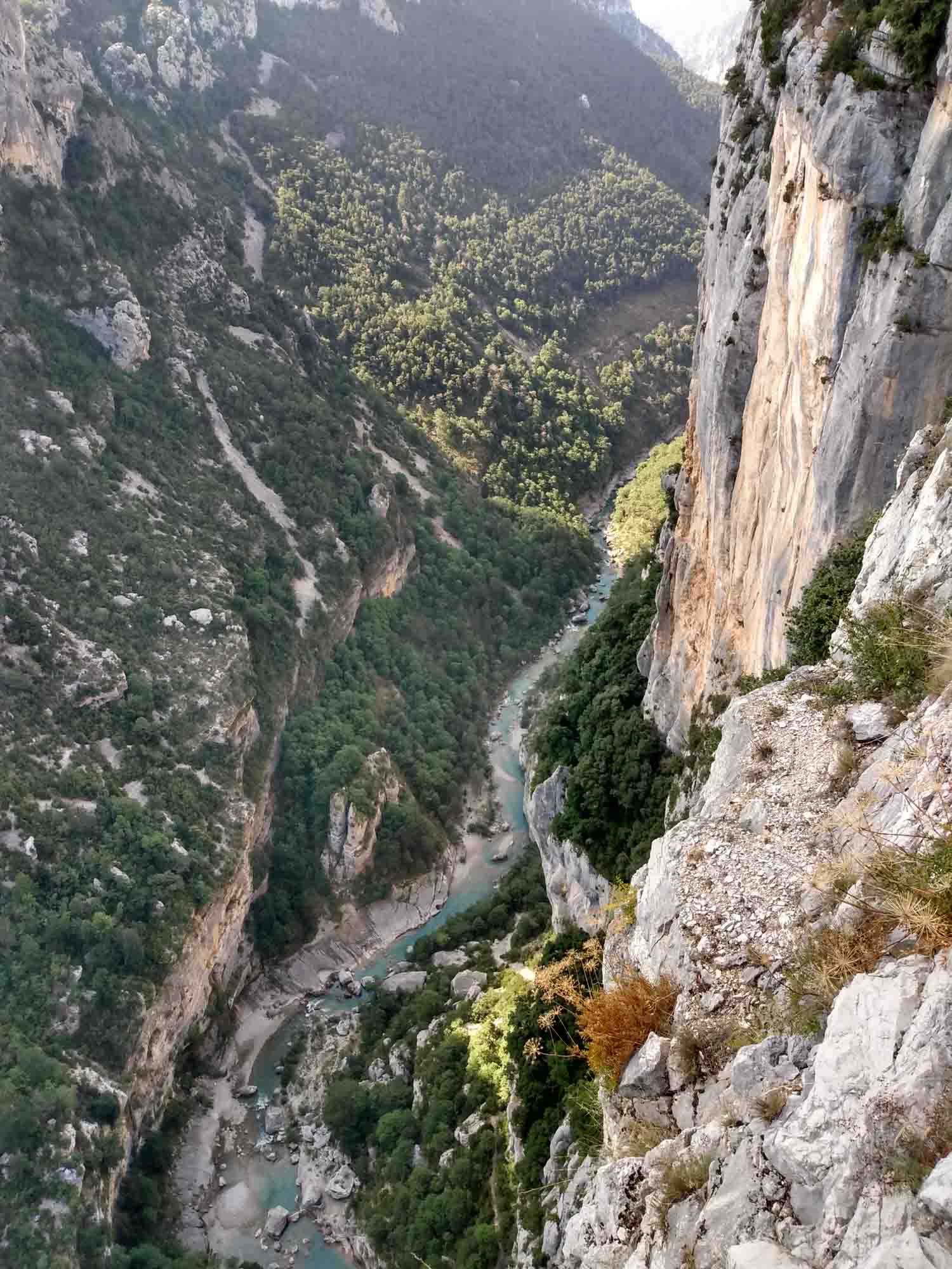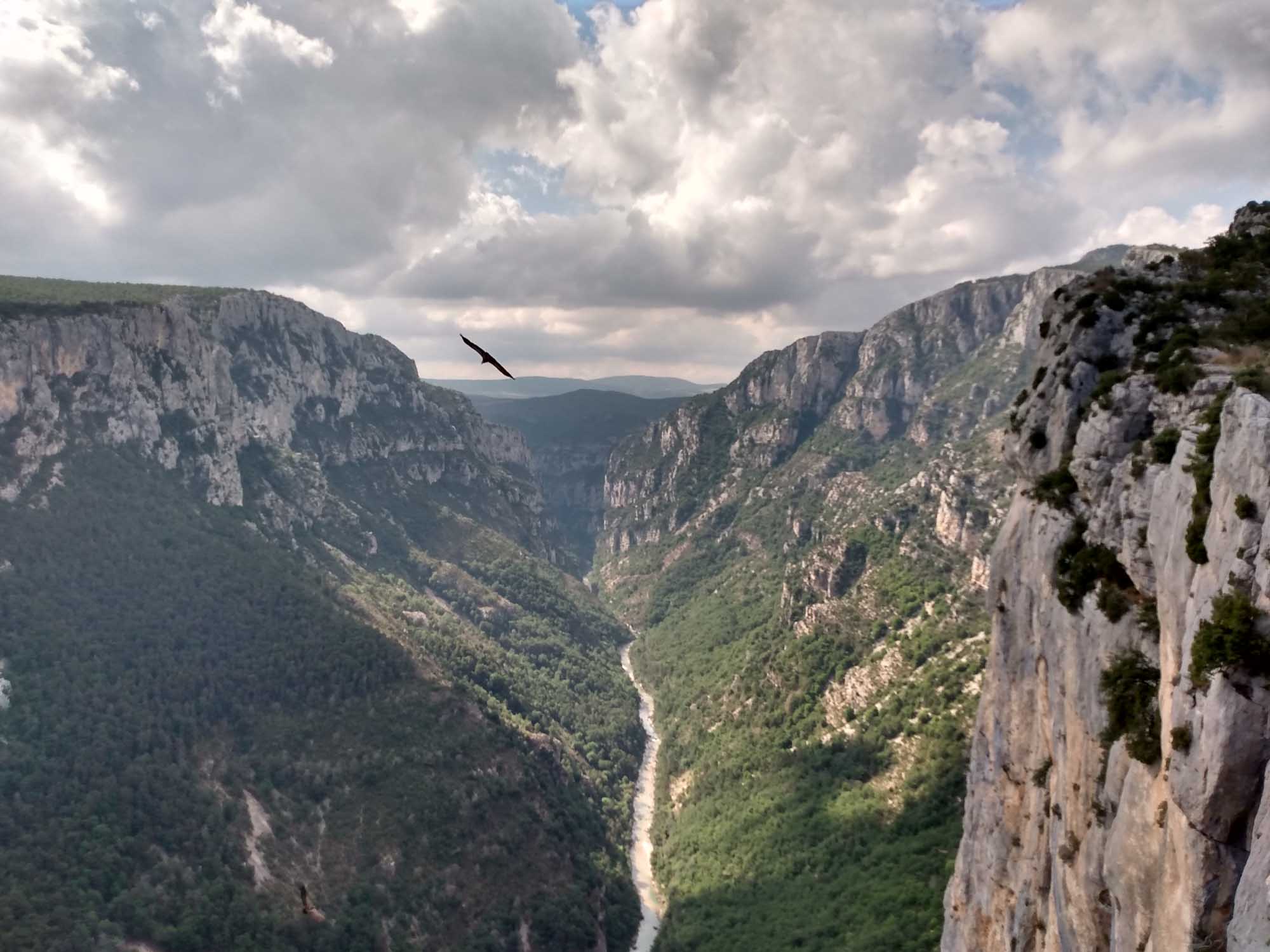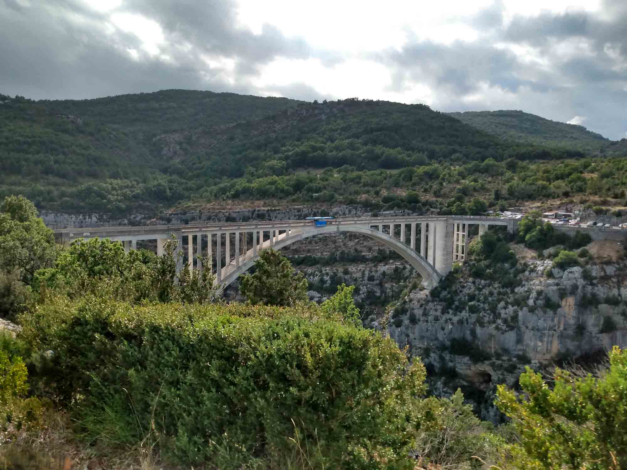 Heute stand uns ein wunderbarer Tag in und um die Schlucht von Verdon bevor. Als erstes fuhren für über La Palud-sur-Verdon zur Route des Crêtes, einem Rundweg auf der Nordseite der Verdonschlucht. Von dort aus blickt man aus 1215 m Höhe auf die Verdon 715 m tiefer. Die Wände gehen steil nach unten, so dass man einen direkten Blick hat. Wir hielten an jedem der vielen Aussichtspunkte, um die fantastische Landschaft des Canyons, und die zahlreichen Condore zu bewundern. Es erinnerte ein wenig an den Colca-Canyon in Peru und wir fragten uns, warum wir so weit geflogen waren, um dort die Condore zu sehen. Wir machten unglaublich viele Fotos und ließen auch die Drohne steigen. Die Straße war eng und steil, so dass wir für die knapp 25 km bis zum frühen Nachmittag brauchten. Zwischendurch durften wir immer wieder den Rückspiegel festdrücken. Warum Carglass diesen beim Austausch der Windschutzscheibe im Juni nur mit einem einfachen Klebepad befestigt hat, werden wir wohl nach unserer Reise mit Carglass klären müssen. Danach wollten wir uns den Tunnel de Bauo ansehen. Wir fuhren zu dem Parkplatz am Ende der Straße, allerdings nur um festzustellen, dass man dort nicht parken darf. Etwas weiter oben gab es einen weiteren Parkplatz. Auf dem durften wir mit dem Wohmmobil jedoch auch nicht stehen. Zum Glück fanden wir noch ein Stückchen weiter oberhalb einen Parkplatz am Straßenrand. Dann liefen wir die 1,1 km zurück zum ersten Parkplatz und starteten unsere kleine Wanderung zum Tunnel. Als erstes ging es zur Verdon herunter und ein wenig am Fluß entlang. Dabei konnten wir einige Gruppen beobachten, die sich gut ausgerüstet in dem Fluß treiben ließen und zwischendurch immer mal wieder von Felsen sprangen. Wir erreichten den Tunneleingang und stellten schnell fest, dass man das andere Ende nicht sehen konnte. Perfekt ausgerüstet mit unseren Handy-Taschenlampen (die richtigen Taschenlampen haben wir sicherheitshalber im Wohnmobil gelassen), gingen wir los. Vielleicht hätten wir doch das Schild am Eingang lesen sollen, das wir bei unserer Rückkehr gesehen haben. Dort stand, dass der erste Tunnel 615 m lang und der zweite noch einmal 115 m lang ist. So liefen wir eine Weile durch völlige Finsternis und tappten hin und wieder mal in eine Pfütze. Wir hatten unsere Wanderschuhe an, da war uns das ziemlich egal. Letztlich kamen wir unterhalb des Belvédère de Trescair haut wieder heraus, dem Aussichtspunkt, den wir am Morgen als erstes angefahren hatten. Anschließend wanderten wir zurück zum Auto und fuhren über Trigance, wo wir auf dem Berg ein altes Schloß bewunderten und weiter zum Pont de l'Artuby, einer 130 m hohen Bogenbrücke über den Artuby. In der Mitte der Brücke war eine Station aufgebaut, von der aus Bungysprünge gemacht wurden. Und tatsächlich sahen wir eine junge Frau auf das Geländer klettern und ohne zu zögern in die Tiefe springen. Für uns war das nichts. Wir suchten uns lieber unseren nächsten Schlafplatz, den wir etwas abseits der D71 auch fanden.
