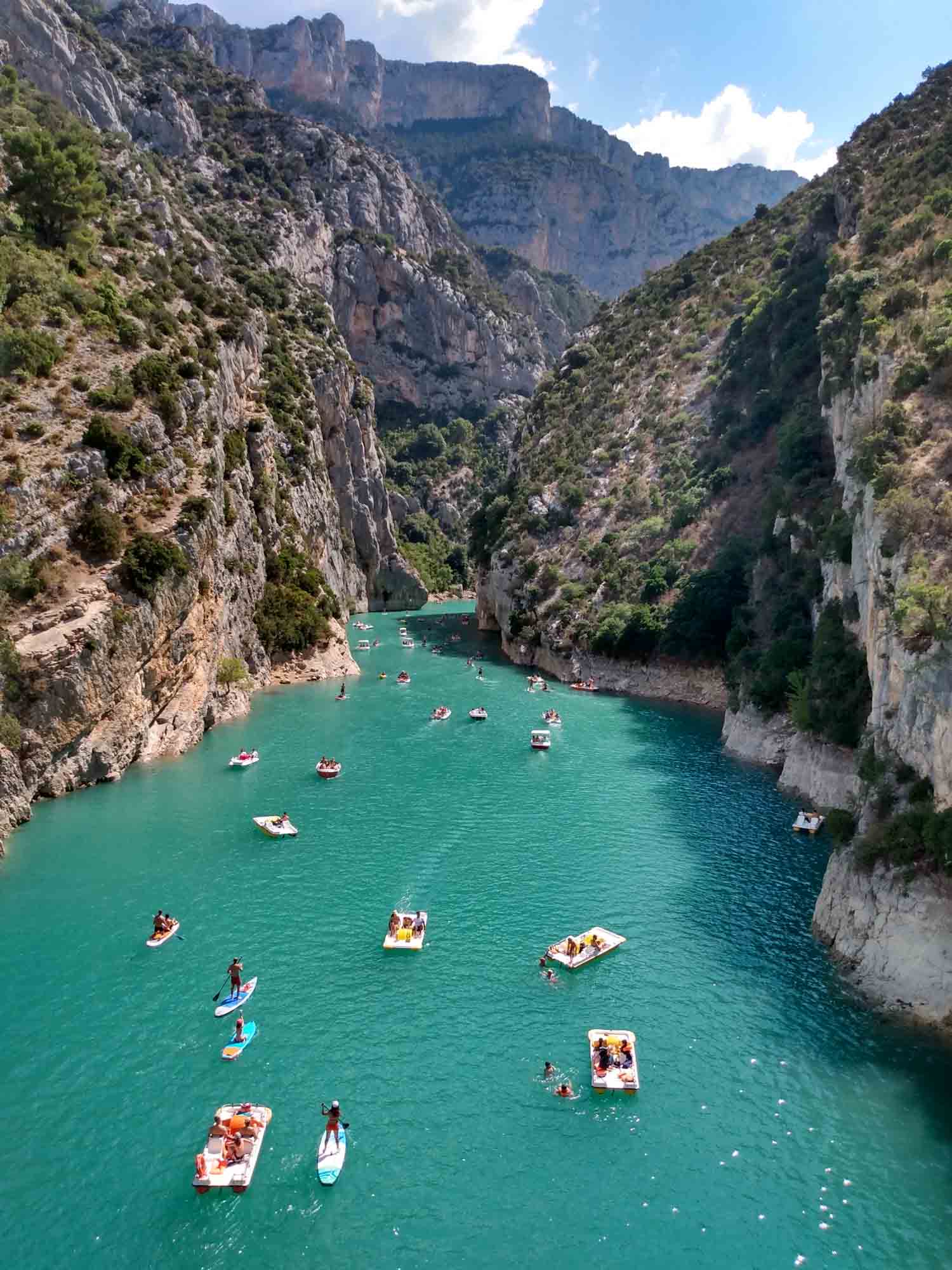 Nach dem Frühstück ging es weiter and der Südseite der Verdonschlucht in Richtung Westen. Die kleine Straße schlängelt sich immer am Rand des Grats entlang und wir bekamen noch einmal tolle Eindrücke von der Tiefe der Schlucht. Anstatt abwärts ging es zunächst aber noch etwas höher bis wir bei 1.350 m den letzten Pass überquerten und es danach umso steiler nach unten ging. Von oben konnten wir unser erstes Ziel schon sehen, den Lac de Sainte-Croix (See des heiligen Kreuzes) und die Pont de Galetas, die Brücke, an der die Verdon in den See fließt. Dort tummelten sich unzählige Tretboote und Kajaks, die dort am Strand ausgeliehen werden konnten und mit denen man das erste Stück in die Schlucht fahren konnte. Die Verleiher waren sich bei den Preisen alle einig: 40 Euro für 2 Stunden Tretboot fahren. Wir schauten dem Treiben lieber von Strand aus zu und setzten uns eine Weile in die Sonne. Danach fuhren wir durch die trockene aber waldige Landschaft, die beinahe genauso aussah, wie die Landschaft der Ardèche, nur etwas bewaldeter zu unserem nächsten Ziel, dem Bergmassiv Sainte-Victoire, östlich von Aix-en-Provence. Auf der Westseite des Berges steht das Croix-de-Provence (Kreuz der Provence), ein großes, weithin sichtbares Kreuz. Vom Parkplatz Deux Aguilles aus kann man in knapp 3 Stunden bis zu diesem Kreuz wandern. Anbetracht der 30 Grad, die wir auch Nachmittags um 16 Uhr noch hatten, bevorzugten wir es, das Kreuz und den Berg mit der Drohne aufzunehmen. Bis auf 250 m schraubte sich das kleine Gerät in die Luft und wir bekamen ein herrliches Panorama des Berges. Über Le Tholonet, wo die Route de Cezanne beginnt (oder endet) fuhren wir weiter nach Aix-en-Provence. Der Weg von Cezanne, wo sich der Künstler zu seinen Werken inspirieren ließ und das Licht besonders schön sein sollte, war eigentlich nichts wirklich besonders. Auffällig waren die großen Tore, mit denen die Eingänge der Grundstücke eingefasst waren und hinter denen sich vermutlich ebenso große Anwesen verbargen. In Aix-en-Provonce fuhren wir beim Atelier des Künstlers vorbei, das am Sonntag jedoch geschlossen war. Also suchten wir unseren nächsten Schlafplatz, den wir an einem winzigen See bei Payrolles-en-Provence fanden. Dort ließen wir den Abend bei einem gemütlichen Gläschen Wein ausklingen. Als es dunkel geworden war, hörten wir draußen einen lauten Knall. Kurz danach noch einen. Wir gingen hinaus und schauten uns das Spektakel an: Quasi nur für uns wurde ein fantastisches Feuerwerk veranstaltet. Große Lichtkugeln färbten den Himmel in den verschiedensten Farben. Wie gut, dass wir noch einmal umgeparkt hatten. Auf der anderen Seite des Sees hätten wir das Feuerwerk gar nicht sehen können.