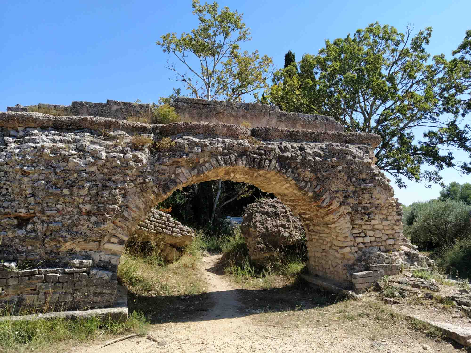 Von unserem Stellplatz mitten im Nationalpark Alpilles brauchten wir nur ca. 20 Minuten bis nach Les Baux-de-Provence. Noch deutlich vor dem eigentlichen Parkplatz der Burgruine fingen auf der rechten Seite der Fahrbarn die Bezahlparkplätze an. Aber nicht nur, dass sie mit 5 Euro für die erste Stunde ziemlich teuer waren, sie waren auch ausnahmslos voll. Wo wollten die vielen Menschen nur alle hin? Wir stellten uns ganz am Ende an und ließen unsere Drohne steigen. Danach fuhren wir zu unserem eigentlichen Ziel, den Carrières de Lumières, einer Lichtershow in einer Halle im Berg. Mit unserem Wohnmobil war es unmöglich einen Parkplatz zu finden. Und das obwohl die Show zu jeder vollen Stunde läuft und es eigentlich einen regen Wechsel geben müsste. Aber heute am Sonntag hatten sich wohl alle Franzosen aus der Umgebung hierher aufgemacht. Wir entschieden uns, die Lichtershow bei unserer Rückfahrt einzuplanen und fuhren weiter zum Aqueduc Roman de Barbegal. Unterwegs entdeckten wir in Fontvielle einen Trödelmarkt, wo wir anhielten und uns die schönen Antiquitäten ansahen, die dort verkauft wurden. Es war zwar nur ein kleiner Markt, aber es gab viel Schönes zu entdecken auch wenn wir letztlich nichts gekauft haben. Das Aquädukt war überraschend klein (mehr eine Art Überlandwasserleitung) und auch schon ziemlich verfallen. Trotzdem ist es immer wieder beieindruckend zu sehen, zu welchen Leistungen die Römer vor über 2000 Jahren fähig waren. Über Arles fuhren wir in die Camargue auf der Suche nach den wilden weißen Pferden. Am Ende bekamen wir sie auch tatsächlich zu sehen, allerdings nur auf der Schnellstraße, so dass es nicht für ein Foto reichte. Für das Foto mussten daher zwei, früher bestimmt einmal sehr wilde Pferde, herhalten, die durch einen kleinen Zaun am Weglaufen gehindert wurden. Diese entdeckten wir auf der Suche nach einem Stellplatz, wobei diese Möglichkeit durch ein Durchfahrts-Verbotsschild für Wohnmobile verhindert wurde. Vermutlich haben sich hier zu viele Camper daneben benommen. Zu blöd, dass durch solch ein Verhalten, freies Campen immer schwieriger wird. Ist es denn wirklich so schwer, seinen Müll auch wieder mitzunehmen und vor allem kein Toilettenpapier herumliegen zu lassen? Offensichtlich ist es das, denn wir sehen dies leider an viel zu vielen Orten. Die Suche nach einem Stellplatz führte uns bis hinter Montpellier, wo wir in der Nähe des Wassers einen passende Stelle fanden. Dort machten wir uns die Reste des gestrigen Grillgelages warm und genossen die ausklingende Wärme des schönen Tages.