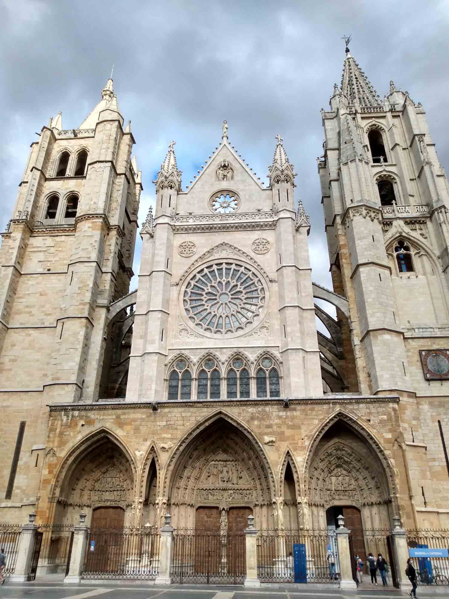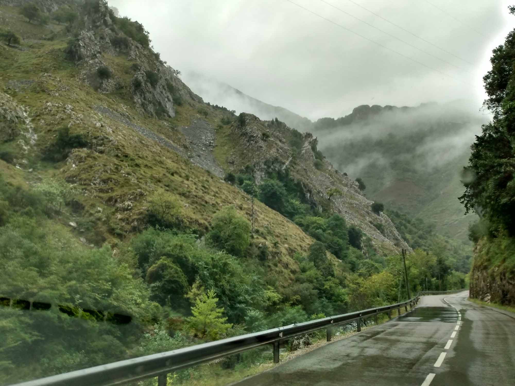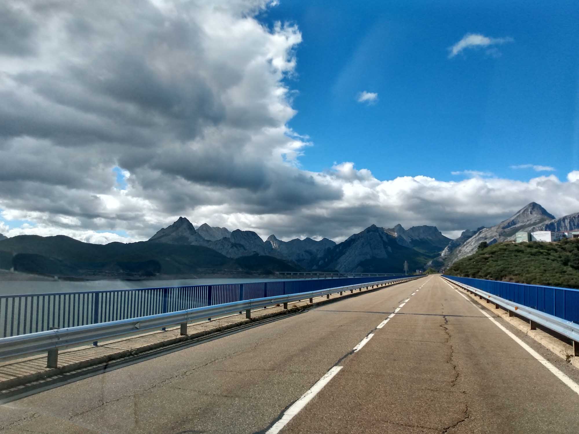 Regen, Regen, Regen. Nichts als Regen. Und der Himmel grau in grau. Keine Besserung in Sicht. Gut, dass wir mit dem Wohnmobil unterwegs sind und nicht mit dem Motorrad oder zu Fuß, wie die vielen Wanderer auf dem Jakobsweg, die wir unterwegs gesehen haben. Es schüttete ununterbrochen, als wir auf der N-634 gen Westen und kurz danach auf die N-621 in Richtung Süden fuhren. Diese Route führt über Panes und Potes, zwei sehr schöne Bergdörfer. Dazwischen aber liegt der Nationalpark Desfiladero de La Hermida. Die Straße führt hier entlang eines kleinen Flusses durch eine ziemlich hohe Schlucht, die beinahe an die von Verdon erinnert. Danach schängelte sich die Straße langsam bergauf, bis wir bei Portilla de la Reina den Pass bei 1609 m passierten. Hier bekamen wir fantastische Ausblicke auf die hier wunderschöne Landschaft. Besonders schön wurde es, weil es endlich aufklarte, als wir den Pass passiert hatten und in Richtung León fuhren. Die Sonne war wieder da und es wurde schlagartig wärmer. Die bergige Landschaft wechselte zu sanften Hügeln, von denen wir beim Herunterfahren immer wieder einen weiten Blick bis zum Horizont bekamen. Landschaftlich war diese Fahrt die Schönste, die wir bisher in Spanien hatten. In León schauten wir uns noch kurz die Kathedrale an. Es war bereits spät geworden und die Suche nach einem Stellplatz dauerte heute länger, als uns beiden lieb war. Der avisierte Platz war viel weiter von León weg, als wir gedacht hatten und war dann auch nicht erreichbar, weil die Zufahrt so eng und steil war, dass wir mit Sicherheit hinten aufgesetzt hätten. Also fuhren wir wieder in Richtung León zurück und fanden dann zum Glück abseits der Straße ein ruhiges Fleckchen. Es war dann aber auch schon 20:30 Uhr so machten wir uns nur noch schnell etwas zu essen.