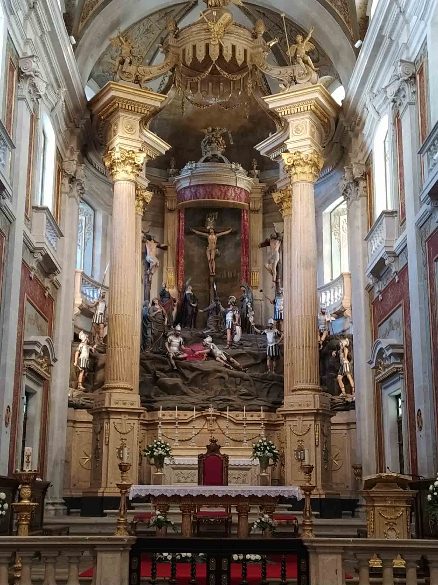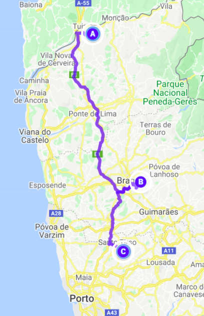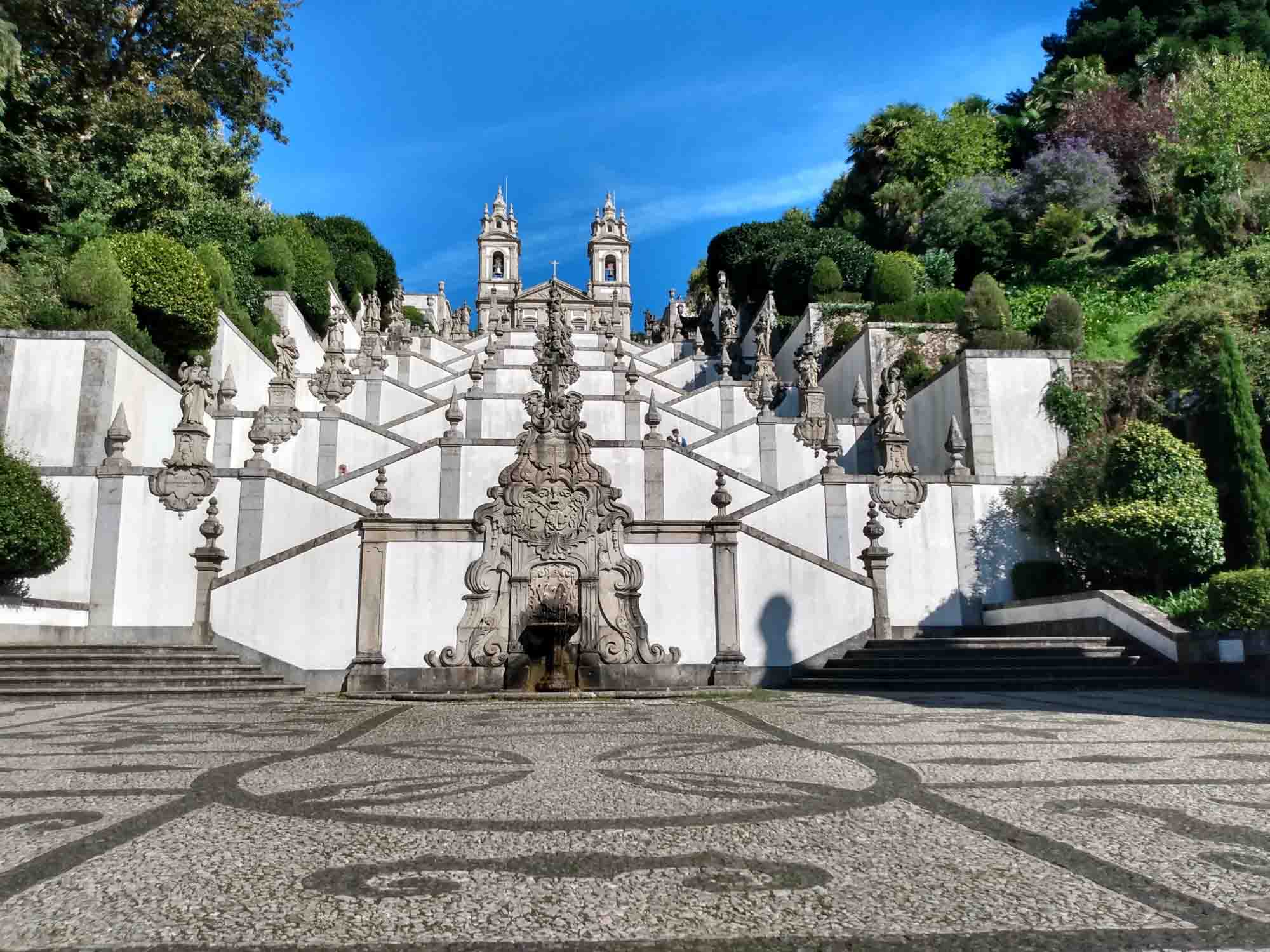 Unser Platz auf auf dem Berg war so schön, dass es uns schwerfiel, weiterzufahren. Wir taten es trotzdem und schauten uns bei einer gemütlichen Fahrt durch den Norden Portugals die schöne Landschaft an. Die Wälder im Norden bestanden zum Teil beinahe ausschließlich aus Pappeln und am Boden grünt der Farn. Die Dörfer, durch die wir kamen, sahen allesamt sehr gut aus. Etliche sehr herrschaftlich aussehende Anwesen zeugen davon, dass es doch Portugiesen geben muss, denen es relativ gut geht. Als wir uns Braga näherten fuhren wir eine Straße entlang, an denen sich Steinmetz an Steinmetz reihte. Auf den Grundstücken standen alle möglichen Skulputuren und überall wurden riesige Steine gelagert. Je näher wir Braga kamen, umso dichter wurde die Besiedelung. Östlich der Stadt liegt Bom Jesus do Monte, eine Kathedrale auf einem Berg, die unser eigentliches Ziel war. Über zahlreiche Stufen erklommen wir den Berg (natürlich hätten wir auch die kleine Zahnradbahn nehmen können, aber Tempel wollen erarbeitet werden). Der Aufstieg war sehr schön und wir bekamen die tolle Steintreppe unterhalb der Kathedrale zu sehen. Die Kirche selbst war sehr geschmackvoll dekoriert. Prunkvoll, aber nicht überladen. Der Altar war wieder etwas besonderes. Hier war die gesamte Kreuzigung figürlich aufgebaut. Neben Jesus hingen zwei weitere Verurteilte am Kreuz, unterhalb einige Soldaten. Danach fuhren wir weiter zu unserem avisierten Stellplatz, etwa auf halber Strecke zwischen Braga und Porto. Da wir auch unterwegs gerne nach weiteren Plätzen Ausschau halten, bogen wir irgendwann in eine kleine Straße nach links ab. Es war sehr eng und ging relativ steil abwärts. Nach einer kleinen Biegung hingen dann plötzlich Bäume so weit über der schmalen Straße, dass wir tatsächlich nicht durchkamen. Was für ein Mist. Also rückwärts, den steilen Berg hinauf, um die Kurve, zwischen Mauer und Haus manövrierend, auf beiden Seiten etwa 5 cm Platz. Unglaublich, dass wir das geschafft haben, ohne anzuecken. Allerdings qualmte danach die Kupplung und stank fürchterlich. Als wir weiterfuhren, fiel uns plötzlich auf, dass der Tacho nicht mehr funktionierte. Wir hielten an, öffneten die Motorhaube und sahen: Nichts. Es roch etwas streng nach gequälter Kupplung, aber sonst schien alles in Ordnung. Nach dem Starten des Motors funktionierte der Tacho dann auch wieder. Merkwürdig. Schließlich erreichten wir unseren Stellplatz an einer kleinen Kapelle. Der letzte Teil des Weges war noch einmal sehr steil, steinig und mit einigen tiefen schrägen Querrillen. Aber wir meisterten diesen Teil ohne Probleme und gönnten uns und unserem tapferen Forti eine kleine Ruhepause.