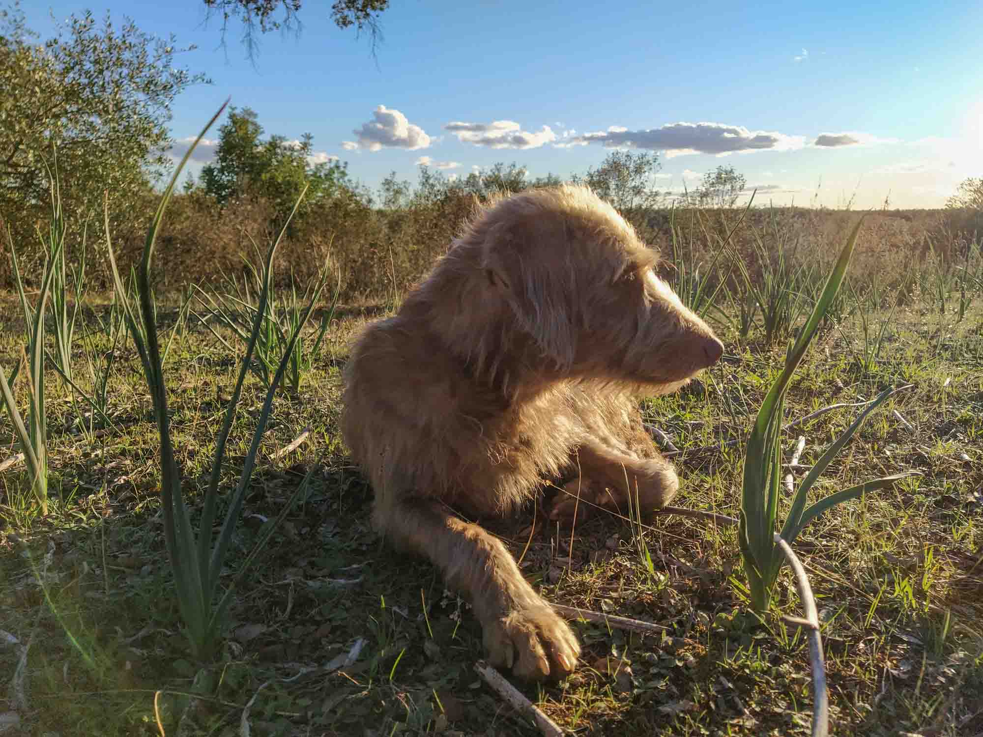 Berta begrüßte uns am Mitwochmorgen freudig, als wir nach dem Aufstehen die Tür öffneten. Sie hatte unter dem Auto geschlafen und offensichlich nur auf uns gewartet. Die notwendigen Gänge, egal ob groß oder klein, begleitete sie sowieso. Wir machten noch einen ausgiebigen gemeinsamen Spaziergang und auch hier begleitete sie uns perfekt. Sie stromerte mal hier- und mal dorthin, blieb aber immer bei uns. Damit war die Entscheidung für sie offensichtlich gefallen: Sie wollte adoptiert werden. Wir dagegen, waren uns nicht ganz so sicher. Hin- und hergerissen zwischen dieser unglaublich gutmütigen und lieben Hündin, die uns sofort ins Herz geschlossen zu haben schien und alle anderen auf dem Platz vollständig ignorierte und unseren Plänen, zu denen ein Hund so gar nicht passte. Immer wenn wir auf andere Reisende mit Hunden trafen, sagten wir uns, wie schwierig das sein müsste. Und so eng. Und der Geruch, wenn der Hund naß ist. Mit einem Hund kann man nirendwo rein. Man kann sich nicht mehr so einfach an den Strand legen. Und was sagt der Vermieter dazu? Wie würde sich sich in einer Stadt fühlen? Hat sie es hier in der Freiheit nicht vielleicht sogar besser? Es gab so viele gute Gründe, es nicht zu tun. Aber am Ende setzte sich dann doch das Herz durch und wir machten wir uns schlau, was man braucht, wenn man einen Hund aus Spanien nach Deutschland bringen möchte. Eigentlich nicht viel, wie wir schnell feststellten und alles vom Tierarzt: Natürlich muss der Hund gegen Tollwut geimpft sein und dazu gehört ein Chip, mit dem der Hund identifiziert werden kann. Das Ganze wird in einem Ausweis dokumentiert. Nach 21 Tagen gilt der Hund dann als geimpft und darf in Deutschland einreisen. Also musste der Hund zum Tierarzt. Im knapp 20 km entfernten La Carlota gab es sogar zwei Tierärzte. Der erste hatte keine Öffnungszeiten, sondern nur eine Telefonnummer und der zweite hatte bereits geschlossen und öffnete seine Praxis erst wieder morgen um 9:30 Uhr. Jetzt hatten wir nur noch das Problem, Berta in das Auto zu bringen. Aber all die Nähe, die wir aufgebaut hatten, half nicht. Sie ließ sich partout nicht zum Einsteigen bewegen. So fuhren wir dann trotzdem los, um zumindest mit dem Tierarzt zu sprechen und ein paar Einkäufe zu erledigen. Aber so einfach kamen wir nicht weg, denn Berta lief dem Wagen hinterher. Am Tor zu dem Picknickplatz, auf dem wir standen, hielten wir noch einmal, aber auch diesmal wollte sie nicht einsteigen. Das gleiche wiederholte sich noch ein paarmal auf der 1,8 km langen Schotterstraße und erst als wir trotz der vielen Löcher in der Straße knapp 50 km/h fuhren, kam sie nicht mehr hinterher. Mit etwas flauem Gefühl in der Magengegen fuhren wir in die Stadt und kauften ein, u.a. einen großen Sack Hundefutter. Bei der Tierarztpraxis fuhren wir auch noch vorbei, aber sie war geschlossen. Also würden wir es am nächsten Tag noch einmal versuchen müssen. Auf dem Rückweg kam uns Berta auf dem Schotterweg rennend entgegen. Auch diesmal versuchten wir mehrmals, sie zum einsteigen zu bewegen. Sie zog es jedoch vor, etwas langsamer als zuvor hinter dem Auto herzulaufen, um uns dann noch herzlicher als zuvor zu begrüßen, als wir wieder auf unserem Platz waren und austiegen. Den Rest des Nachmittags verbrachten wir draußen, Berta immer in unserer Nähe, bis Franz, unser Platznachbar mit seinem Hund Flocke vorbeikam und wir gemeinsam grillten und bis tief in die Nacht noch zusammensaßen und klönten. Tief in die Nacht bedeutete 20 Uhr, dann wurde es schnell so kalt, dass wir uns alle lieber in unsere Autos verzogen. Und siehe da, mit ein wenig Futter, konnten wir Berta dann doch noch zum Einsteigen überreden. Sie hüpfte ins Wohnmobil, legte sich auf die Decke, die wir an der Tür für die hingelegt hatten und schlief sofort ein. Etwas später, als Aneta noch einmal nach draußen ging, sprang sie ebenfalls hinaus. Wir dachten erst, dass sie es vielleicht doch vorzog, wieder unter dem Auto zu schlafen, als wir es laut schlabbern hörten. Sie hatte einfach nur Durst, trank schnell, lief dann zu uns zurück, sprang wieder hinein, legte sich hin und schlief weiter.