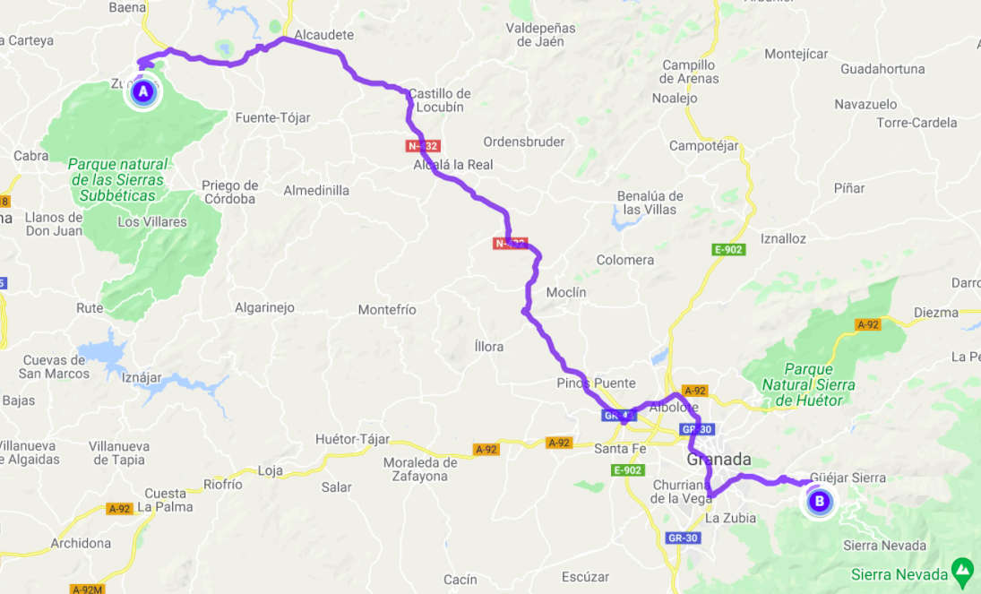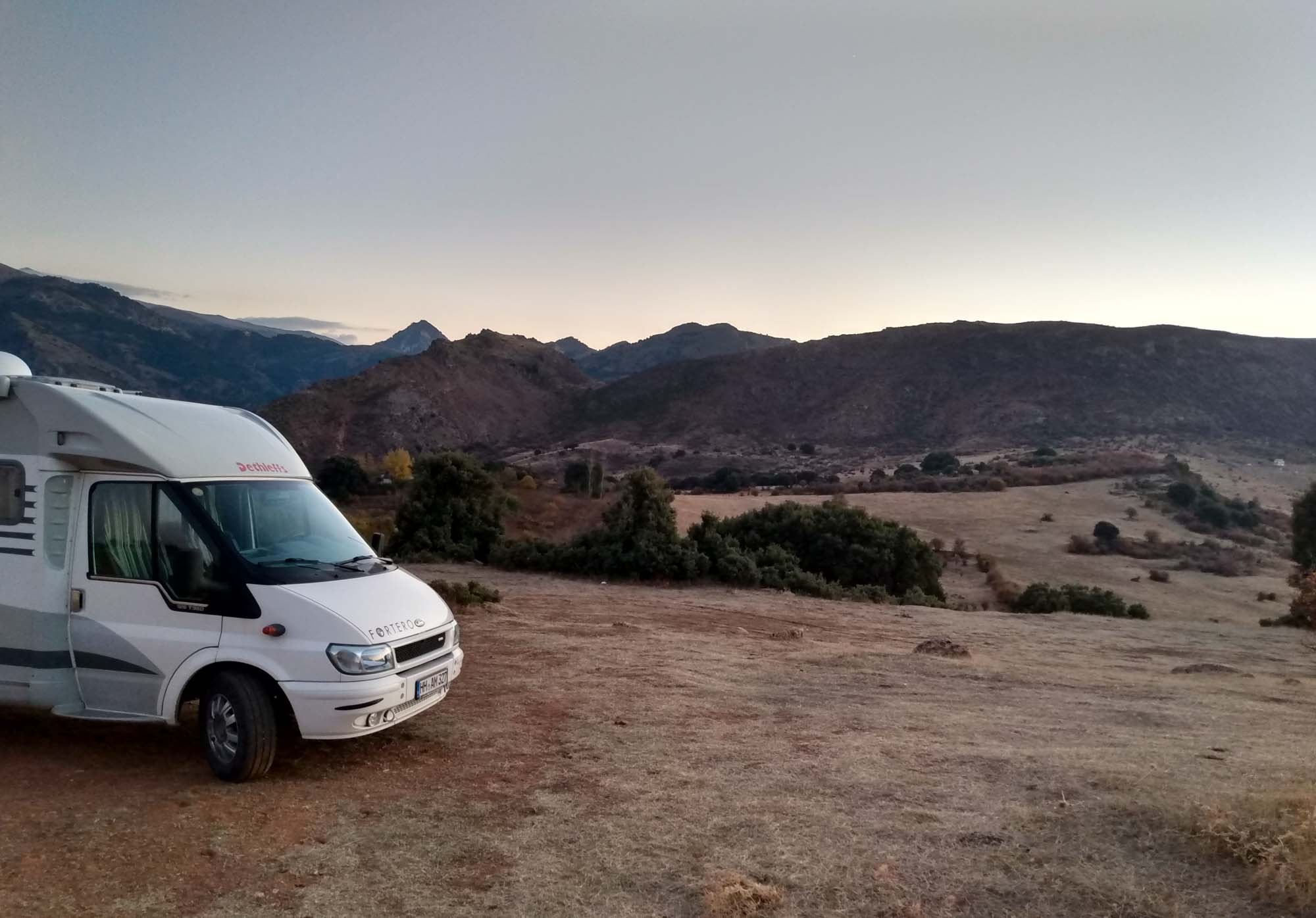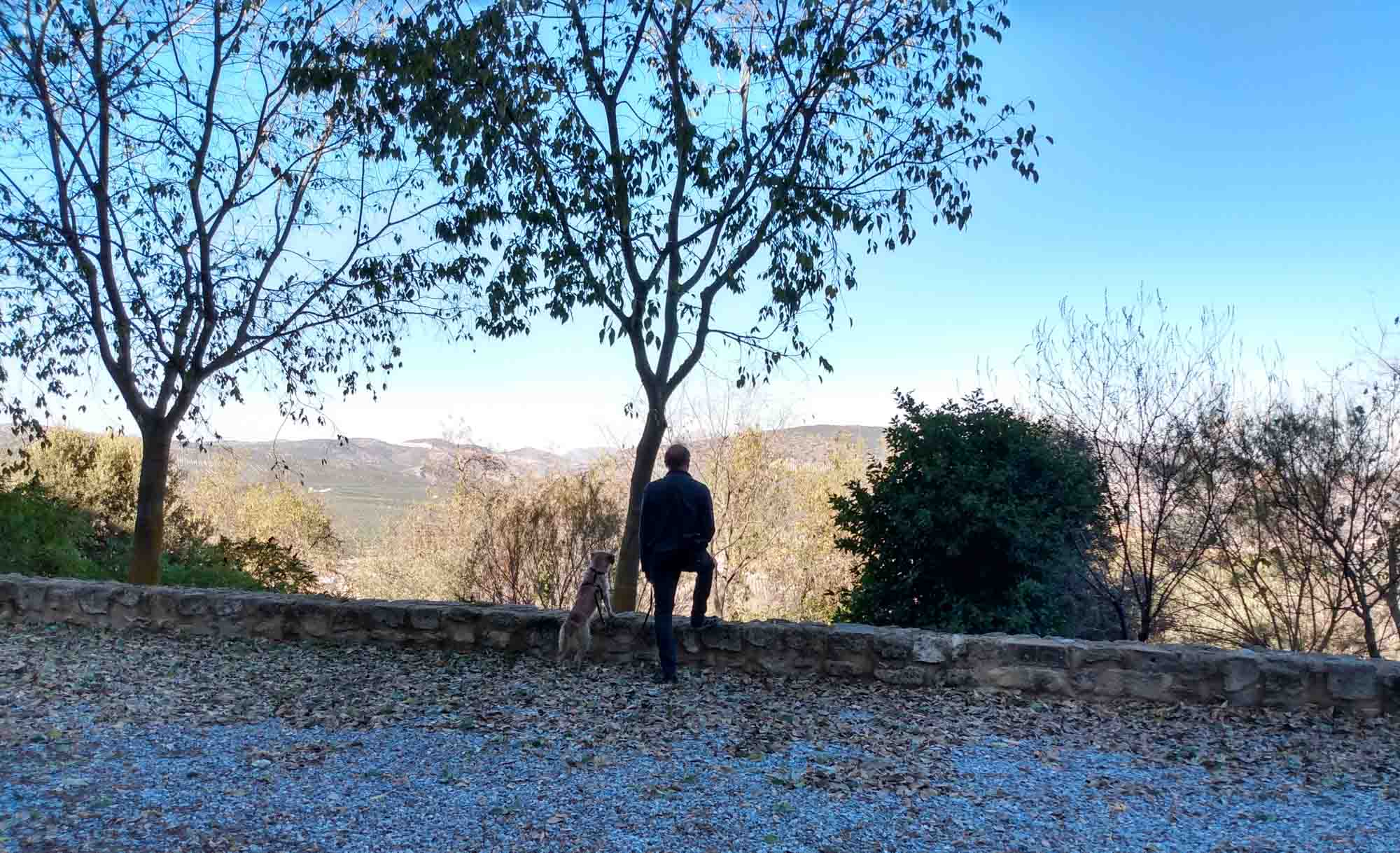Morgens wurden wir von Stimmen vor unserem Wagen geweckt. Auf Spanisch natürlich. Wir haben nur so viel verstanden, dass es um vier Wohnmobile geht, die hier stehen. Als wir aus dem Fenster schauten, sahen wir einen PKW zwischen uns und den Schweizern stehen und einen Mann, der aufgeregt telefonierte. Telefonierte er eventuell mit der Polizei? Wir zogen uns schnell an, aber als Michael nach draußen ging, um die Gasflasche abzustellen und dabei den Mann fragte, ob es ok sei, wenn wir hier stünden, erklärte der, dass die Kühe, die jetzt um uns herum standen, weggelaufen waren und er 17 km weiter wohnen würde. Er war überglücklich die Tiere wiedergefunden zu haben und hatte mit einem Kumpel telefoniert, der ihm helfen sollte, die Kühe wieder nach Hause zu treiben. Wir vermieden es zu erwähnen, dass wir sie gestern schon ein ganzen Stück in seine Richtung getrieben hatten. Wir fuhren trotzdem noch 2 km weiter zu einem Parkplatz einer Höhle, die um diese Zeit noch geschlossen war. Den Parkplatz und die angrenzende Parklandschaft hatten wir dann für uns. Nach dem obligatorischen Morgenspaziergang saßen wir draußen an einem Picknicktisch und frühstückten. Aneta nutzte die große Wiese und übte mit Berta das Apportieren ihres Tennisballs. Nach einem weiteren kurzen Spaziergang fuhren wir nach Alcala la Real. Oberhalb der Stadt steht das Fortaleza de la Motta, eine alte Festungsruine. Dort spazierten wir erst ein wenig um die Festung herum, bevor wir noch eine Drohnenaufnahme machten. Dann ging es weiter nach Granada. Wir fuhren quer durch die Stadt auf direktem Weg zur Alhambra. Die Parkplätze dort ließen wir liegen und fuhren zunächst an der Festung vorbei. Oberhalb der Anlage fanden wir an der schmalen Schotterstraße eine kleine Nische, wo wir unseren Wagen abstellen konnten. Wir spazierten quer durch den Olivenhain auf den Berg hinauf und konnten von der Anhöhe aus auf die Alhambra heruntersehen. Als wir weiterfuhren, hielten wir noch kurz beim Parkplatz und waren froh, dort nicht gestanden zu haben. 31 Euro wollten sie dort in der Nebensaison am Tag haben. In der Hauptsaison wäre es doppelt so viel gewesen. Für die Übernachtung fuhren wir nach Osten in die Sierra Nevada. Schnell schraubte sich die Straße auf 1.500 m und dort standen wir dann knapp unterhalb des Gipfels auf einer Wiese. Als Nachbarn hatten wir nur die Kühe mit ihren Glocken. Der abendliche Spaziergang mit Berta führten uns bis zum Gipfelkreuz und der Blick in die untergehende Sonne über die Sierra Nevada war einfach fantastisch. Auch Berta schien diesen Anblick zu genießen. Auf dem Rückweg, Berta lief wie immer frei, schaute sie zwar kurz auf die herannahenden Kühe, blieb aber diesmal bei Michael. Auch bei ihrem Abendessen ließ sie sich von den Kühen nicht stören. Danach ging es aber schnell wieder rein, denn es wurde so richtig kalt. Bei der letzten kleinen Runde um halb elf waren es bereits Minusgrade und danach sprang Berta so bereitwillig wie noch nie wieder ins Auto und machte es sich gleich auf ihrem Platz gemütlich.