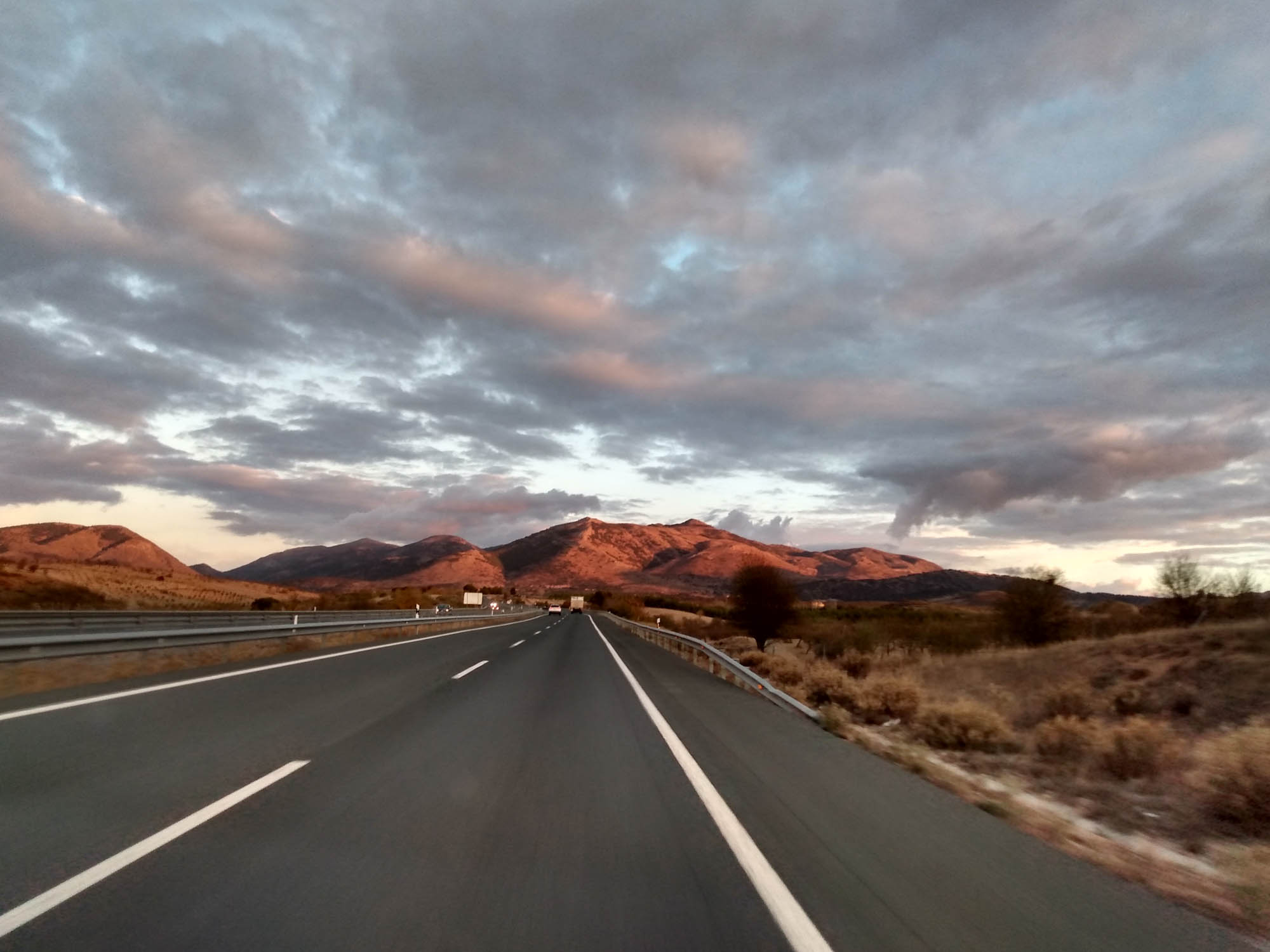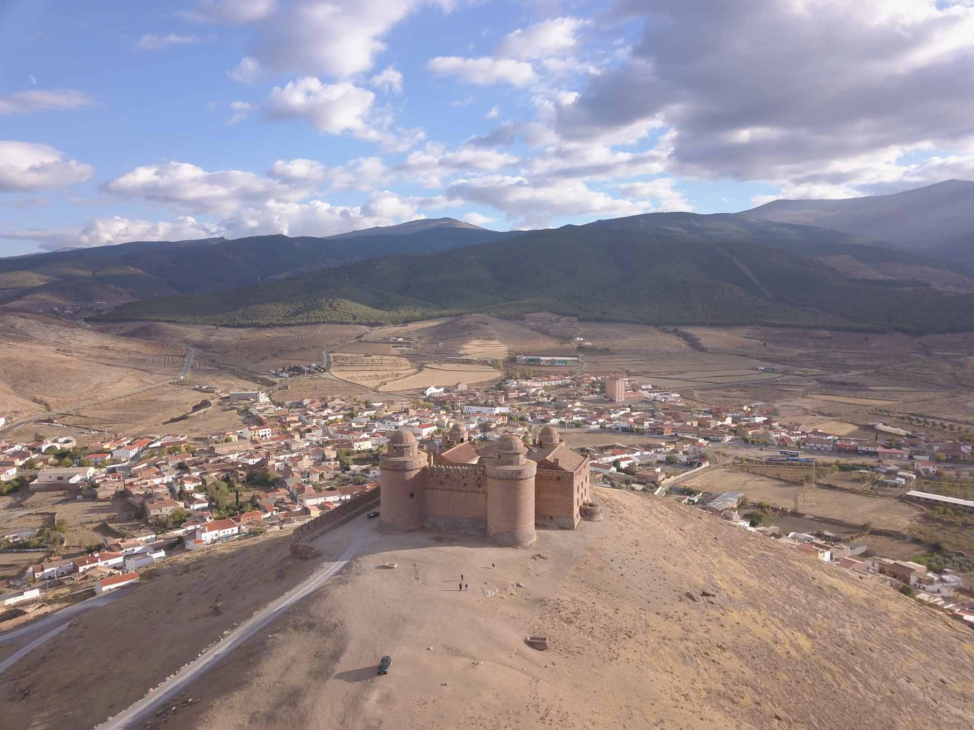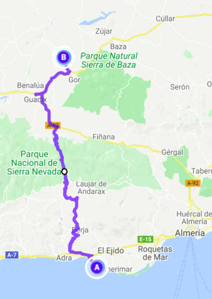 Am Morgen ging Michael mit Berta am Strand spazieren, während Aneta für beide das Frühstück zubereitete. Nach dem Essen fuhren wir nach El Ejido, um in einem Heimtiergeschäft noch eine lange Leine und ein Halsband für Berta zu kaufen. Den Laden wollte sie nicht betreten. Vermutlich wegen des Hundes, der zum Geschäft gehörte. Dieser war zwar sehr lieb, Berta respektierte aber offensichtlich sein Revier. Anschließend erledigten wir noch ein paar Einkäufe und fuhren dann nach Norden quer durch die Sierra Nevada. Am Pass Puerto De La Ragua auf 2000 m Höhe machten wir einen weiteren Spaziergang und erklommen dort einen Gipfel, von dem aus wir auf die nördlich gelegene Hochebene blicken konnten. Dann fuhren wir weiter bis nach La Calahorra. Dort liegt auf einer kleinen Anhöhe das Castillo de La Calahorra, das zwar geschlossen war, aber dennoch wunderbar als Kulisse für eine Drohenaufnahme diente. Aneta ging in der Zwischenzeit mit Berta spazieren. In Guadix fuhren wir noch eine Entsorgungsstation an, bevor wir uns auf die Suche nach einem Übernachtungsplatz machten. Der erste entpuppte sich als Feldweg, der wahrscheinlich ein Zufahrtsweg für ein Haus war. Also völlig ungeeignet. Also mussten wir weiter und kamen erst nach Sonnenuntergang beim nächsten Platz in der Nähe von Gorafe an. Hier konnen wir bei einem Nachtspaziergang im Mondschein die Reste alter Hühnengräber bestaunen. Berta kam in den Genuß der langen Leine und konnte so trotz Leine fast so laufen, als wäre sie ganz frei. Danach gab es für alle etwas zu essen und es dauerte nicht lange, bis erst unsere Kleine einschlief und etwas später auch wir müde im Bett verschwanden