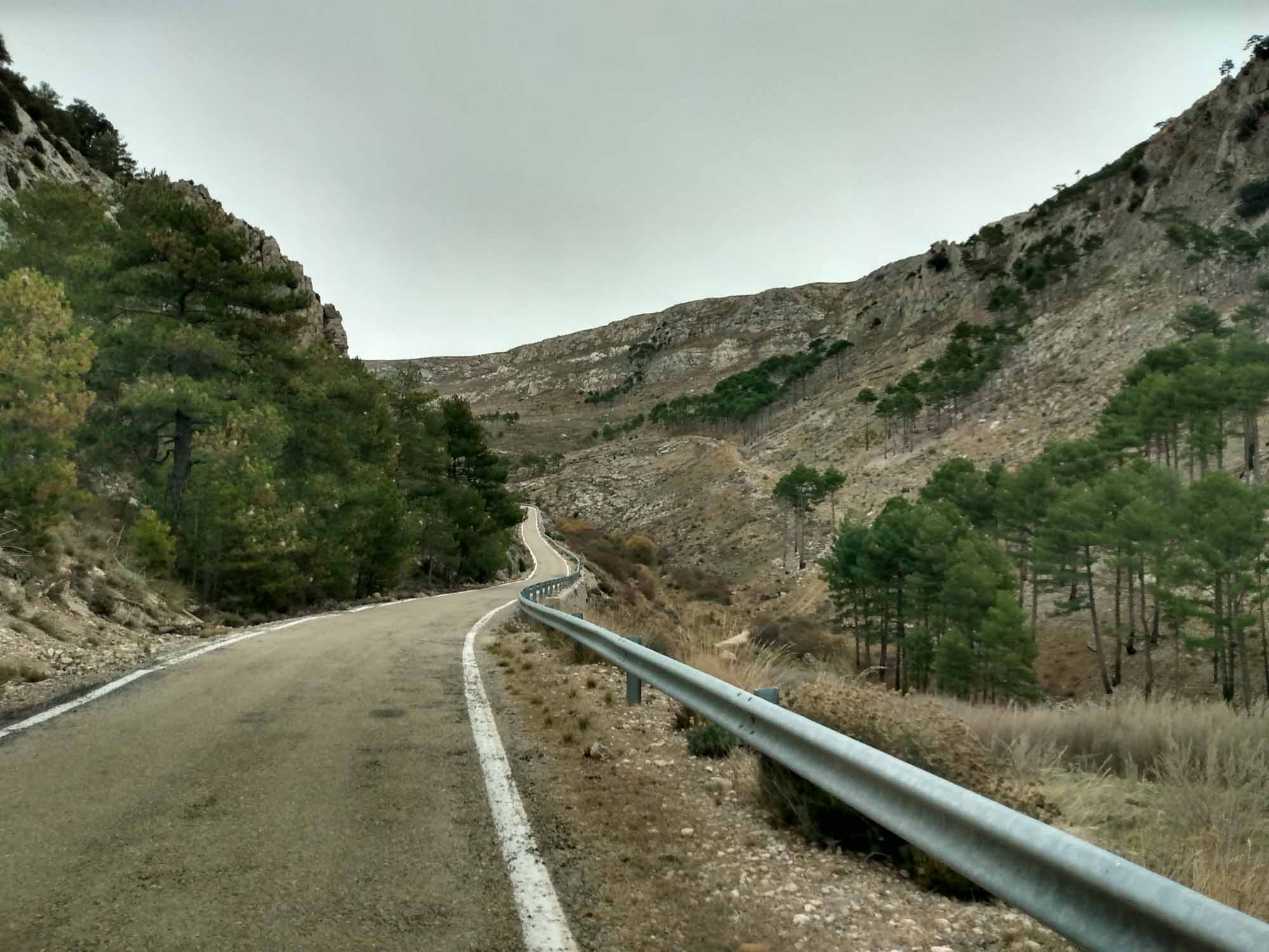 Inzwischen hat sich Berta an unsere Routine gewöhnt: Erst ein Morgenspaziergang, danach Frühstück, Wohnmobil fertig machen, einsteigen, hinlegen und losfahren. Alles ganz unkompliziert. Wir fuhren weiter durch die Gebirgslandschaft Cuenca Minerva und kamen dabei an der Ruine eines Wärmekraftwerks, dem Central térmica de Aliaga, vorbei. Nach einem Pass von nur noch 1.500 m kamen wir in die Region Andorra Sierra de Arcos, eine ebenso schöne und beeindruckende Landschaft. Später fuhren wir durch einen Canyon und testeten an zahlreichen Felsüberhängen, ob wir wirklich nicht höher als 3,10 m waren. Wir hatten richtig gemessen: es passte. In Alcañiz füllten wir unsere Gasflasche auf. In Anbetracht der kalten Nächte in den letzten Tagen, waren wir nicht allzu überrascht, dass sie nach nur 5 Tagen schon wieder fast leer war. Die Kathedrale der Stadt schauten wir uns nur im Vorbeifahren an. Vermutlich hätte sich ein Besuch aber gelohnt. Bereits von außen war die mittlerweile bekannte Mischung aus maurischen und christlichen Elementen zu sehen. Weiter ging es nach Caspe, wo wir noch einmal unser Trinkwasser auffüllten und dann weiter zu unserem Stellplatz auf der nördlichen Seite des Rio Ebro. Die Sonne schien heute leider nicht, der Himmel war vollständig bedeckt und es war auch nicht wirklich warm. Die Stühle holten wir nach einem ersten Erkundungsspaziergang trotzdem heraus und schauten auf das Wasser. Etwa einen Kilometer Flußabwärts gab es eine Staumauer. Aber auch hier war deutlich zu sehen, wie wenig Wasser derzeit vorhanden ist. Etliche Meter fehlten zur vermuteten Normalhöhe und viele muschelbedeckte Steine, bzw. solche die erkennbar eine Ewigkeit unter Wasser gewesen waren, lagen jetzt im Trockenen. Berta lief derweil herum, blieb aber immer in der Nähe. Der Abendspaziergang fiel dann etwas umfangreicher aus. Wir starteten am Flußufer wo Berta auf dem weichen Sand erstmal hin- und herjagte. Danach liefen wir über Felder, an einer Finca vorbei und Berta kletterte neben uns auf einige der Hügel. Dabei konnten wir auch das Rufen von Berta immer mal wieder (mit Erfolg) üben. Es war schon dunkel, als wir um kurz vor 18 Uhr wieder zurück beim Wohnmobil waren. Dort ruhten wir uns erst ein wenig aus, bevor es Abendbrot gab.