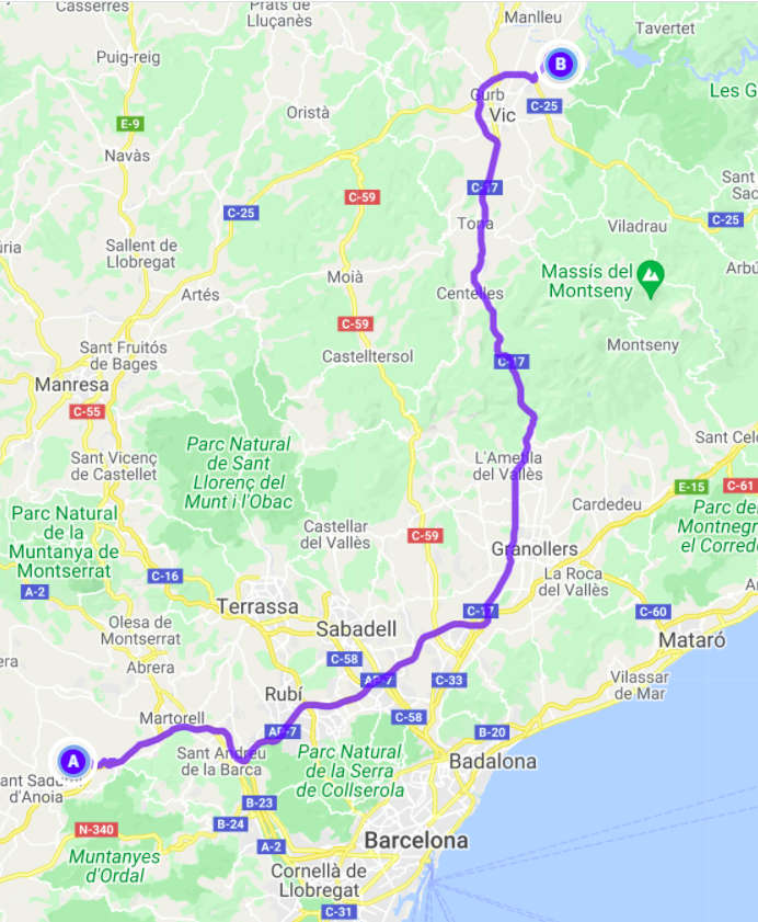 Morgens war es ziemlich kalt im Wohnmobil. Das Gas war in der Nacht leer gelaufen. Aber kein Problem: Schnell die Ersatzflasche angeschlossen und nach dem Morgenspaziergang war das Auto schon wieder warm. Gestern hatte Berta einige Spaziergänger und Radfahrer angebellt. Das müssen wir ihr unbedingt abgewöhnen. Und heute gab es Gelegenheit dazu. Beim Spaziergang kam uns ein Jogger entgegen. Berta kam kurz an die Leine und bekam nach der erfolgreichen Begegnung ein Leckerli. Kurz vor dem Losfahren kam noch ein Pärchen vorbei, das von unserem Platz aus Fotos der Umgebung machen wollte. Berta lief gerade frei herum und bellte sie erstmal an. Sie war sichtlich irritiert, als sie nicht gestreichelt wurde, als sie danach schwanzwedelnd zurückkam, sondern zunächst völlig ignoriert wurde. Danach gingen wir gemeinsam zu dem Pärchen hin, entschuldigten uns und erklärten ihnen (natürlich auf Spanisch), dass Berta neu sei und noch lernen müsse. Die beiden waren sehr verständnisvoll und waren perfekt für die Übung, da sie Berta einfach ignoriert hatten. Am Ende gab es natürlich noch ein Leckerli für das dann doch ruhige Verhalten. Danach fuhren wir in Richtung Vic. Unterwegs hielten wir häufiger, um die letzten Einkäufe in Spanien zu erledigen. Berta wartete jeweils geduldig im Auto. Natürlich haben wir auch die Gasflasche aufgefüllt und unterwegs noch einen kleinen Spaziergang gemacht. Kurz hinter Vic fuhren wir am Fluß Ter entlang bis wir - es war bereits stockdunkel - auf einem matschigen Platz direkt am Wasser unser Wohnmobil abstellten. Der Weg hinunter war steil und unten war es eng und extrem matschig. Hoffen wir mal, dass wir morgen irgendwie wenden können und aus dem Schlamm wieder herauskommen. Nach einem kleinen Abendspaziergang und dem Abendessen schlief unsere Kleine schnell ein. Wir suchten noch nach einem Plätzchen für den morgigen Tag und spielten noch etwas bevor auch wir uns in unsere Koje begaben.