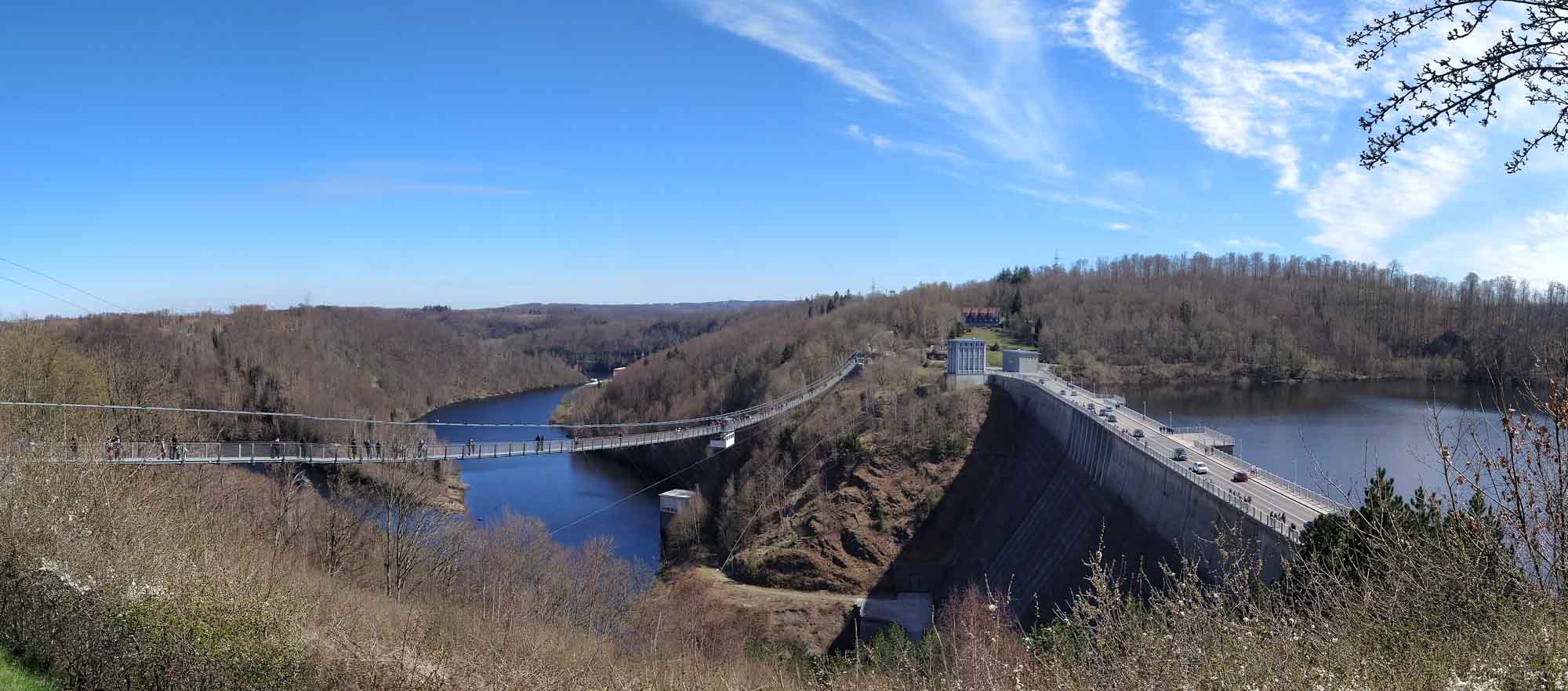 Wir sind sehr früh aufgewacht und freuten uns über einen tollen Morgenspaziergang durch den Wald. Abseits der Wege liefen wir durch den lichten Kiefernwald und bekamen sogar zwei Rehe zu sehen. Danach machten wir uns auf in Richtung Harz. Über Braunschweig und Wernigeroge, das wir vor zwei Jahren bereits erkundet hatten, fuhren wir zur Rapptalsperre. Dort gibt es auch parallel zur Straße eine Hängebrücke für Fußgänger. Ganz Wagemutige können auch an einer Seilrutsche auf die andere Seite fahren. Die Frage, ob es auch mit Hund möglich wäre, über die Hängebrücke zu gehen, stellte sich nicht: Die Warteschlange war so lang, dass es über einer Stunde gedauert hätte, bis wir hätten gehen können. So beließen wir es bei einem kleinen Spaziergang und dem Ausblick auf die beiden Brücken. Danach ging es weiter nach Nordhausen, wo wir zwei Campingstühle abholen konnten, die wir bei Ebay gekauft hatten. Unsere alten Faltstühle haben langsam ausgedient und die neuen sind doch deutlich bequemer, auch wenn es in unserer Heckgarage langsam etwas eng wird. Schließlich fuhren noch ein Stück weiter, wo wir beim "Rondell" einen schönen einsamen Platz gefunden haben. Beim Spaziergang durch den Wald, dessen Boden mit Bärlauch bedeckt war, sammelten wir ein paar Blätter, mit denen wir dann unsere Bratkartoffeln würzen konnten.