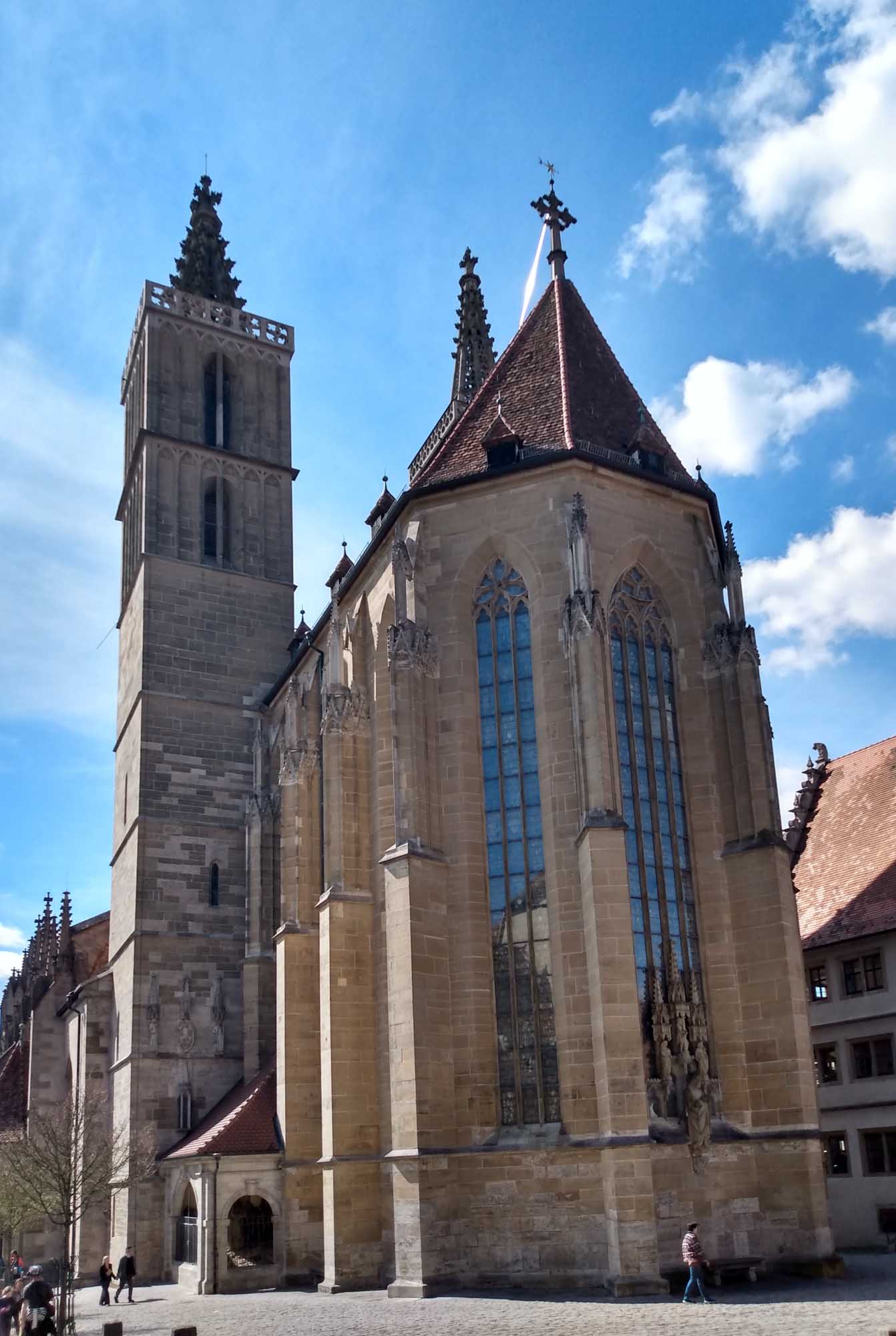 Morgens verabschiedeten wir uns mit einem einstündigen Spaziergang vom Thüringer Wald und machten uns weiter auf in Richtung Süden. Ursprünglich wollten wir bis nach Ulm. Nachdem uns Google aber etwas von 350 km und einer Fahrzeit von 5 1/2 Stunden erzählt hat, wollten wir zumindest heute nicht mehr dorthin. Stattdessen peilten wir Ansbach an, weil es dort in unserer allgemeinen Fahrtrichtung die nächste Filiale von Carglass gibt. Etwa ein Jahr hat unsere neue Windschutzscheibe immerhin durchgehalten bis sie gestern erneut von einem Steinchen getroffen wurde, den ein eiliger Thüringer hochgeworfen hatte, als er uns überholte. Dieses mal aber nicht im Sichtbereich des Fahrers, so dass es gute Chancen gibt, dass die Scheibe repariert werden kann und nicht erneut ausgetauscht werden muss. Zufällig unterhielten wir uns bei der Fahrt über den schönen Ort Rothenburg ob der Tauber und wie es der Zufall wollte, waren wir kurz davor. Also machten wir einen kleinen Schwenk und verlagerten unseren Nachmittagsspaziergang in die mittelalterliche Stadt mit der alten begehbaren Stadtmauer. Das Weihnachtsmuseum haben wir nicht besucht. Wir waren kurz nach Ostern noch nicht wieder in Weihnachtsstimmung. Aber die steilen Stufen auf die Stadtmauer, den engen Weg auf der Mauer und natürlich den noch viel steileren Abstieg ließen wir uns nicht entgehen. Danach fuhren wir noch etwa 20 Minuten in Richtung Ansbach zu unserem nächsten Stellplatz. Einem sonnigen Plätzchen an zwei kleinen künstlichen Bade- und Angelseen. Vor dem Abendessen machten wir noch einen Spaziergang und genossen noch ein wenig die letzten Sonnenstrahlen, bevor wir uns zum Abendbrot in unseren Forti verzogen.
