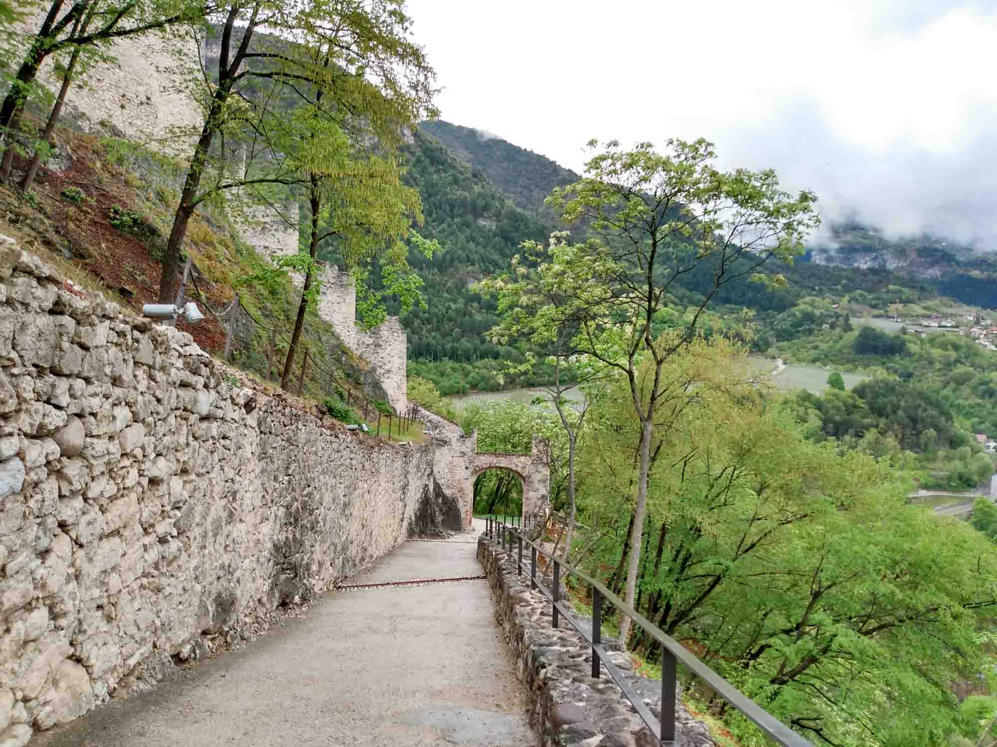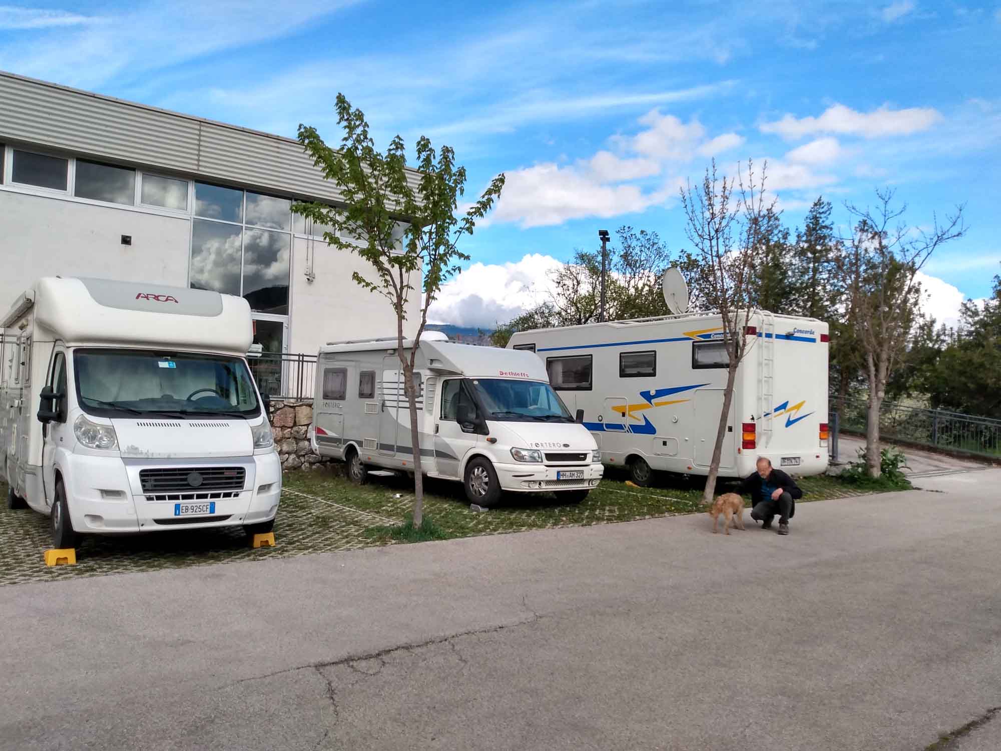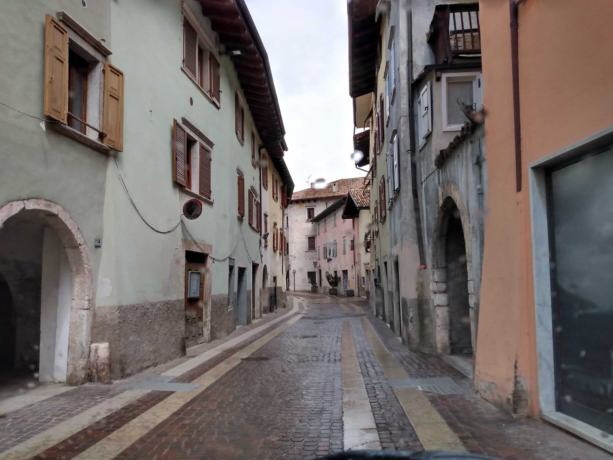 Der Wetterbericht hatte für die Nacht Regen vorhergesagt. Dachten wir jedenfalls. Aber was passiert mit Wasser, wenn es kalt wird? Genau: Als wir morgens aufwachten, sahen wir dass wir hoch in den Bergen eingeschneit waren. Ein wenig Gedanken machten wir uns schon über die steile enge Abfahrt, die wir gestern hochgekommen waren. Aber zunächst genossen wir den herrlich knirschenden Schnee bei einem frühmorgendlichen Spaziergang durch die Berge. Bären haben wir nicht gesehen, obwohl es hier ca. 90 Braunbären geben soll. Aber bei den Spuren, die durch den frischen Neuschnee gingen, war neben Vögeln, Rehen, Kaninchen auch ein kleiner Bär dabei. Den Vormittag verbrachten wir im Wohnmobil und schauten uns die vorbeiziehenden Nebelschwaden an. Und so ganz allmählich taute der Schnee ab und das Gras der Wiesen kam wieder durch. Gegen Mittag machten wir uns dann auf die Abfahrt, die dann auch völlig problemlos war. Als erstes fuhren wir zum Castel Beseno bei Besenello. Dort machten wir einen kleinen Spaziergang zu der großen Burg aus dem 16. Jahrhundert. Ein Drohnenflug war leider nicht möglich. Zu viele Besucher und Drohnen waren explizit untersagt. Unten im Tal war es sehr viel wärmer als auf dem Berg und auch die Sonne schien wieder. Wir versuchten südlich von Volano zwei Plätze anzufahren, auf denen wir vielleicht hätten übernachten können. Aber die extrem kleinen, steilen und leider auch sehr übergangslos steil werdenden Straßen machten uns das Erreichen unmöglich. So entschieden wir uns in Frenten einen kostenlosen Wohnmobilstellplatz anzufahren. Dort würden wir sowohl unser schmutziges Wasser loswerden, also auch neues Wasser bekommen. Die Fahrt dorthin war erfreulich einfach und absolut perfekt ausgeschildert. Mehrmals wollte uns Google wieder auf irgendwelche "Abkürzungen" schicken, die sich dann als schwierig bis unmöglich herausstellen würden. Wir folgten aber einfach den Schildern und kamen auf einem kleinen aber recht hübschen Platz an, wo wir uns zwischen zwei andere Wohnmobile stellten. Die Tür konnten wir endlich wieder offen lassen und Berta verbrachte den Nachmittag vor der Tür auf ihrer Decke. Auch wir machten es uns gemütlich und freuten uns mal wieder auf eine warme Dusche.